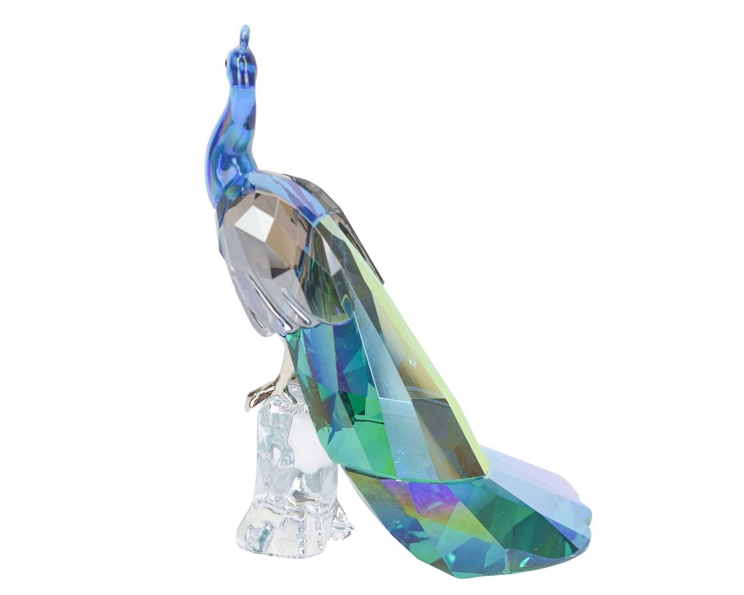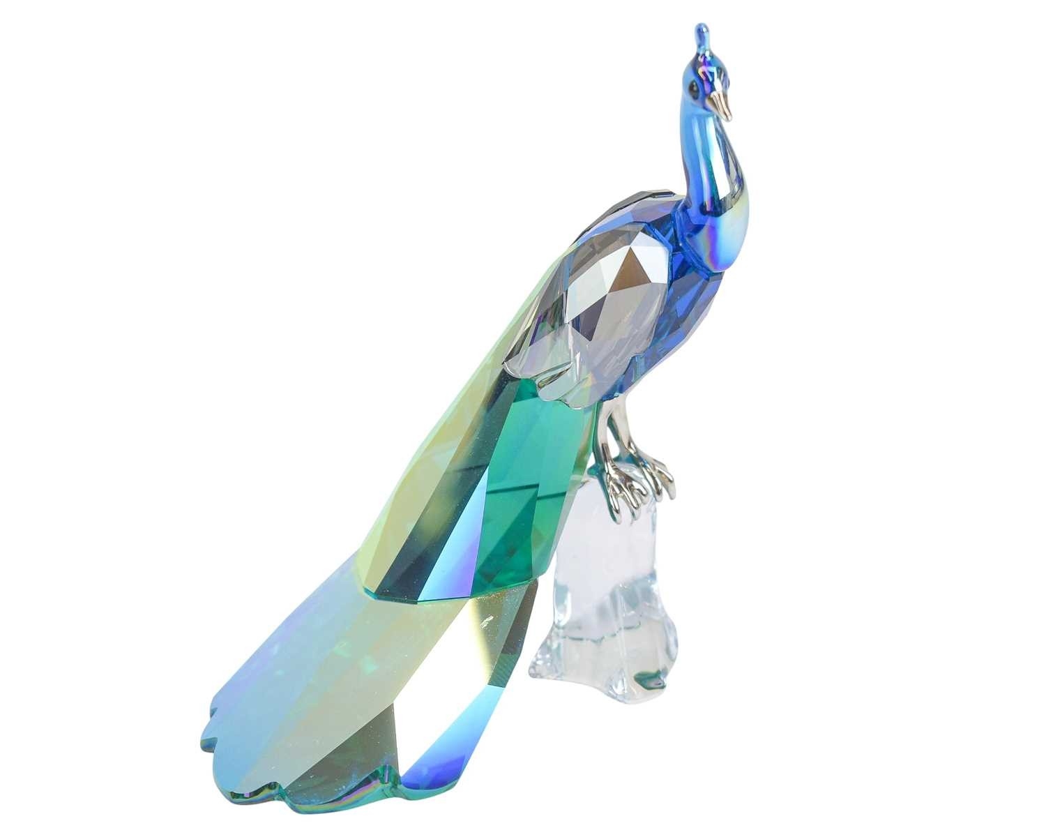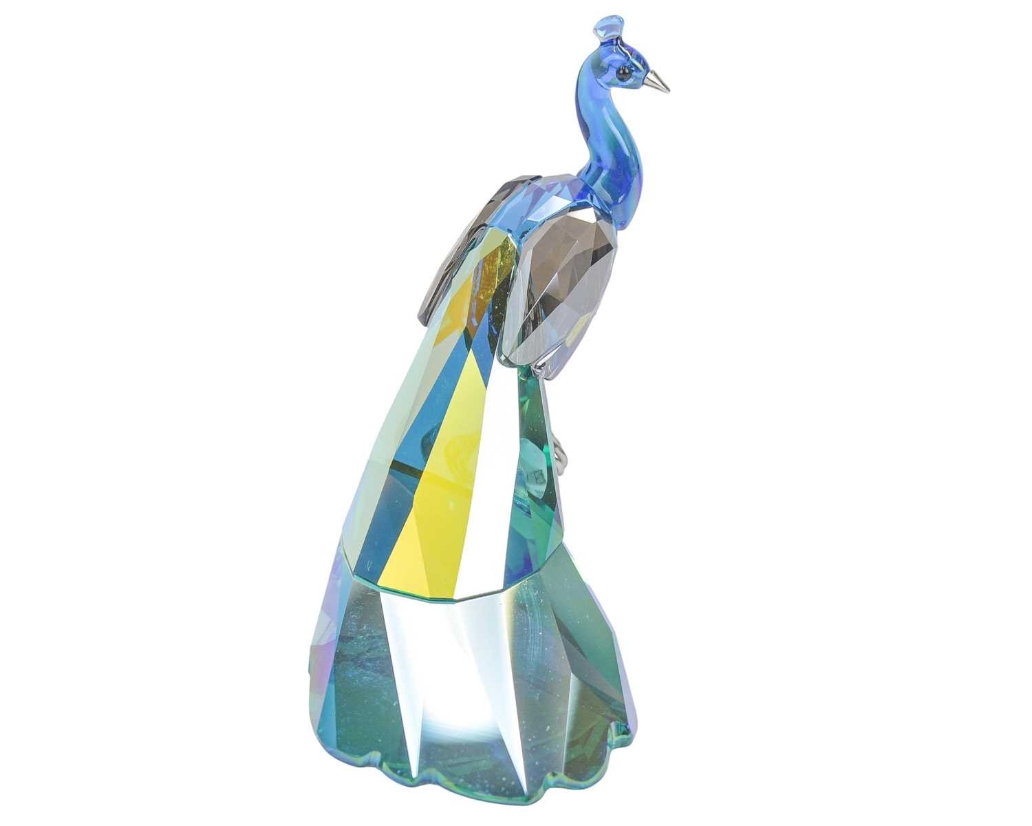 A Swarovski Crystal peacock. Designed by Elisabeth Adamer for the Swarovski Crystal Society (2013 Annual Edition). Etched Swarovski swan backstamp to base. Height 7cm. Boxed. Please note: All proceeds from the sale of this item to benefit The Friends of the Royal Cornwall Hospital volunteer charity. There are no condition issues.