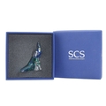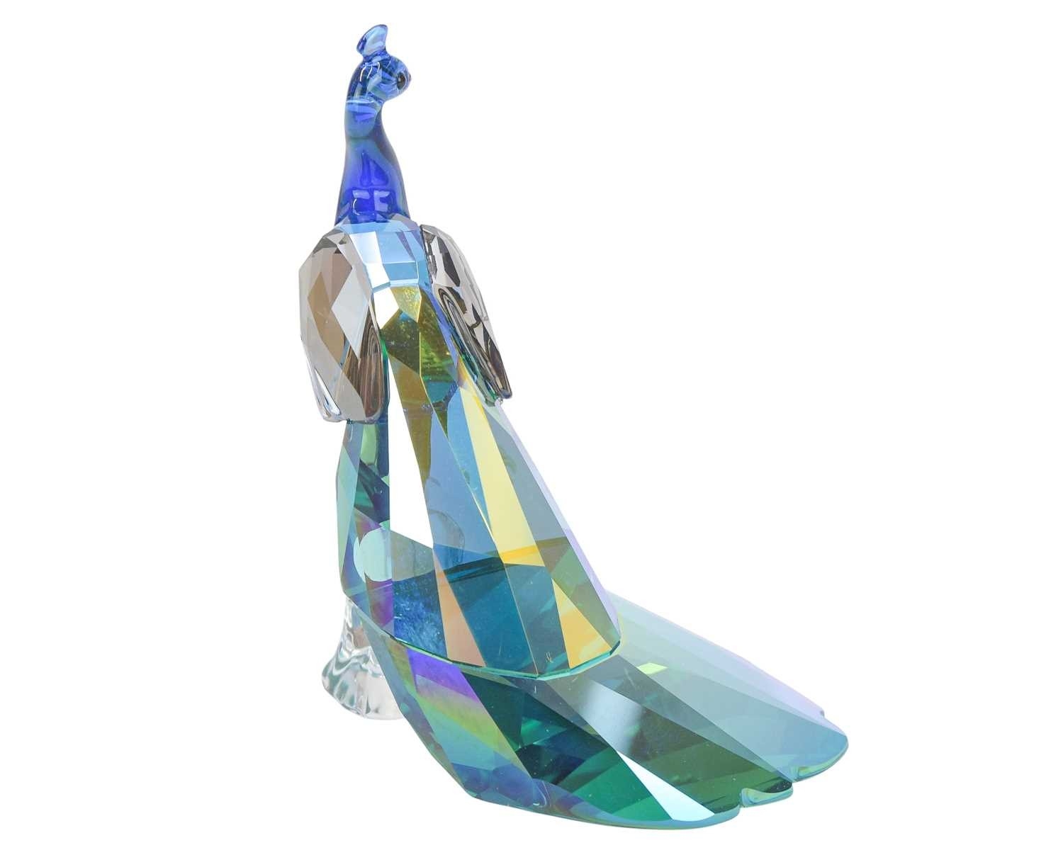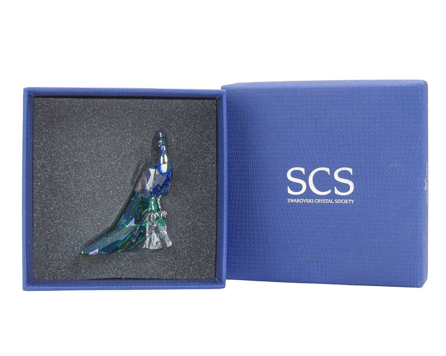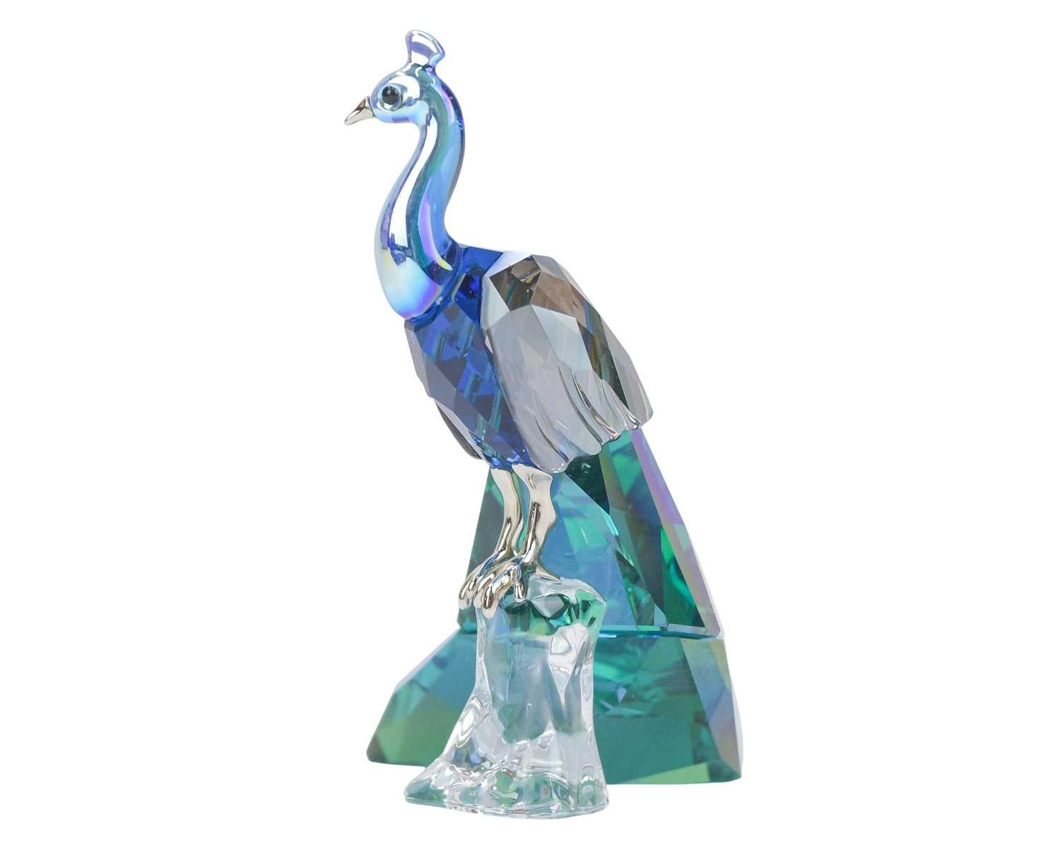 A Swarovski Crystal peacock. Designed by Elisabeth Adamer for the Swarovski Crystal Society (2013 Annual Edition). Etched Swarovski swan backstamp to base. Height 7cm. Boxed. Please note: All proceeds from the sale of this item to benefit The Friends of the Royal Cornwall Hospital volunteer charity. There are no condition issues.