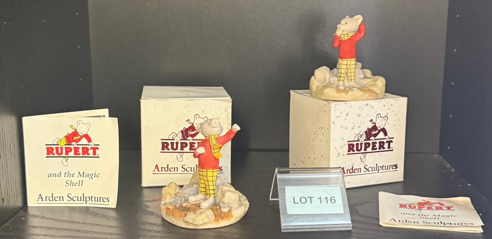 Two Rupert the Bear Arden Sculptures with original box and artist signed card "Rupert Puzzled" Rm004 & "Voice From Air" RM005