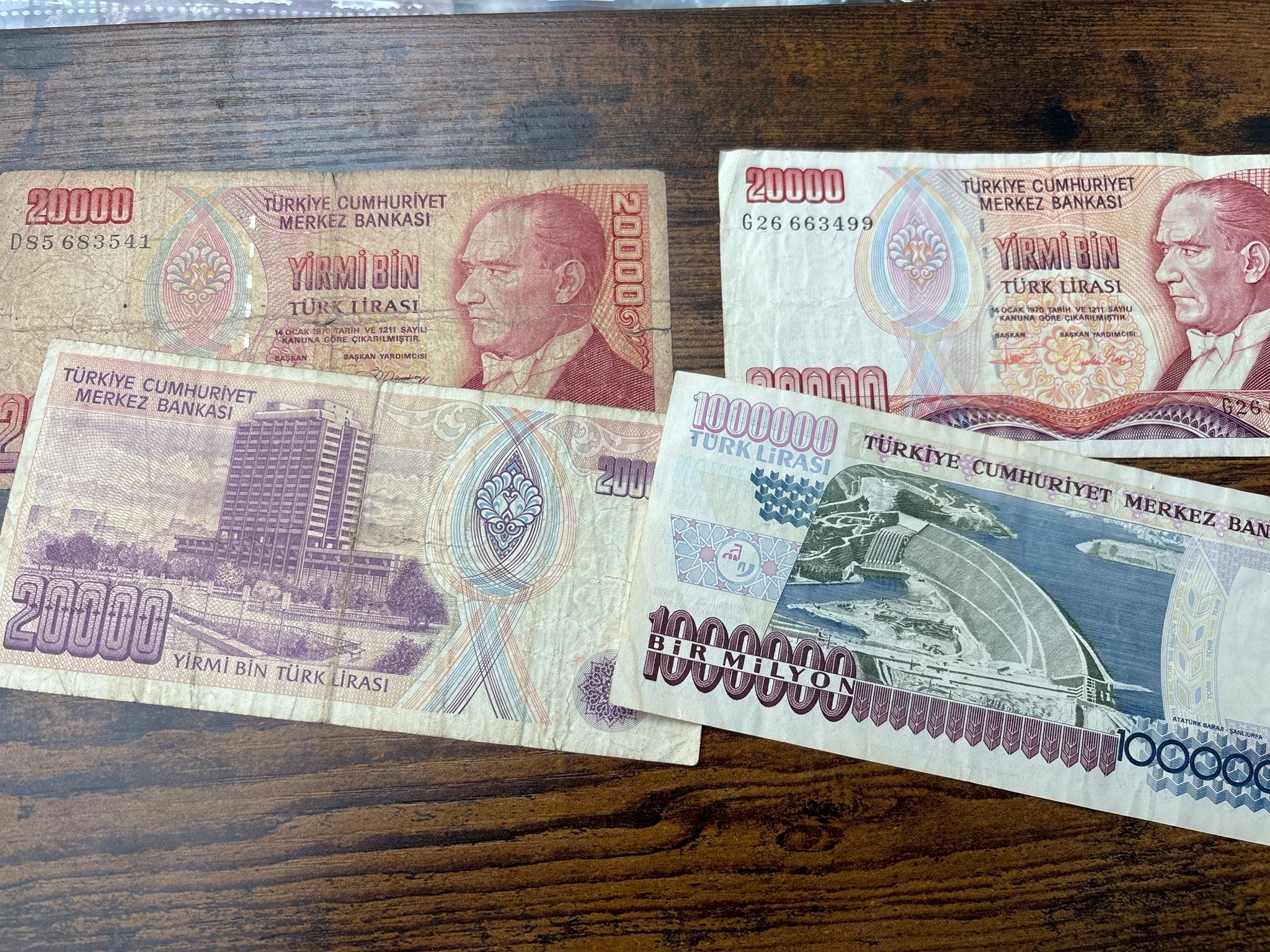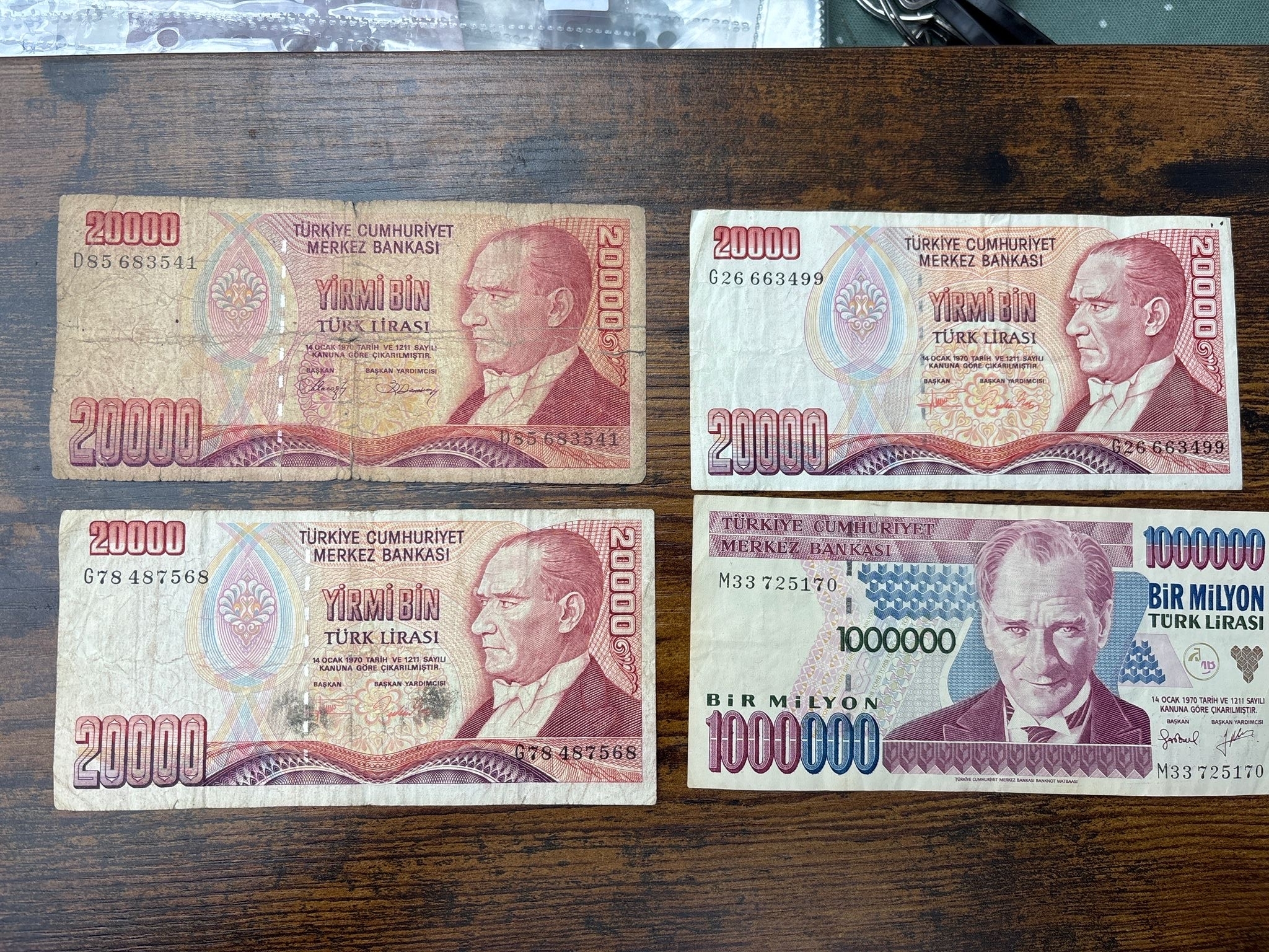Turkey Banknote Collection – 4 High Denomination Notes (200,000 & 1,000,000 Lira) Mixed group of 4 Turkish banknotes featuring the classic Mustafa Kemal Atatürk portrait and striking high-denomination designs from the pre-revaluation era. Includes: • 3 × 200,000 Lira • 1 × 1,000,000 Lira A great example of inflation-era currency, popular with world banknote collectors and ideal as a starter or filler lot.