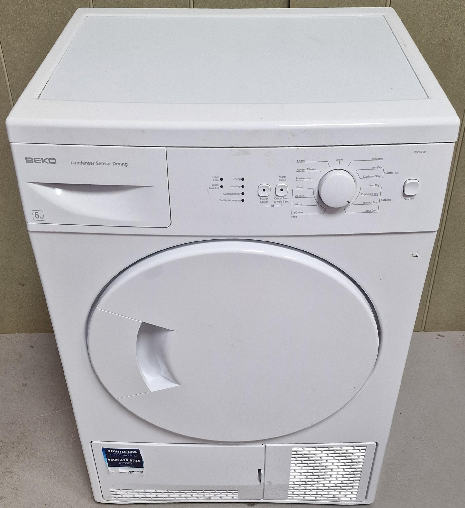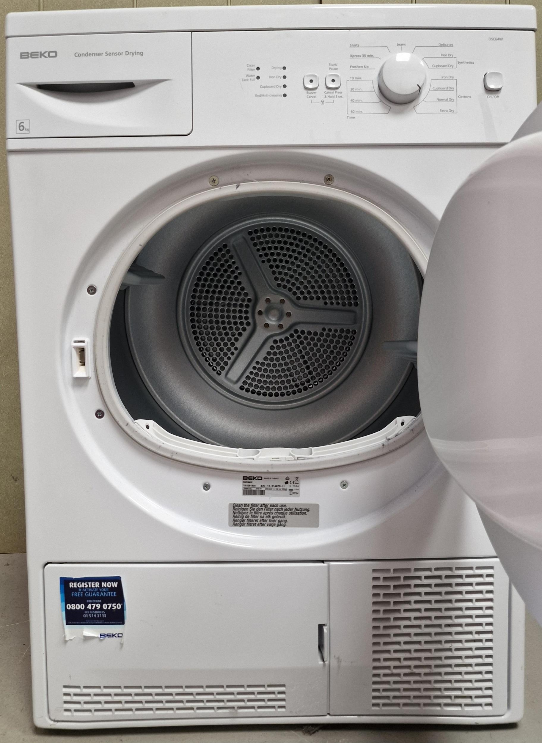 A 6kg Beko condenser dryer, model no.DSC64W. PAT test pass & functionality test indicates in working order. Dimensions(cm) H85, W60, D55.