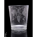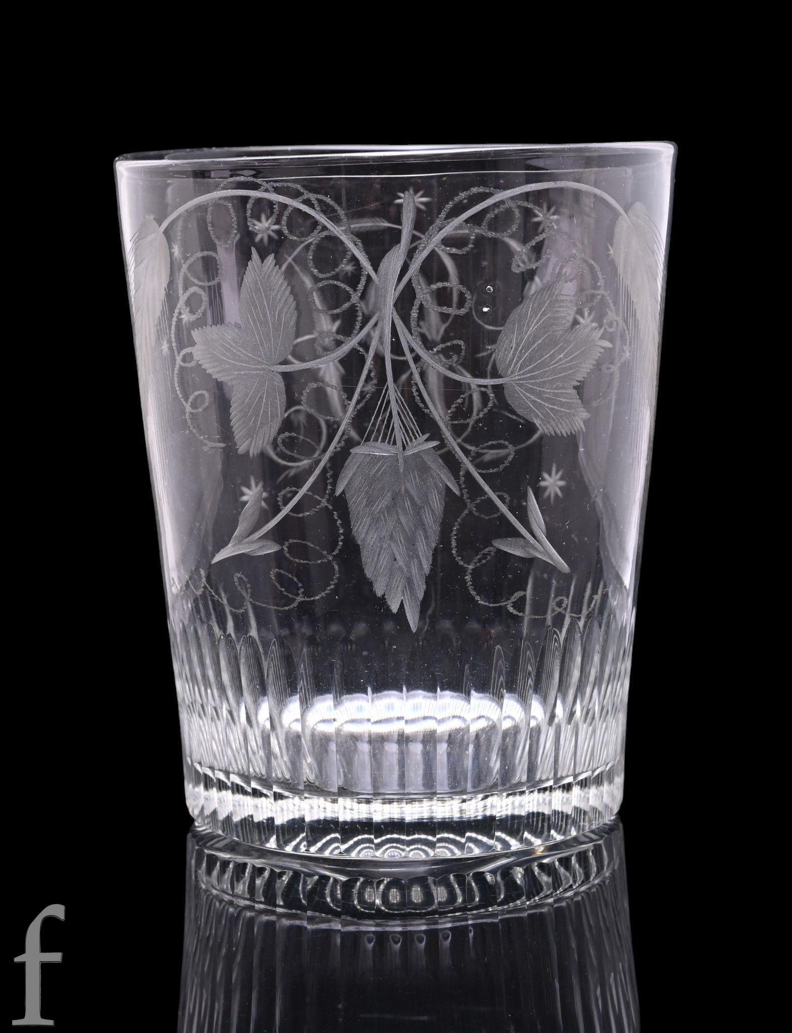 An early 19th Century ale tumbler, of flared cylinder form, basal mitre cut, engraved hop and barley sprigs and 'PB' monogram, height 12.5cm.