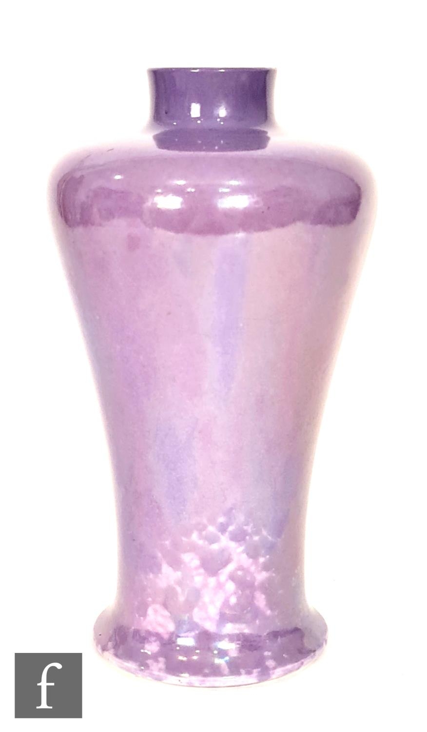 Ruskin Pottery - A vase of high shouldered tapering form decorated in an all over lavender lustre, impressed mark and dated 1916, height 25cm, restored and drilled for a lamp base fitting.
