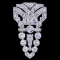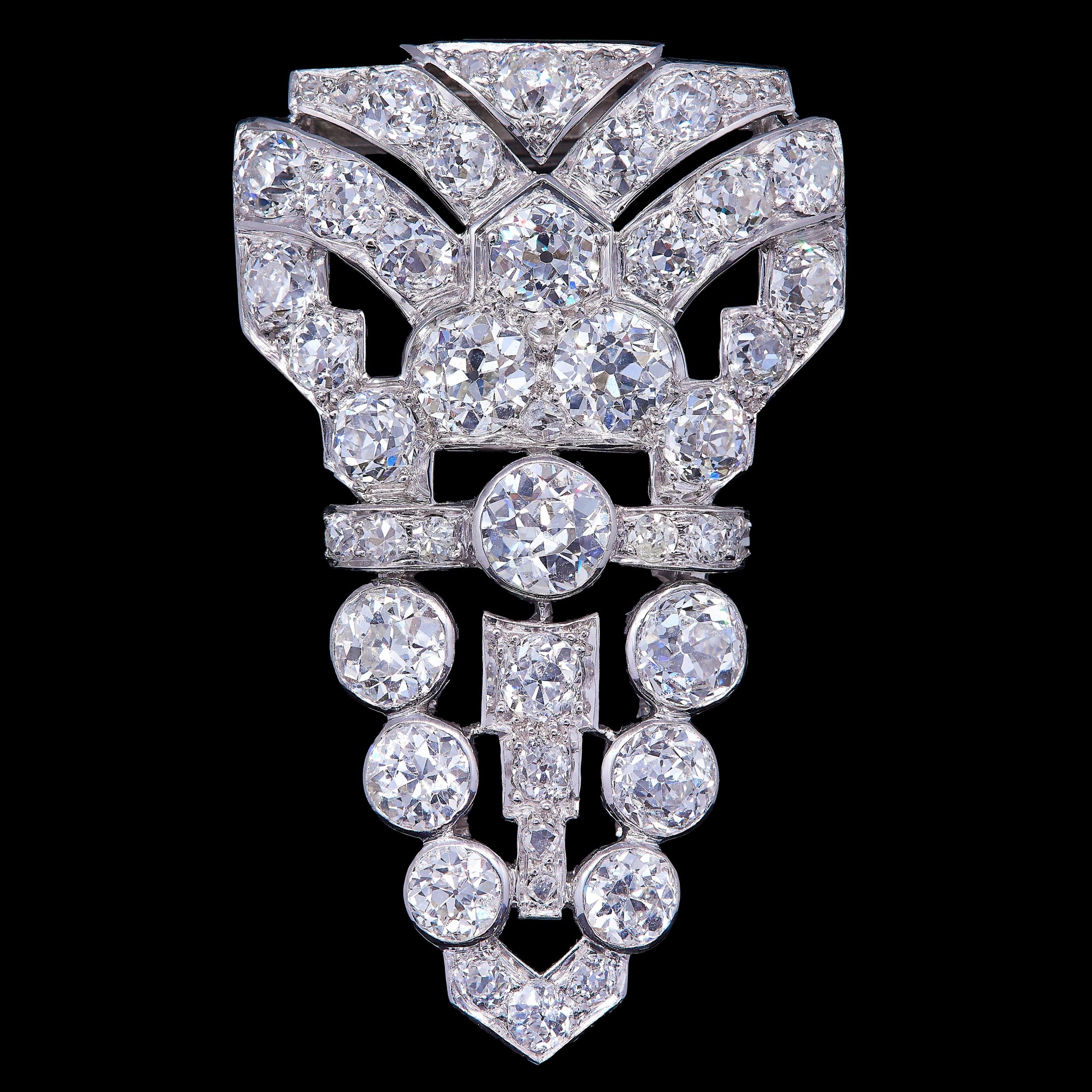 IMPORTANT DIAMOND CLIP BROOCH, of stylized elongated triangular design. Set with old cut diamonds, accentuated with rose cut diamonds, totalling approx. 6.20 ct. L. 3.9 cm. W. 2.3 cm. 16.2 grams. With fitted box.