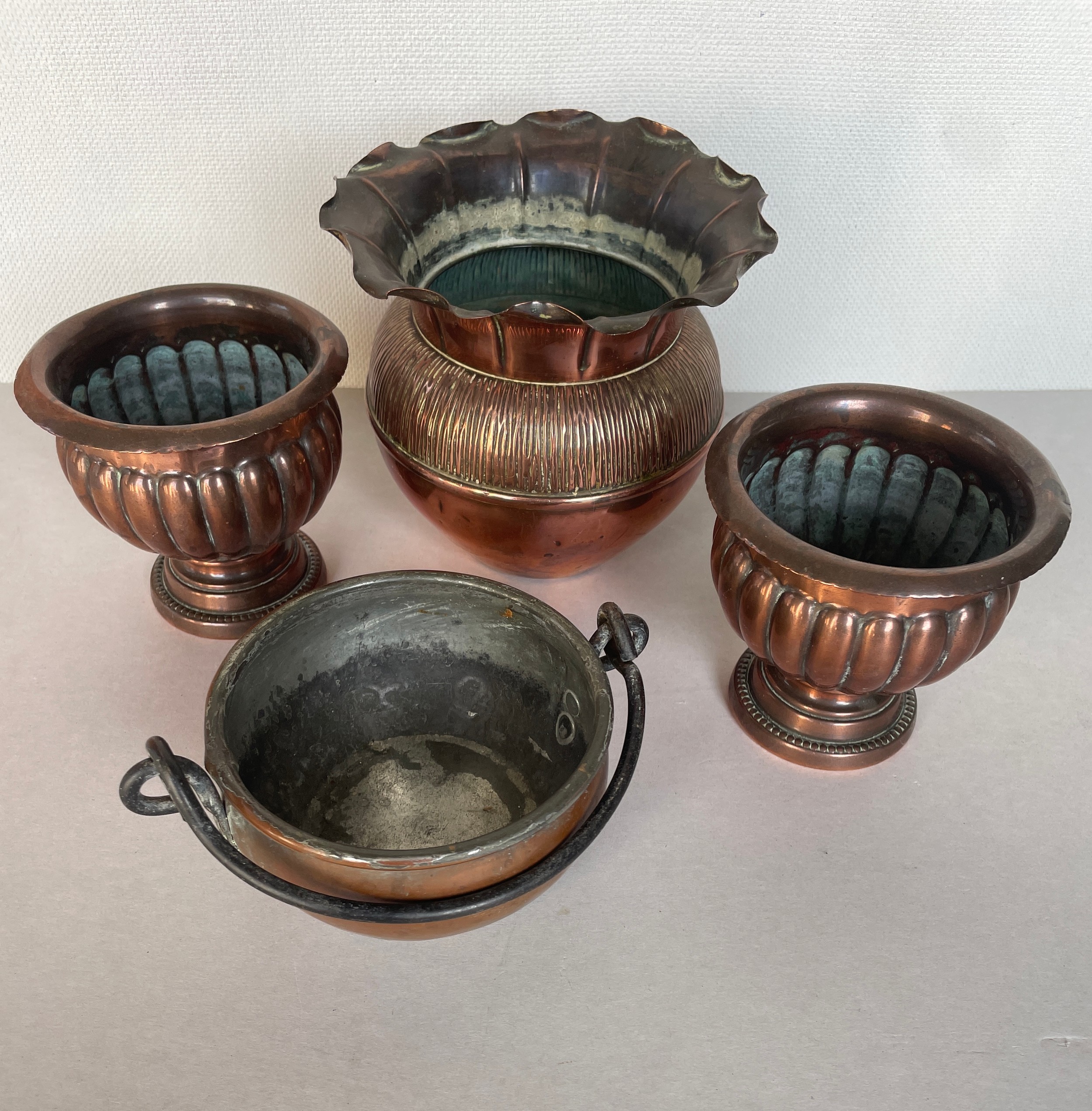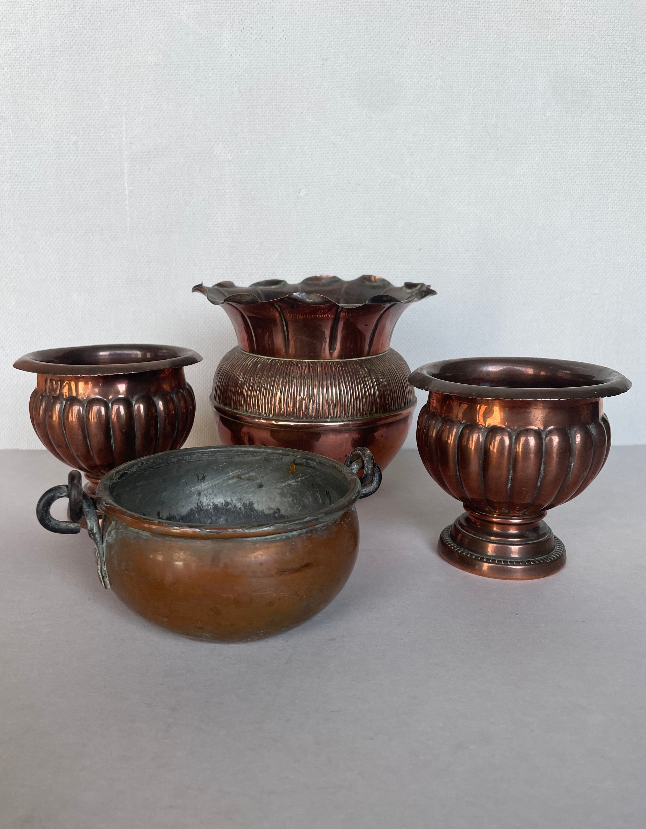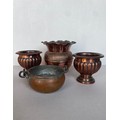 Four copper containers including urns and vase