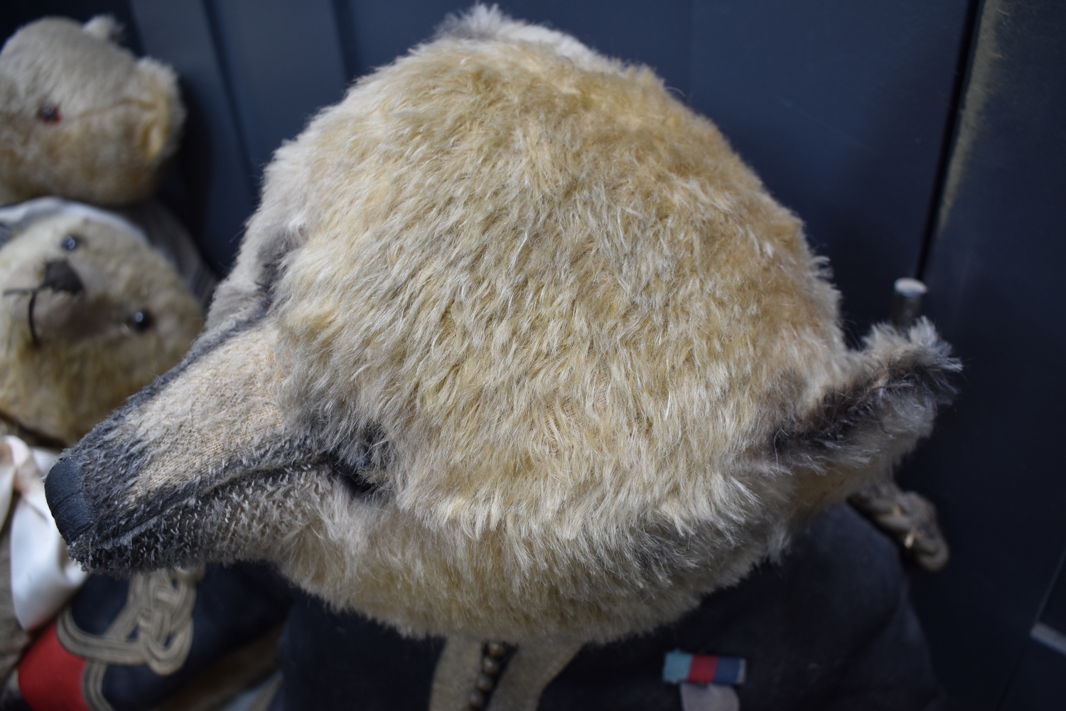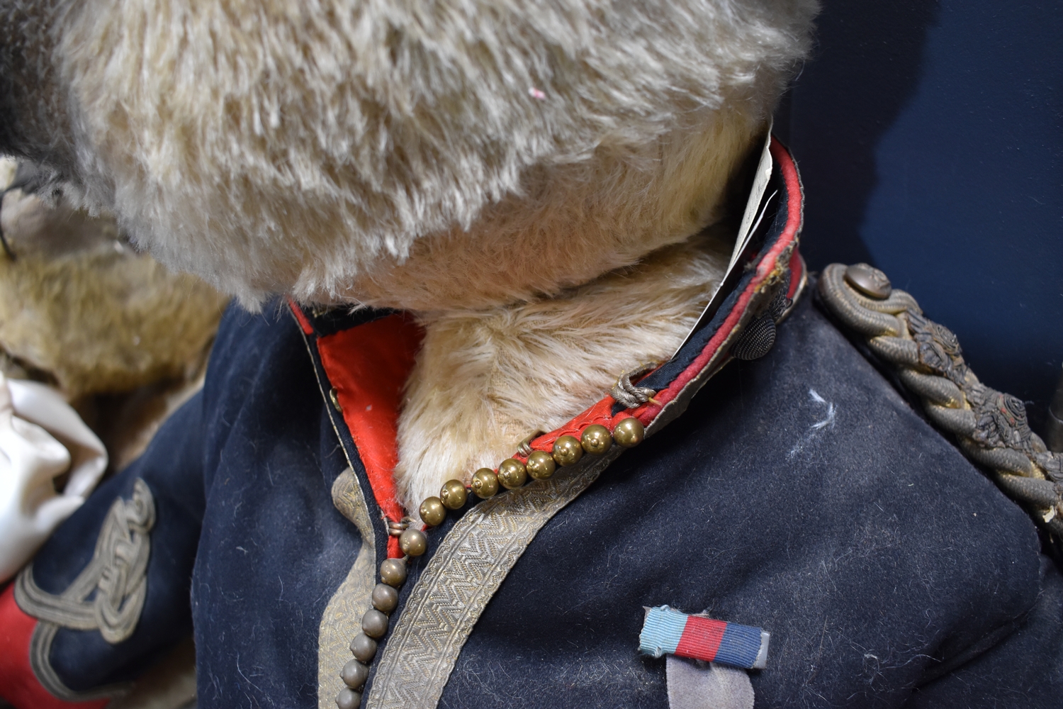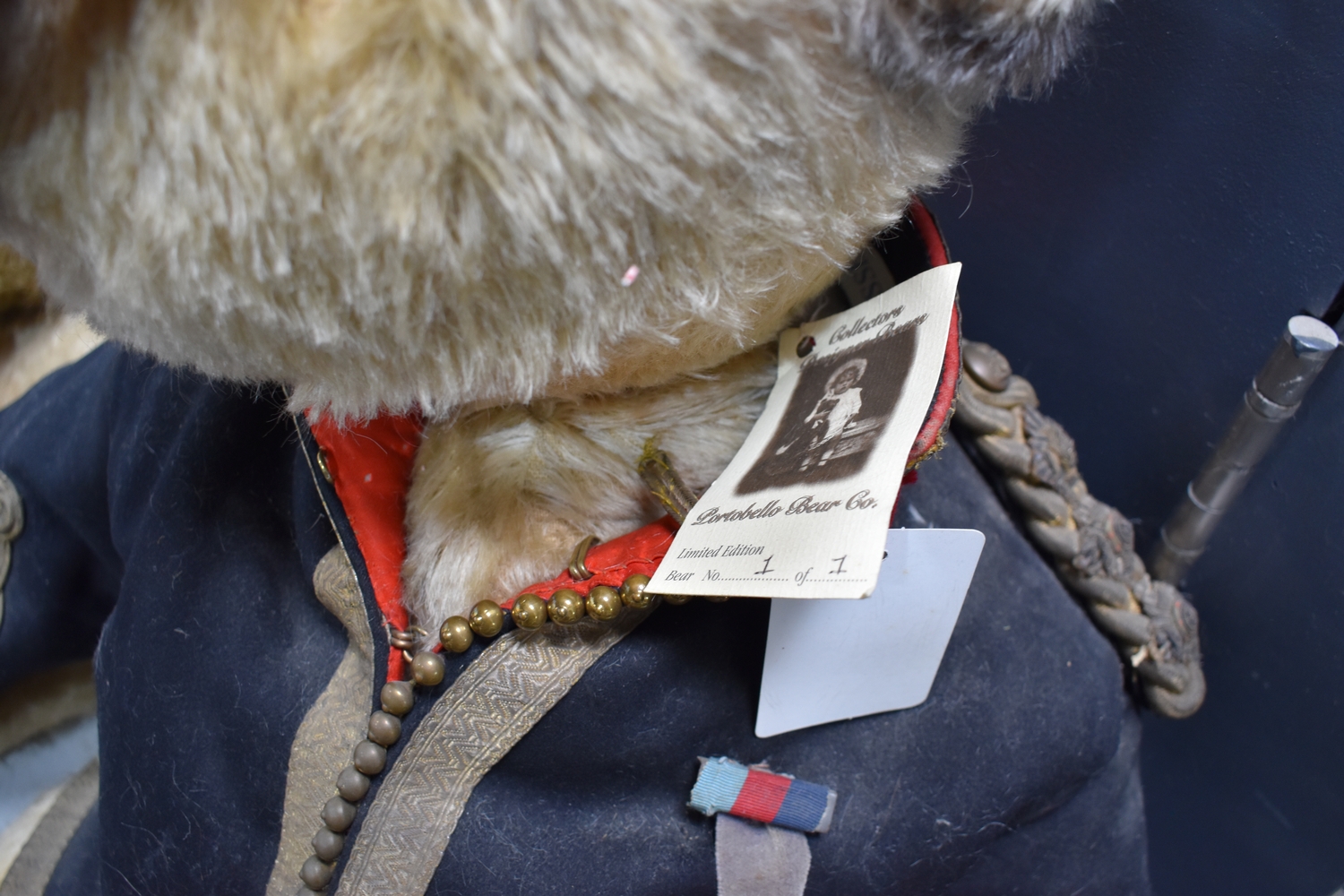 A large Portobello Bear Co. Limited Edition 1 of 1 bear named Lord Rossetti, Collectors Designer Bears, with original tag, wearing military uniform, 75cm long.