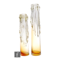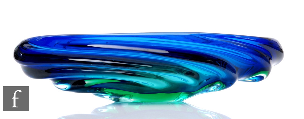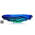 Jaroslav Beranek - Skrdlovice Glassworks - A large mid 20th Century Czech Andromeda glass bowl, of oval wrythen form with spiral fluted body in clear glass over a graduated blue to green interior, width 41cm.