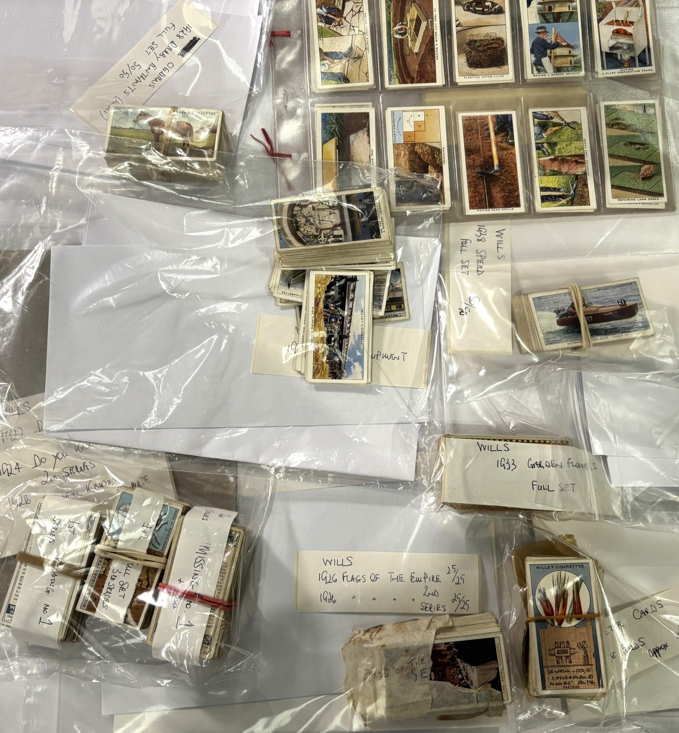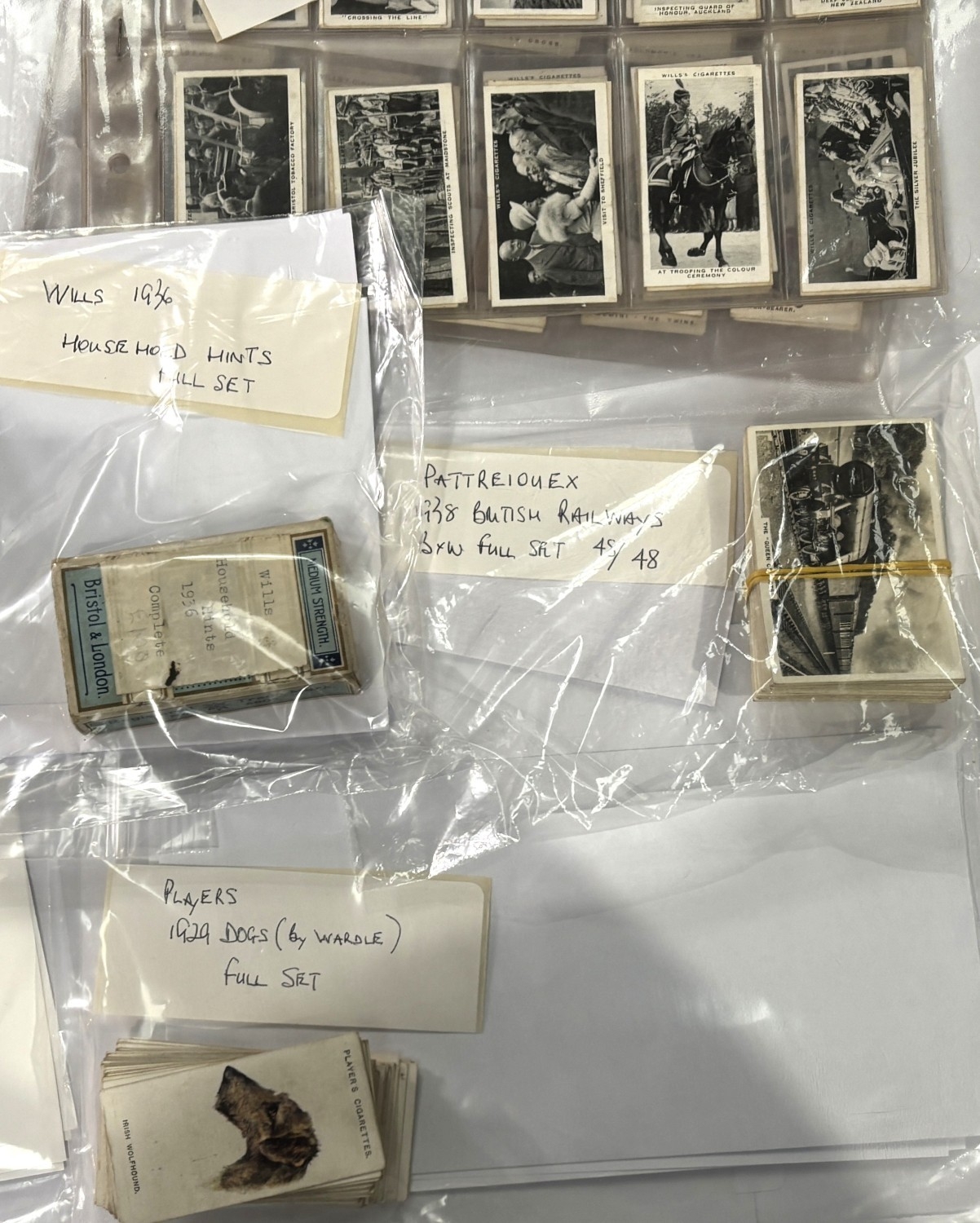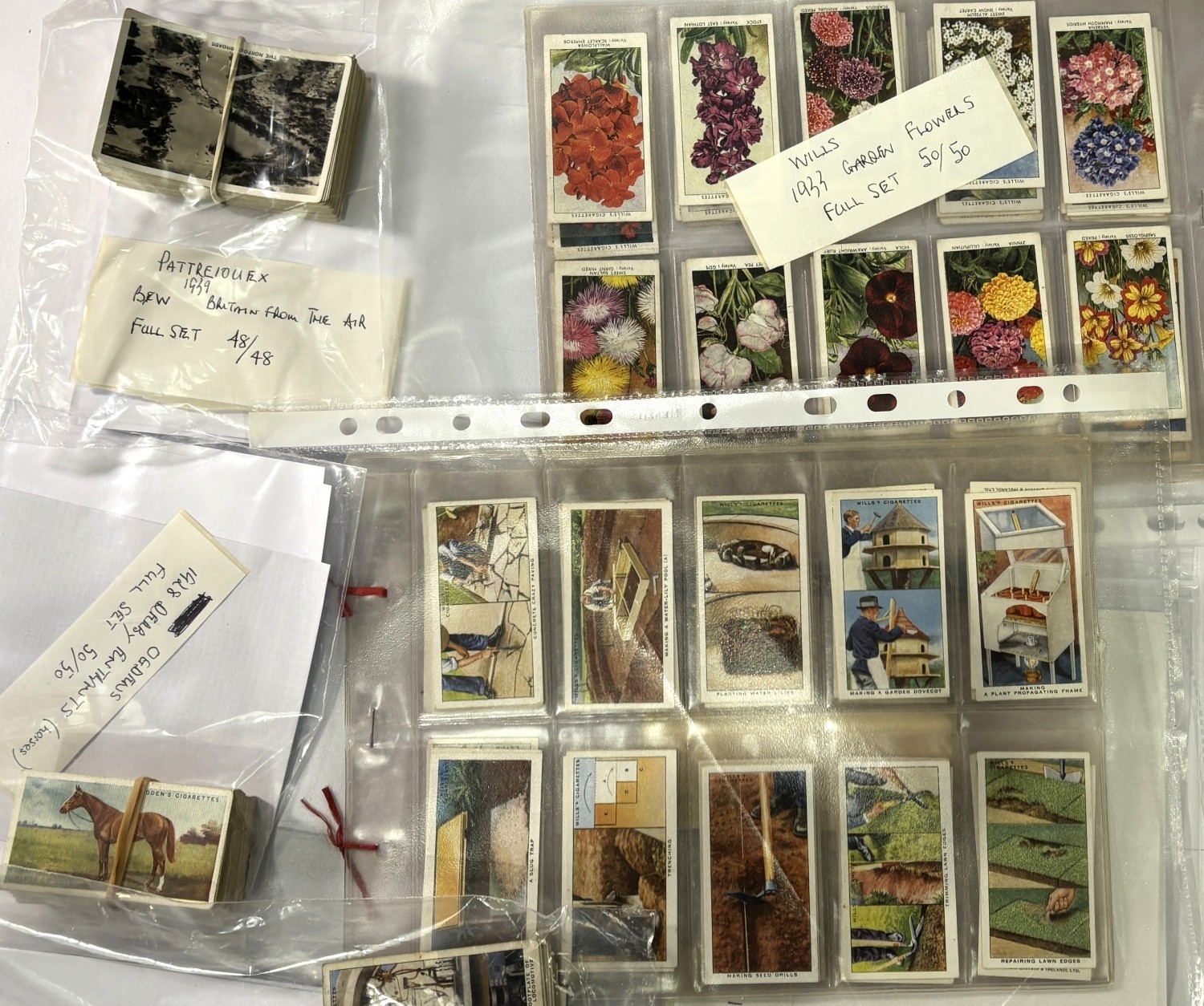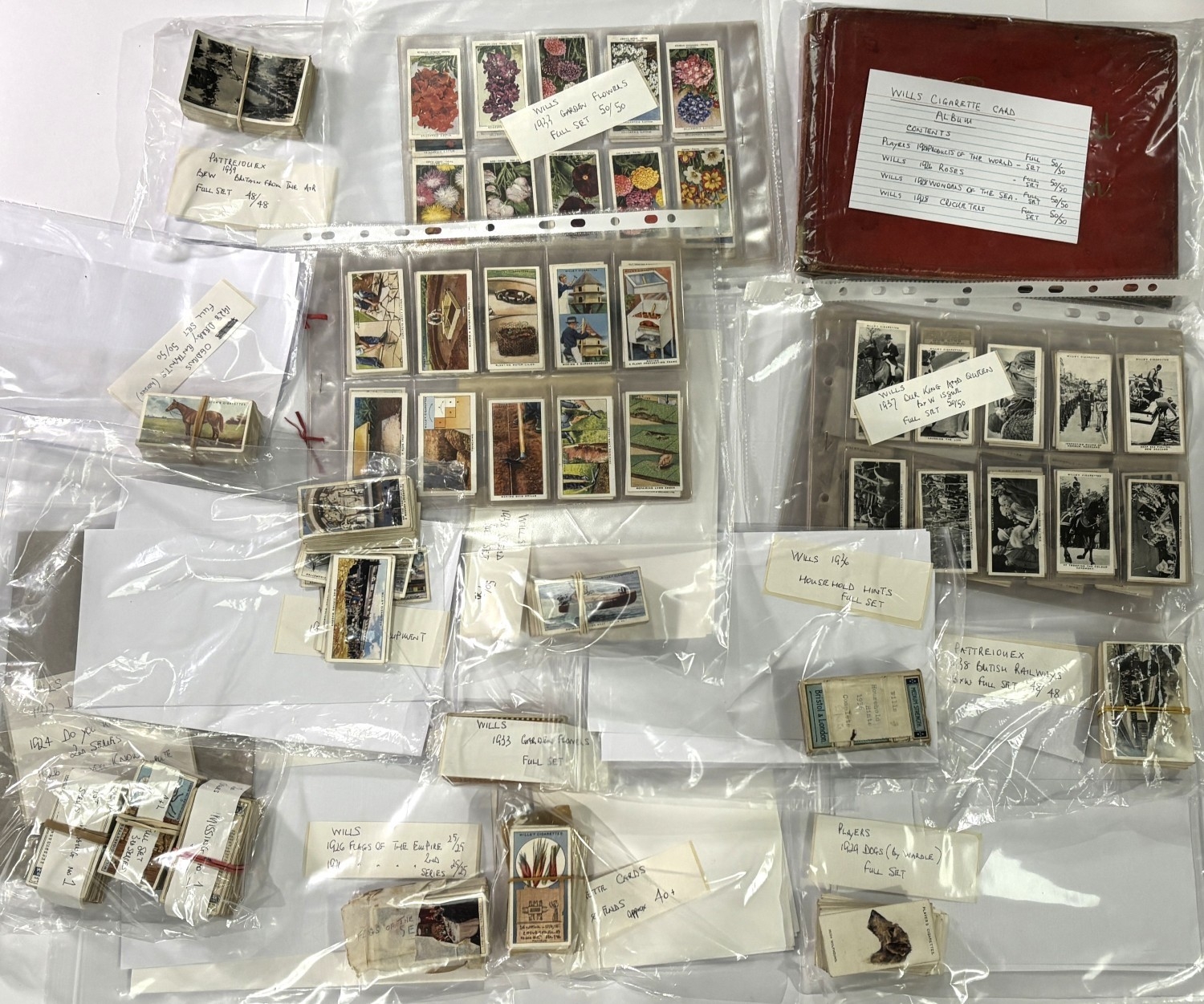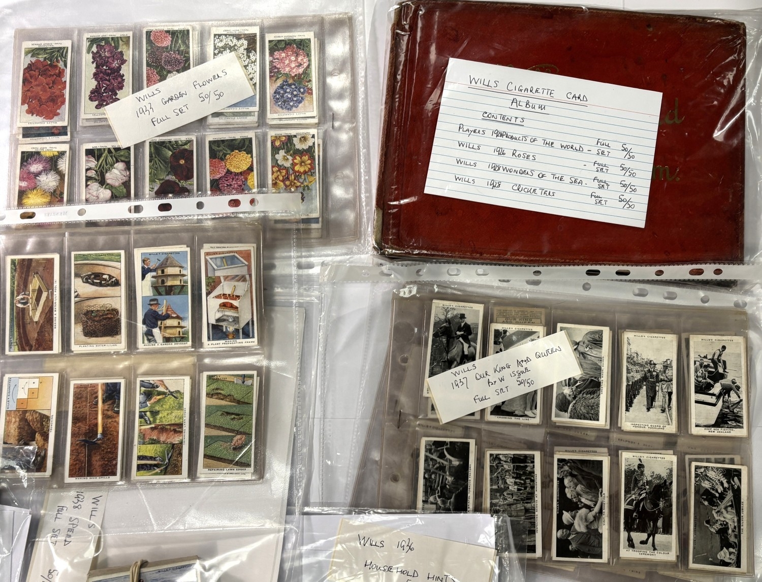A collection of cigarette cards with Wills card album including Players 1928 Products of the World 50/50, Wills 1926 Roses 50/50, Wills 1928 Wonders of the Sea 50/50, Wills Cricketers 50/50; others include Pattereiouex 1938 British Railways 48/48, Wills 1933 Garden Flowers 50/50, Wills 1923 Lucky Charms 50/50, Wills 1937 Our King & Queen b&w issue 50/50 plus other examples.