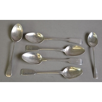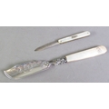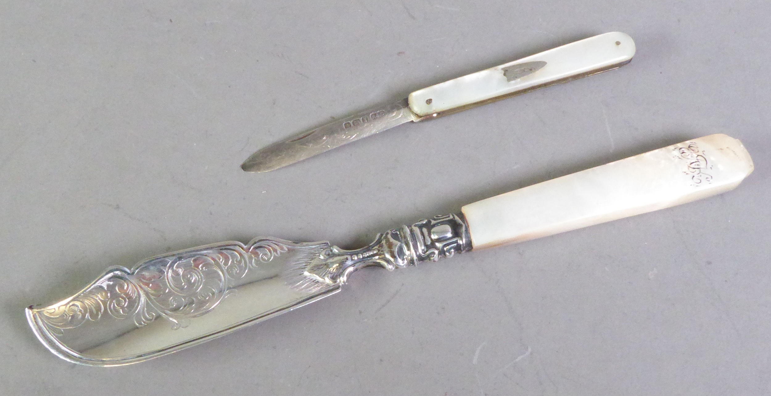 VICTORIAN ENGRAVED SILVER BLADED LARGE BUTTER KNIFE, with mother of pearl handle, initialled, 7 ¾” (19.7cm) long, Birmingham 1874, together with a George V ENGRAVED SILVER BLADED SMALL PEN KNIFE, in mother of pearl clad case, Sheffield 1915, (2)