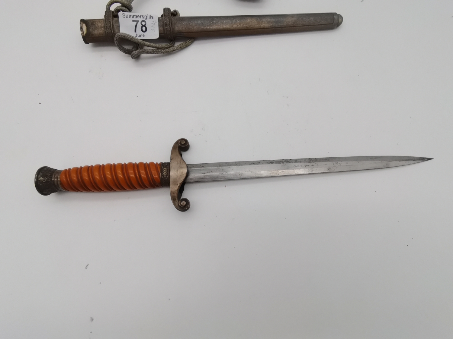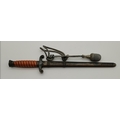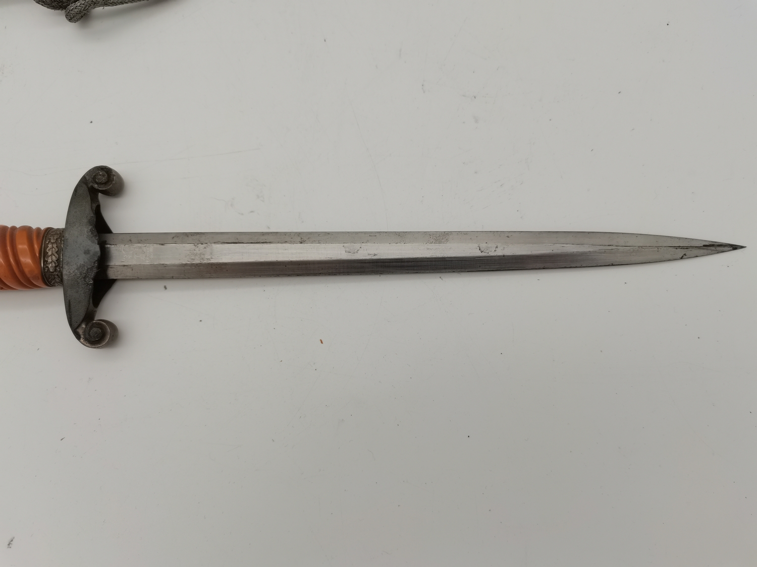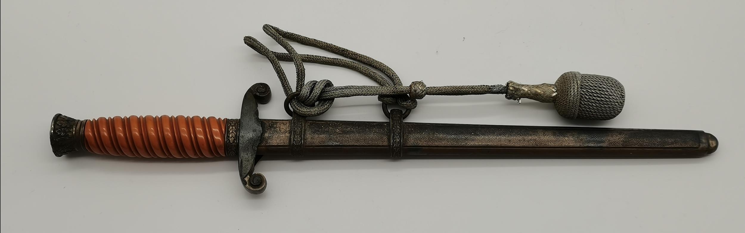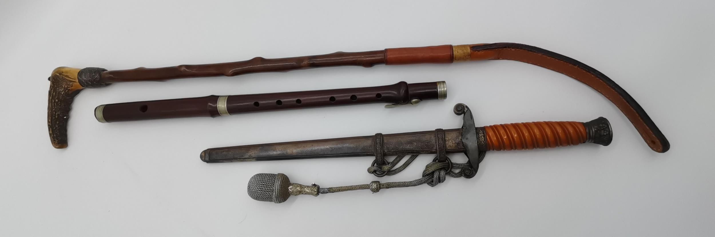A WW2 German officer's dagger, the double edge steel blade by Carl Eickhorn, with wrythen fluted orange plastic grip, the white-metal scabbard with spot-hammered finish, with oak leaf decoration to pommel and scabbard, with silver-thread portapee; together with an antler-mounted hunting crop; and a wooden traverso/flute by G.French London. (3) Dagger 40cm long overall (incl. scabbard)
