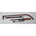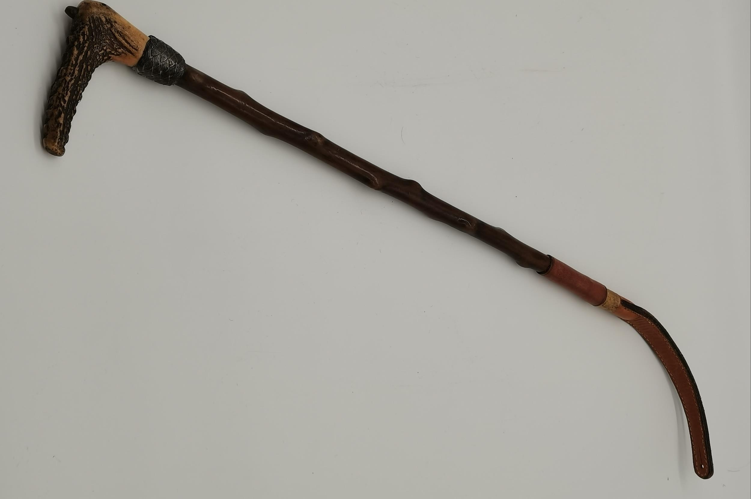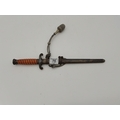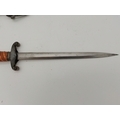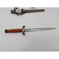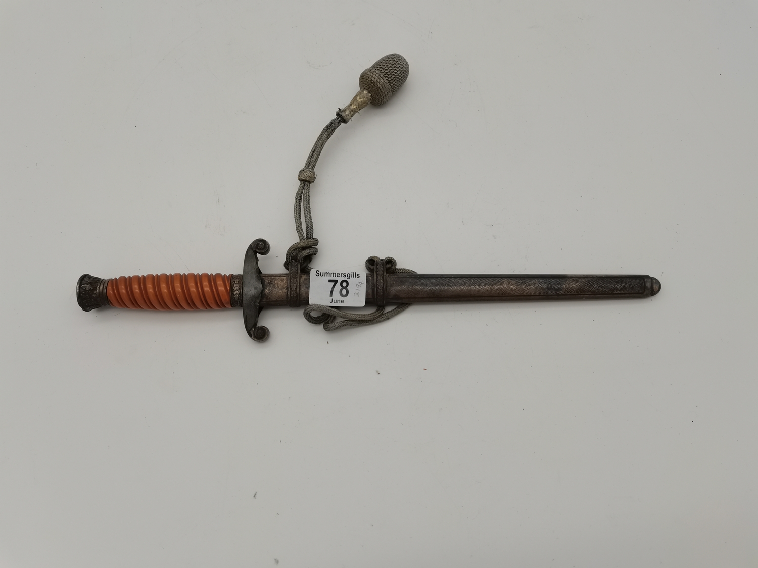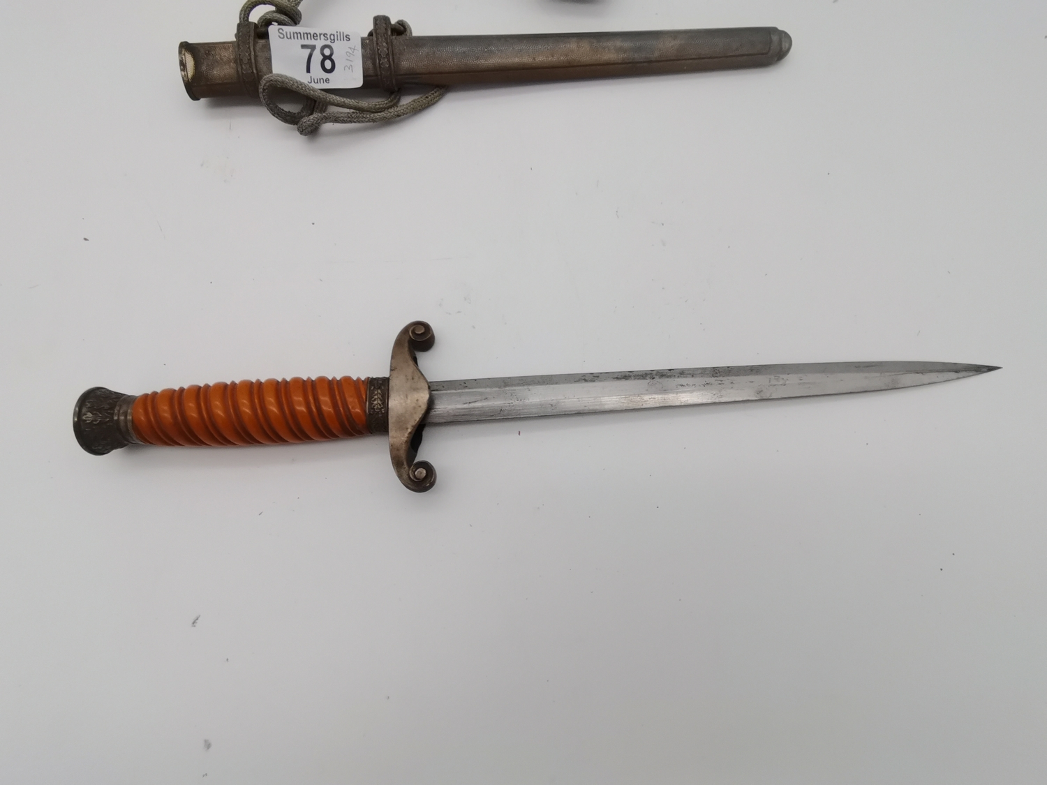 A WW2 German officer's dagger, the double edge steel blade by Carl Eickhorn, with wrythen fluted orange plastic grip, the white-metal scabbard with spot-hammered finish, with oak leaf decoration to pommel and scabbard, with silver-thread portapee; together with an antler-mounted hunting crop; and a wooden traverso/flute by G.French London. (3) Dagger 40cm long overall (incl. scabbard)