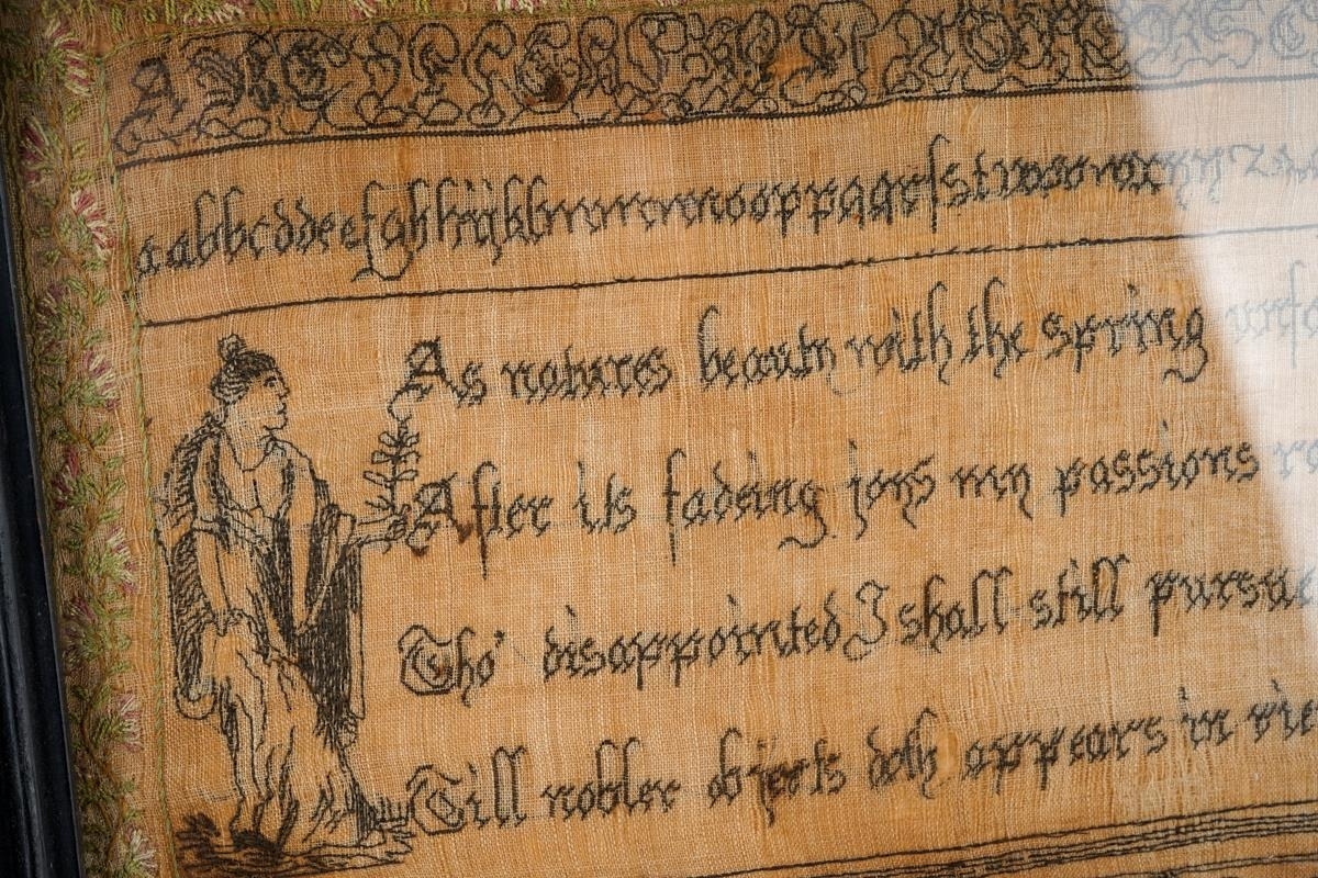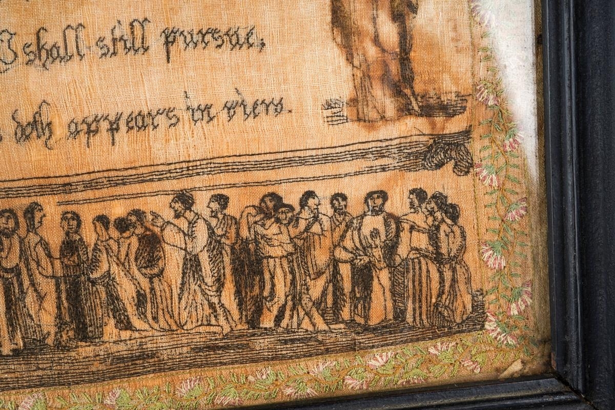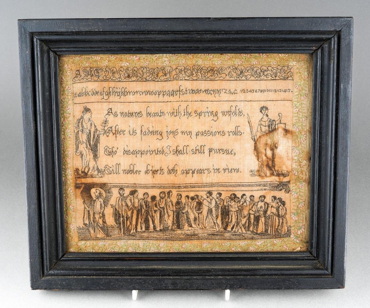 A 19th Century monochrome needlework panel, with alphabet and numbers to upper section, the mid section with verse: