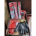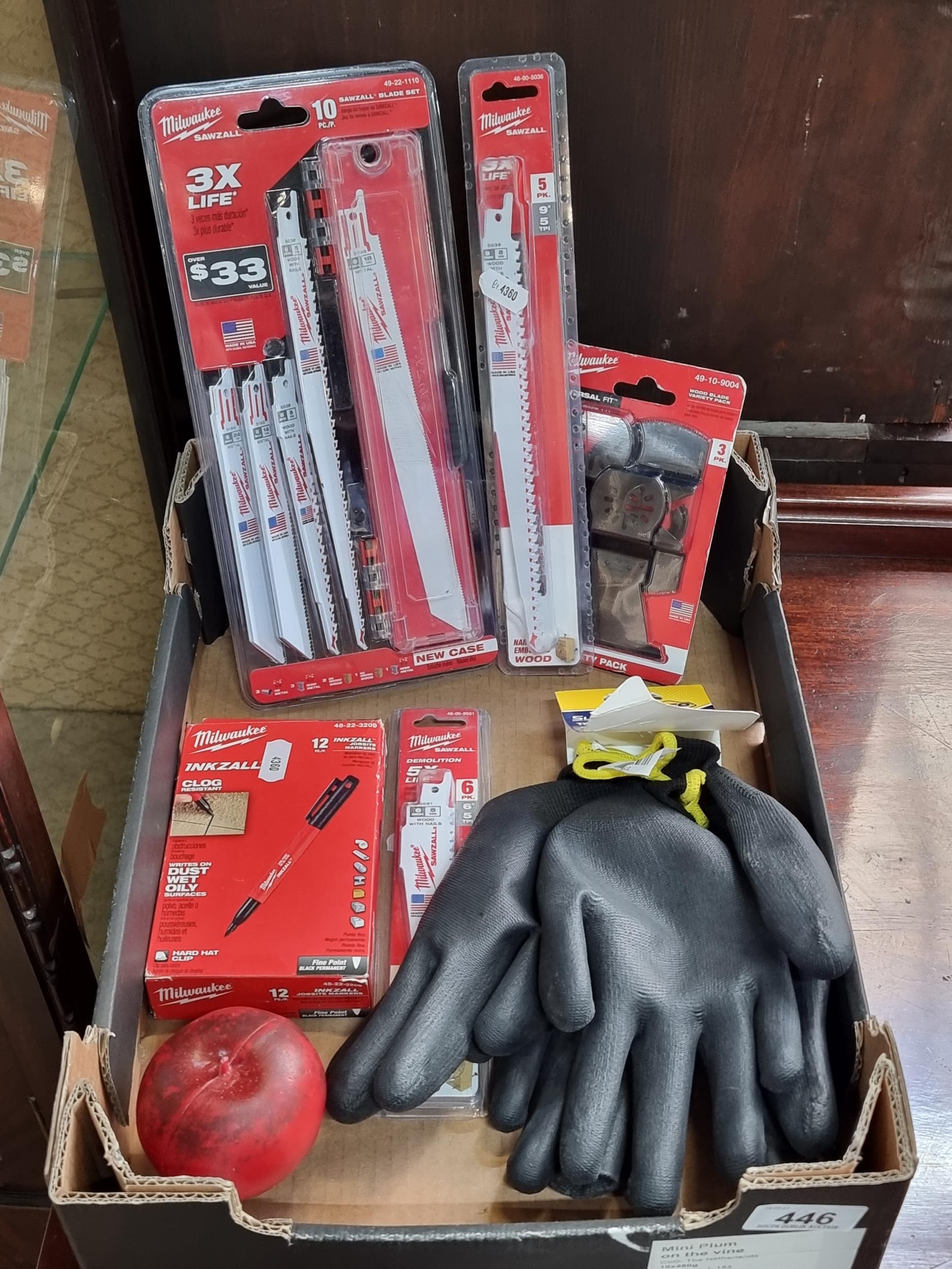 A selection of 6 DIY and construction related items, including a ten-piece Milwaukee Sawzall saw blade set, a twelve-piece set of Inkzall jobsite markers, and a pair of Tyler's gloves. Like those fancy pens.