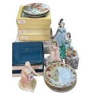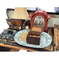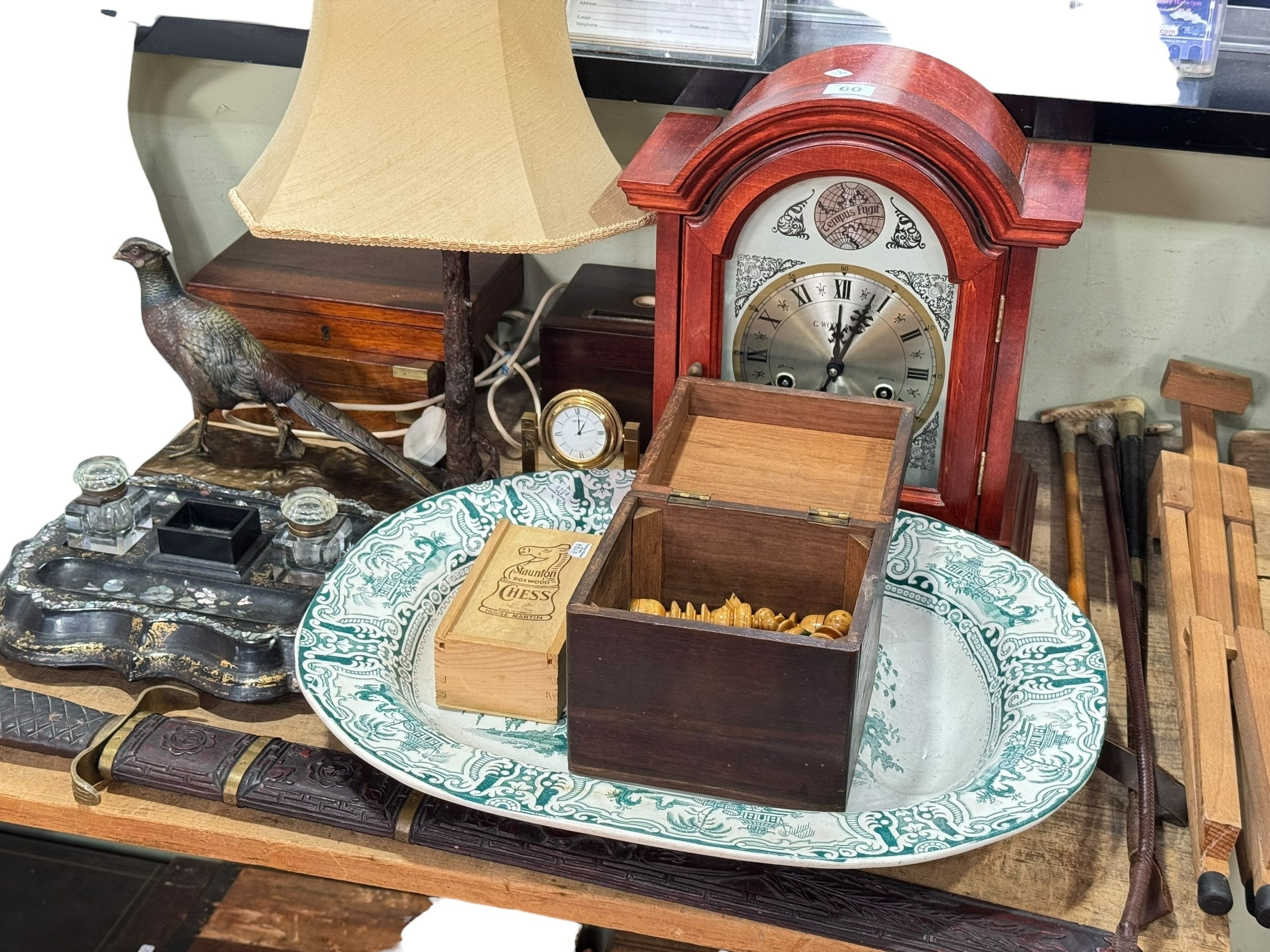 Pheasant and tree lamp, papier mache and mother of pearl inkstand, mantel clock, two chess sets, meat plate, riding crops, sword, wooden boxes, etc.