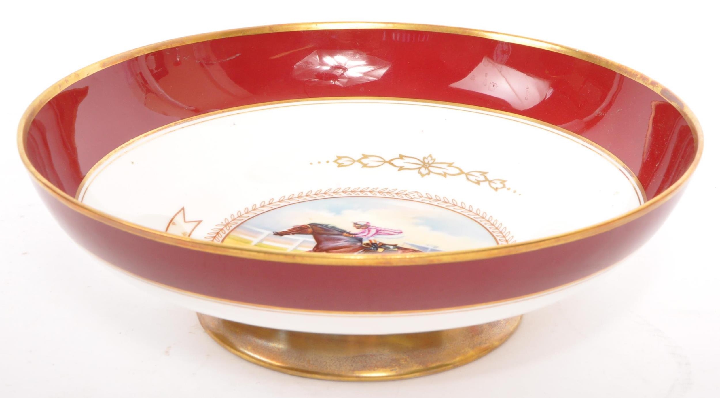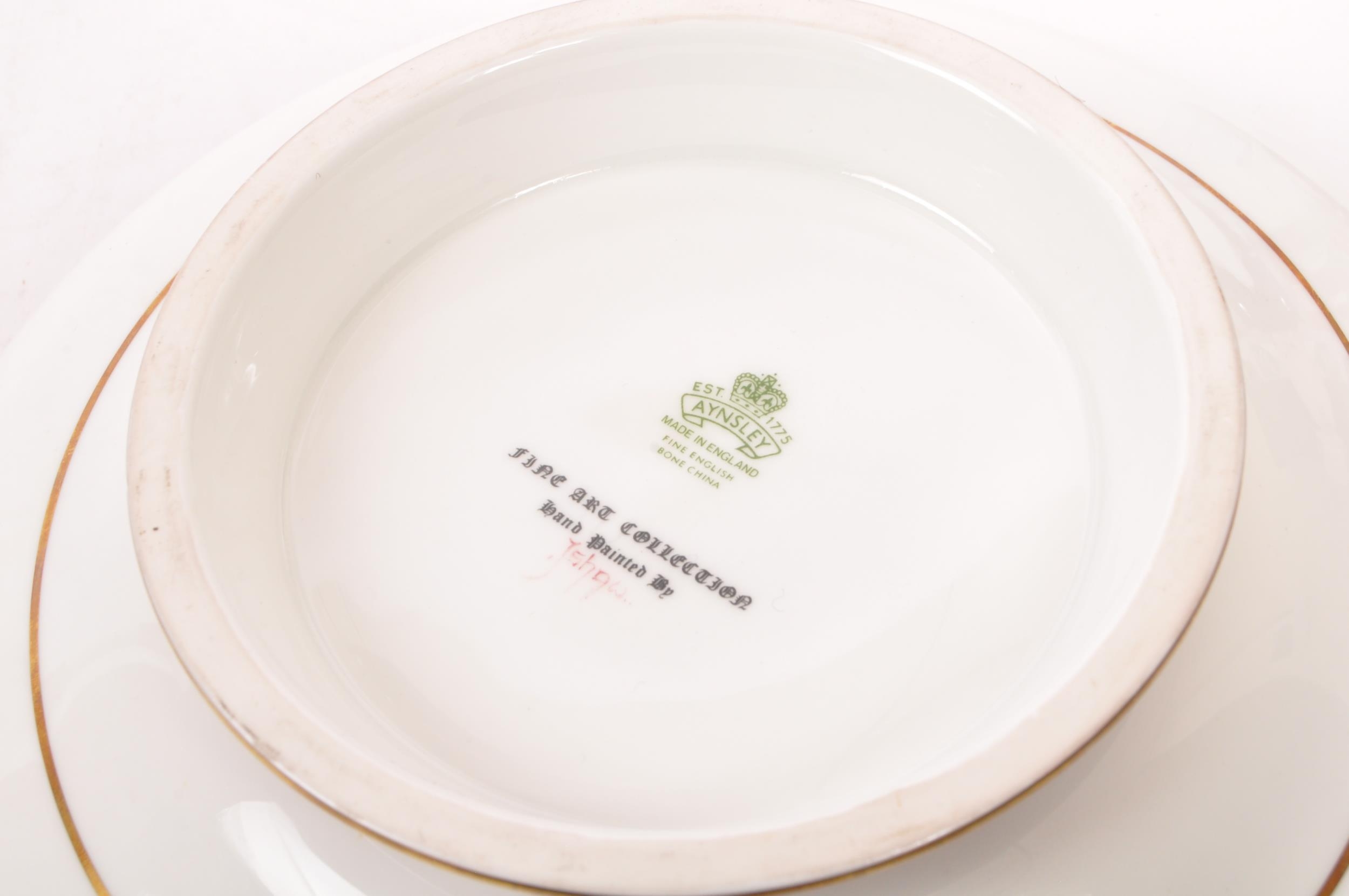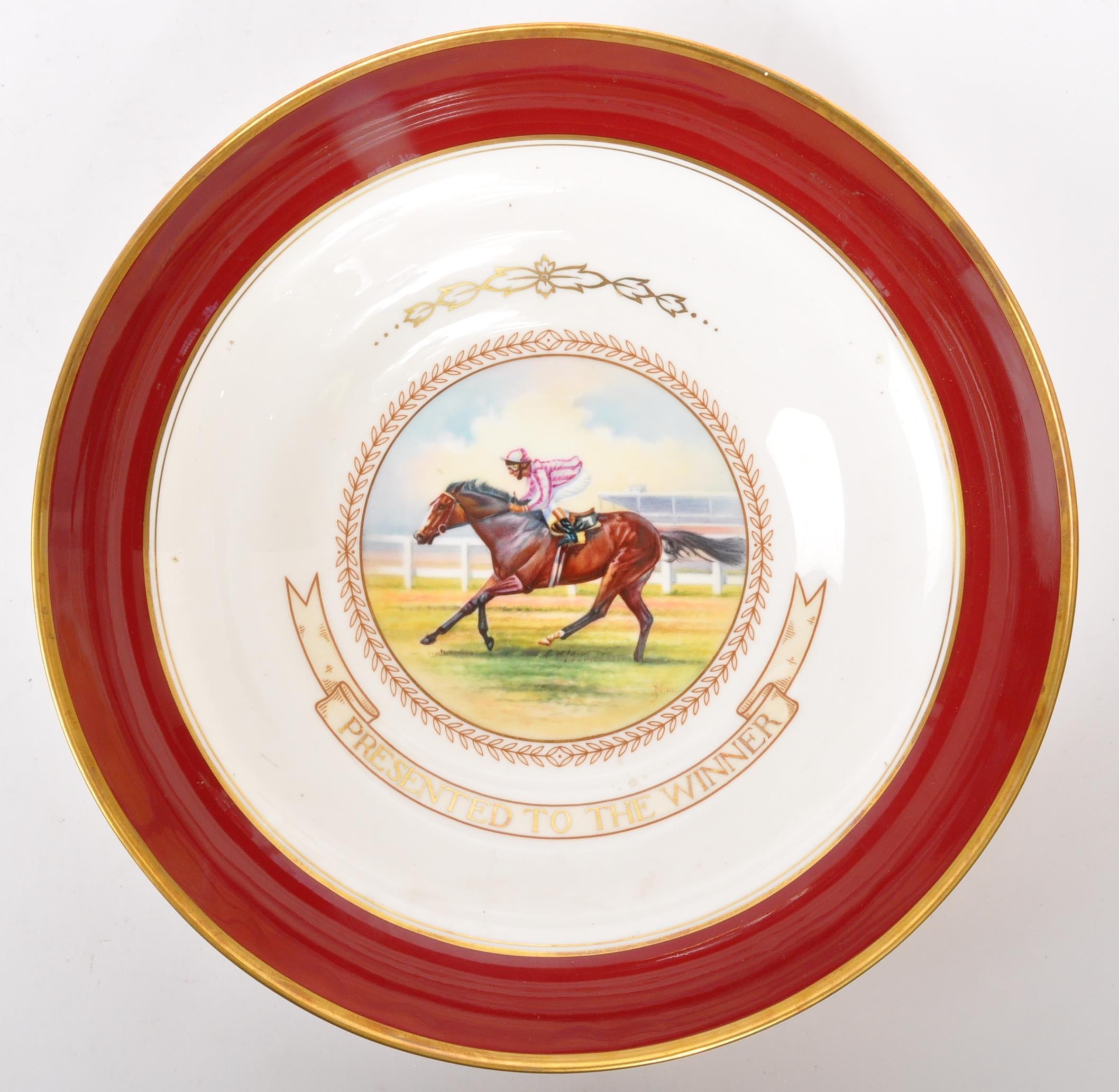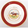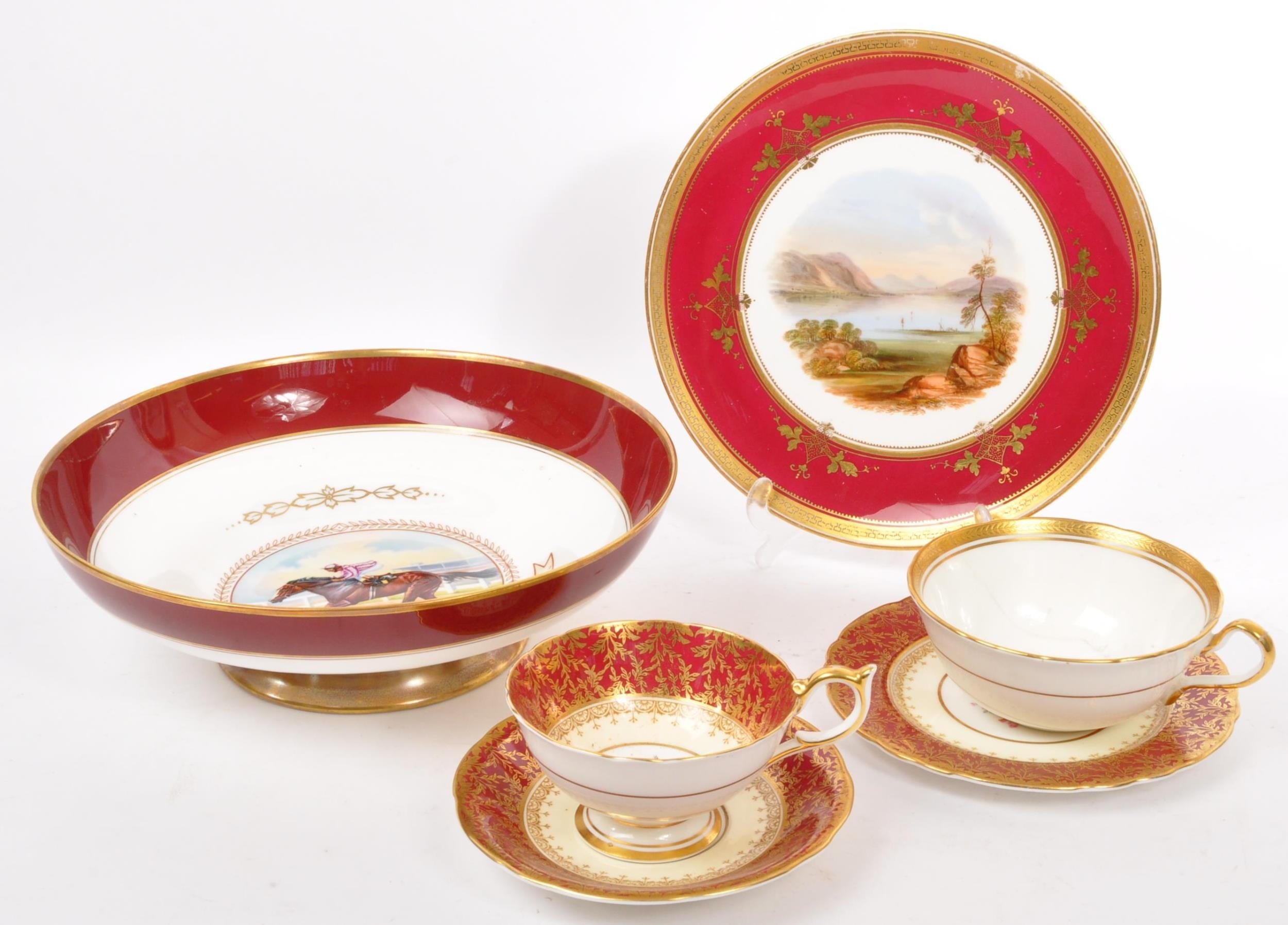A collection of 20th century Aynsley ceramics, all stamped to the underside with the exception of one plate. To include 3 x plates, 2 x cups and fruit bowl. The plates depicting both floral and one landscape with all three holding gilt decoration. One cup holding floral and gilt decoration with the other having white ground with gold gilding (crack / missing handle). The fruit bowl being hand painted depicting a racing horse with rider and text reads 'presented to the winner'. Largest measures 26cm (diameter).