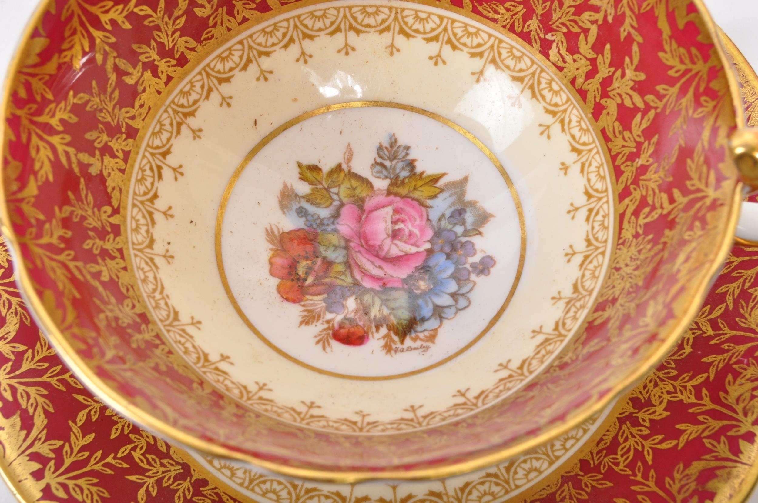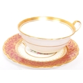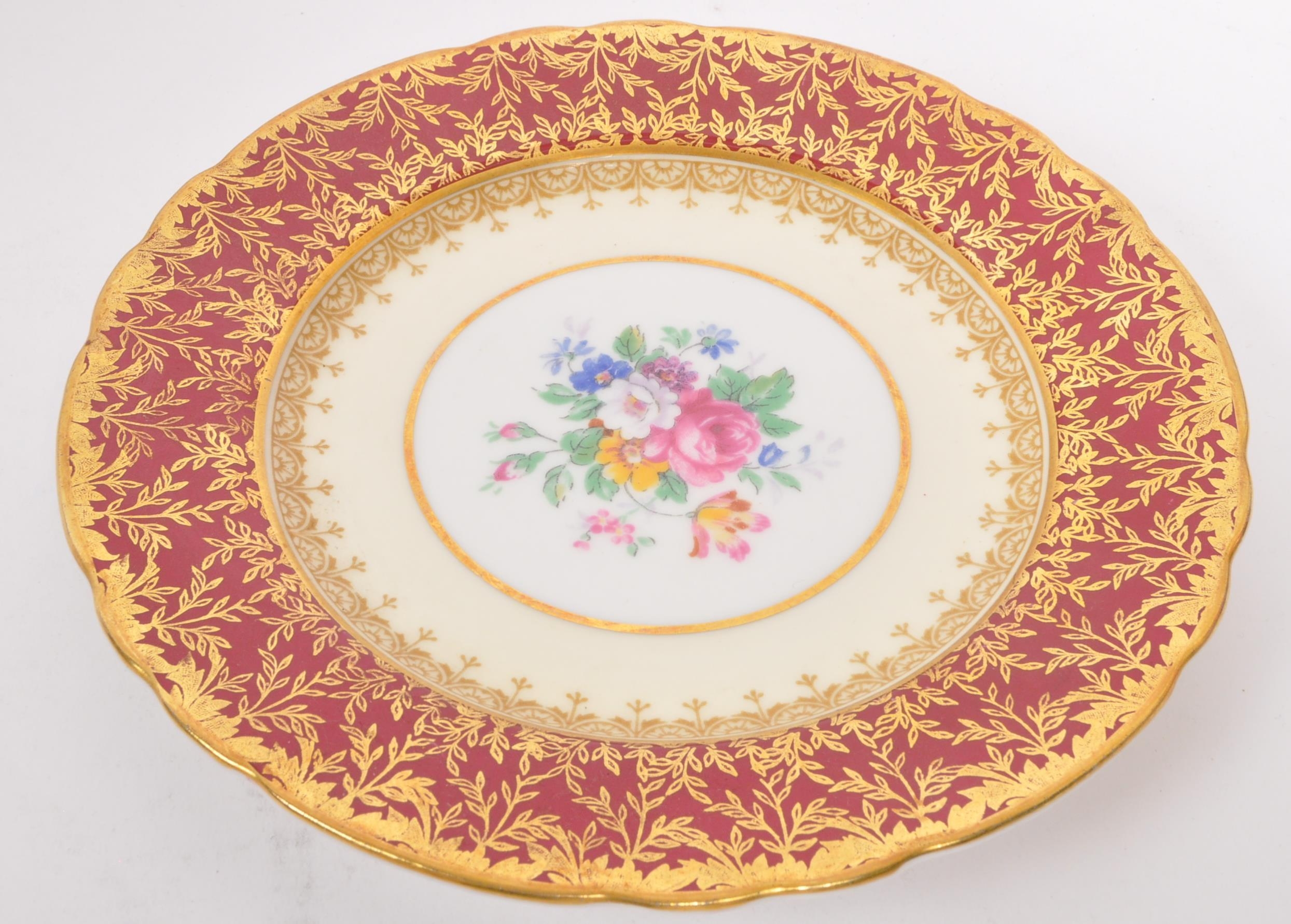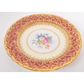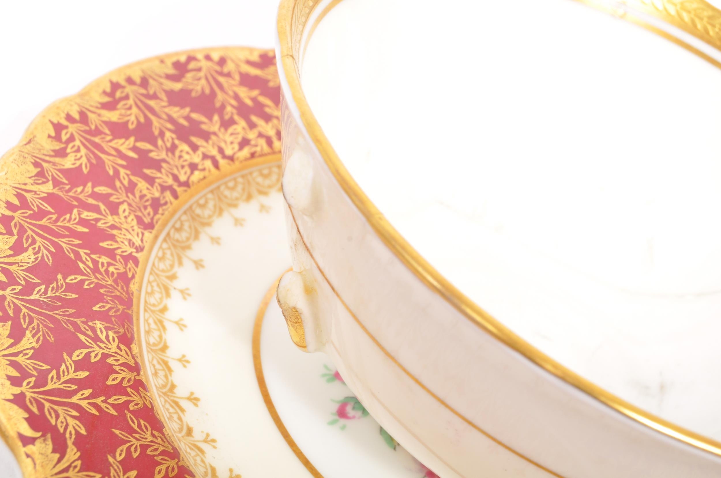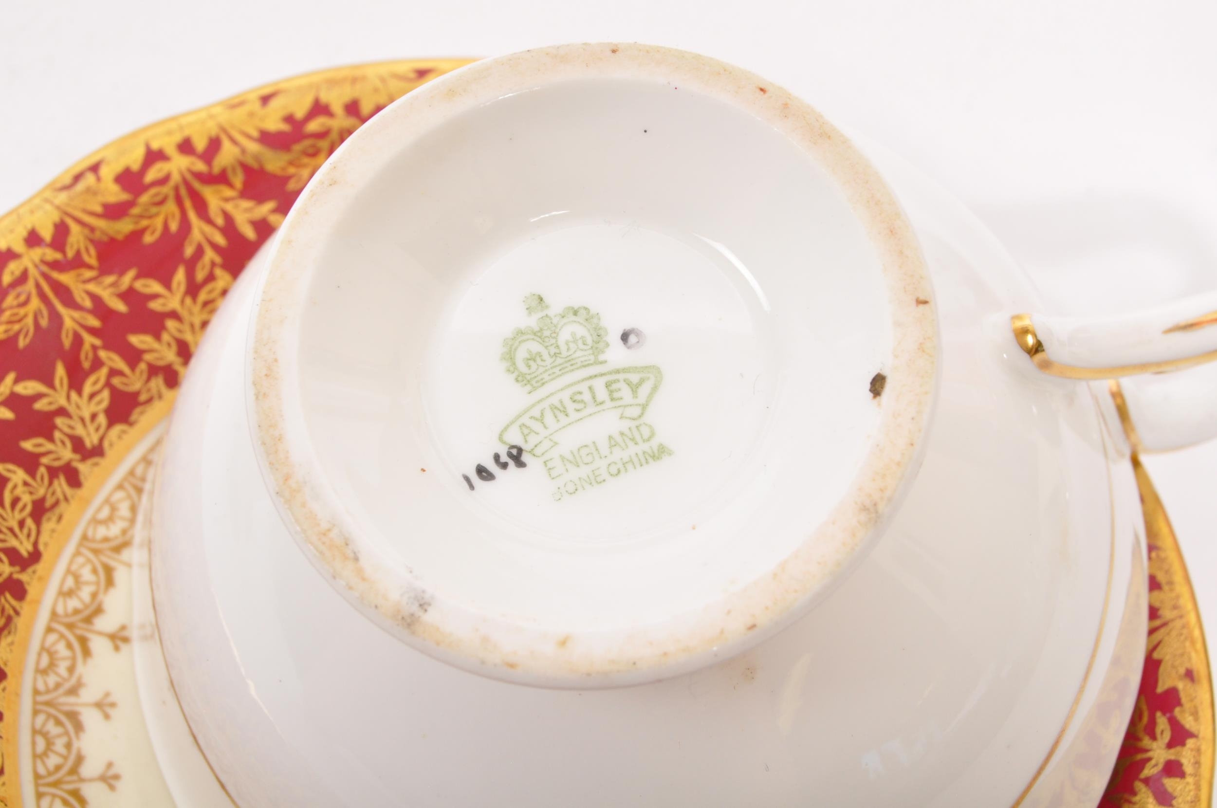 A collection of 20th century Aynsley ceramics, all stamped to the underside with the exception of one plate. To include 3 x plates, 2 x cups and fruit bowl. The plates depicting both floral and one landscape with all three holding gilt decoration. One cup holding floral and gilt decoration with the other having white ground with gold gilding (crack / missing handle). The fruit bowl being hand painted depicting a racing horse with rider and text reads 'presented to the winner'. Largest measures 26cm (diameter).