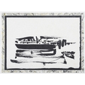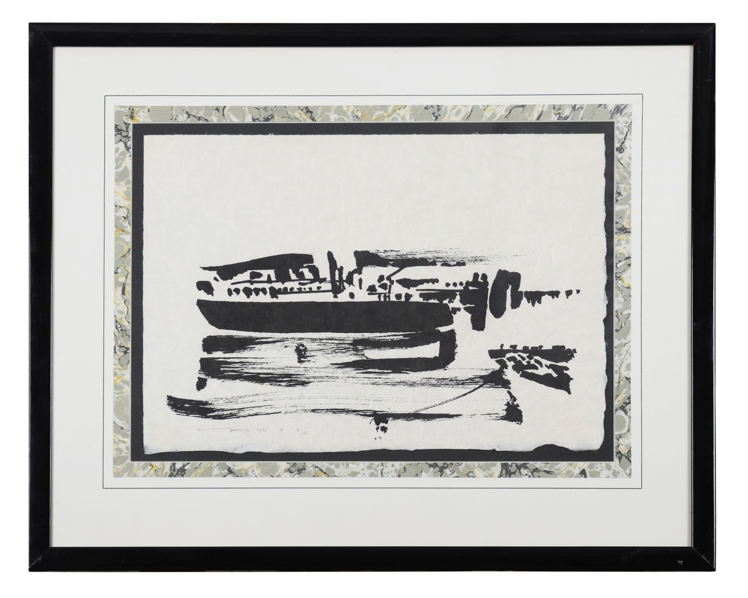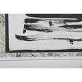 A limited edition lithograph by Louis le Brocquy titled Swans, Chapelizod. Executed in bold black brushwork on a pale ground, the composition captures the graceful movement of swans on the River Liffey at Chapelizod through fluid abstraction and rhythmic form. Signed, dated 1986, and numbered from an edition of 125. Presented in a marbled mount and black frame. Image: 32 x 45cm