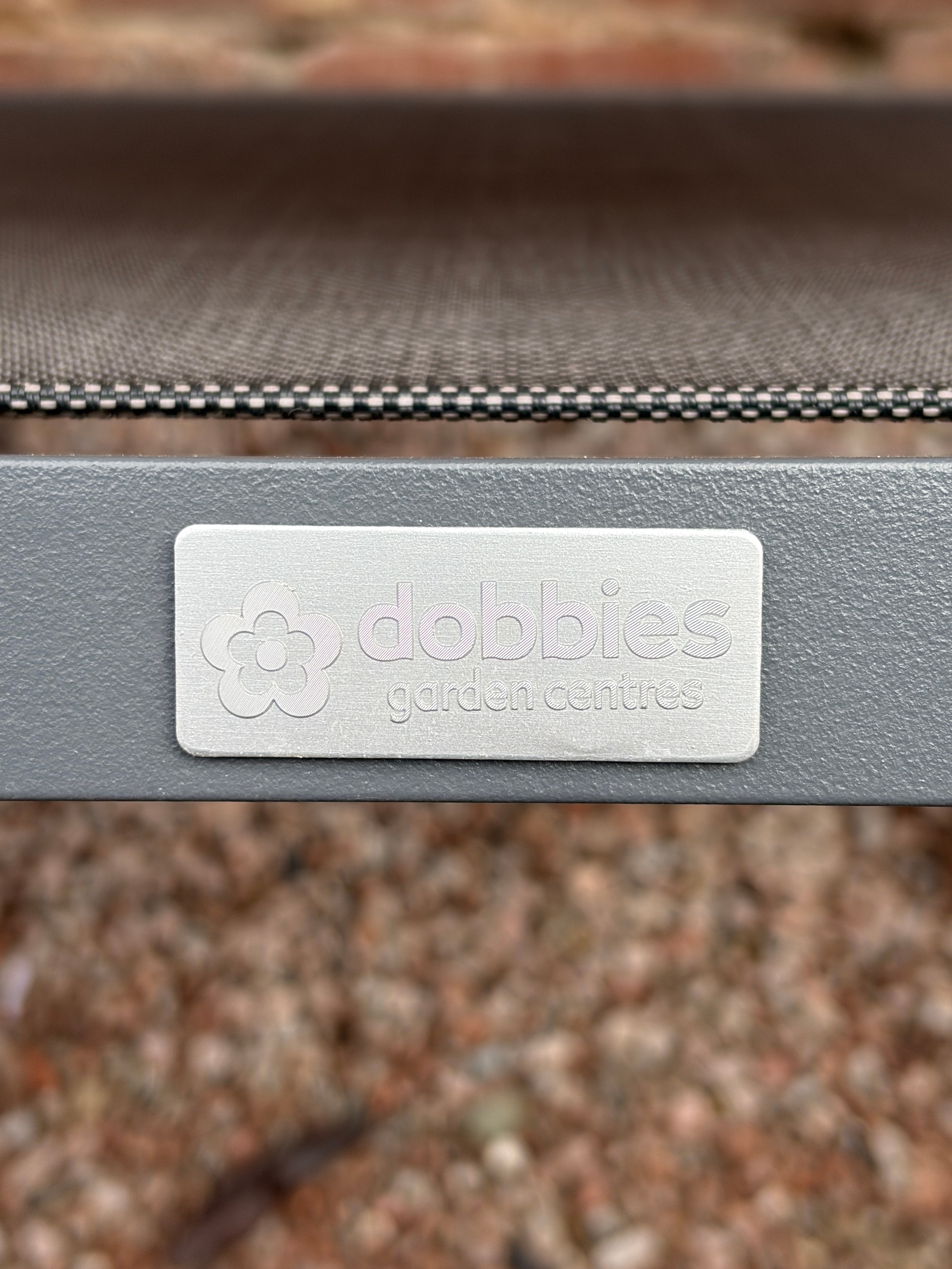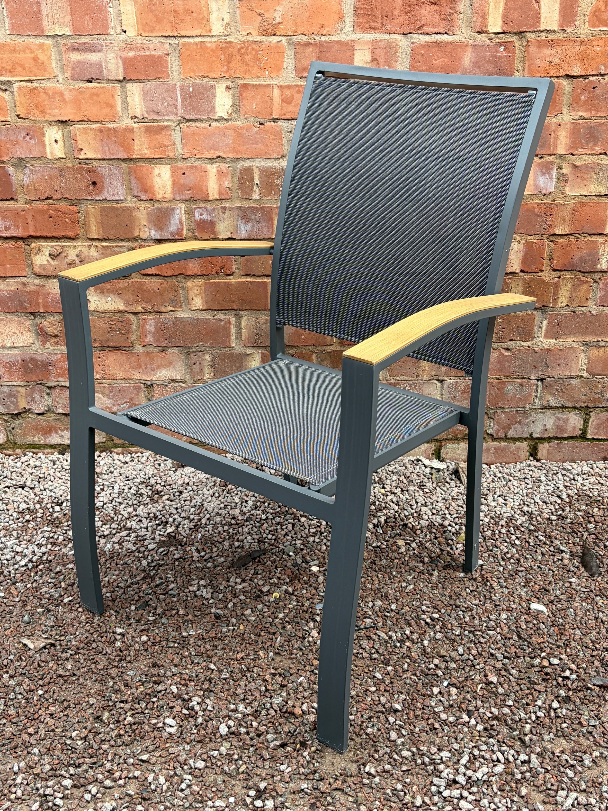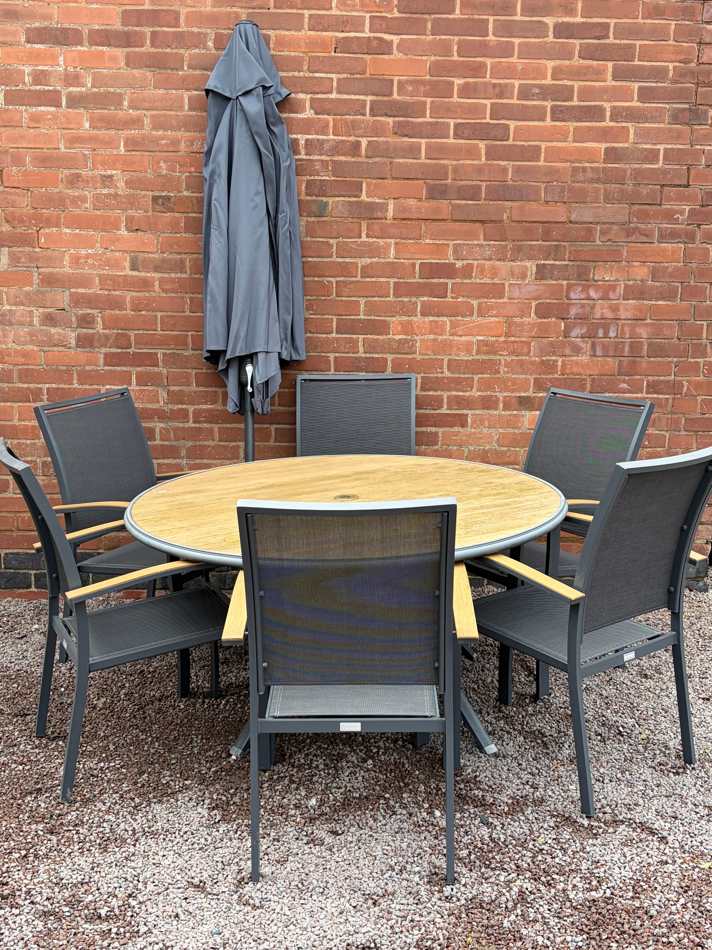 CIRCULAR PATIO TABLE, SIX STACKABLE CHAIRS, PARASOL IN BOX WITH WEIGHTED BASE AND CUSHIONS IN NYLON BAG