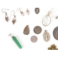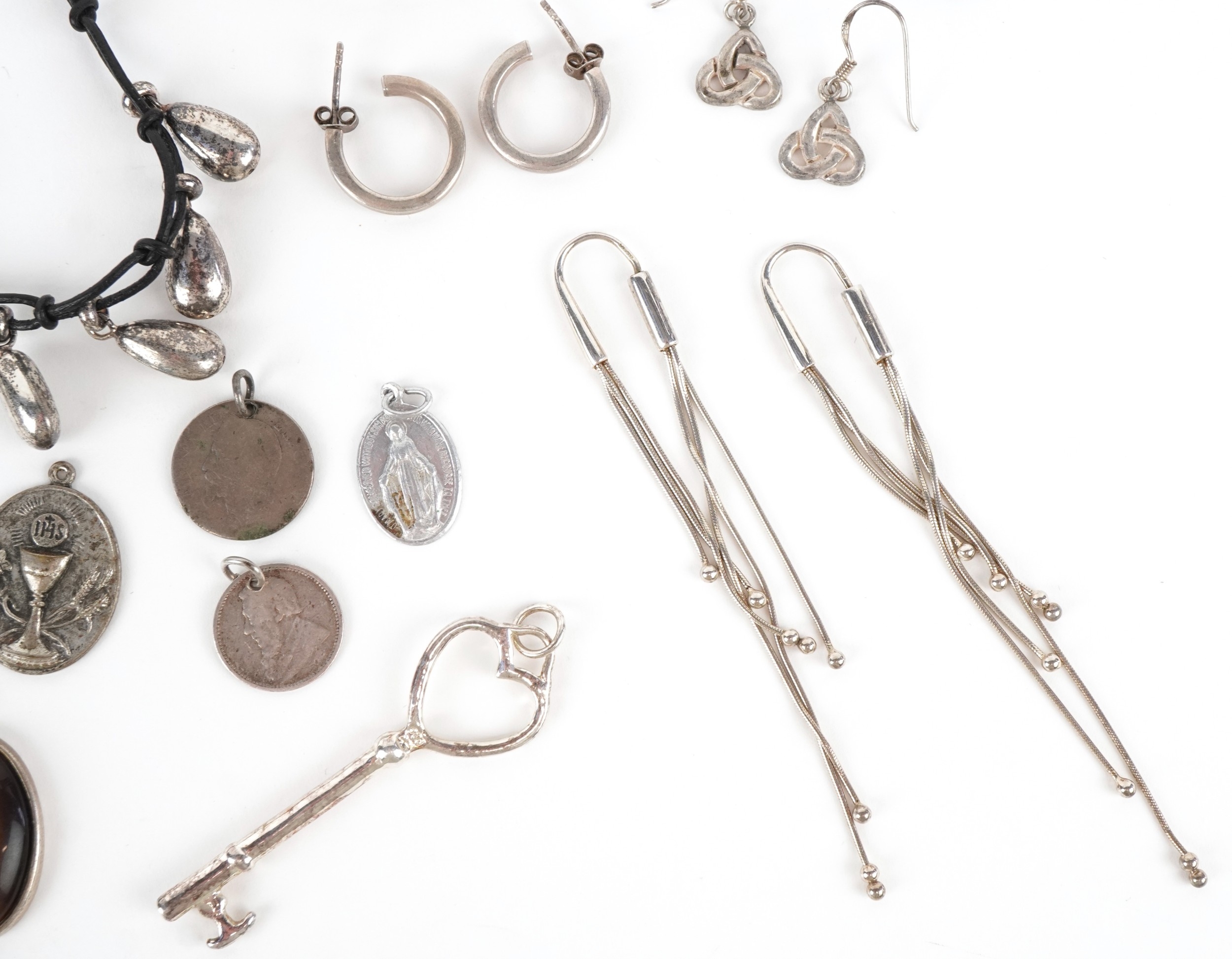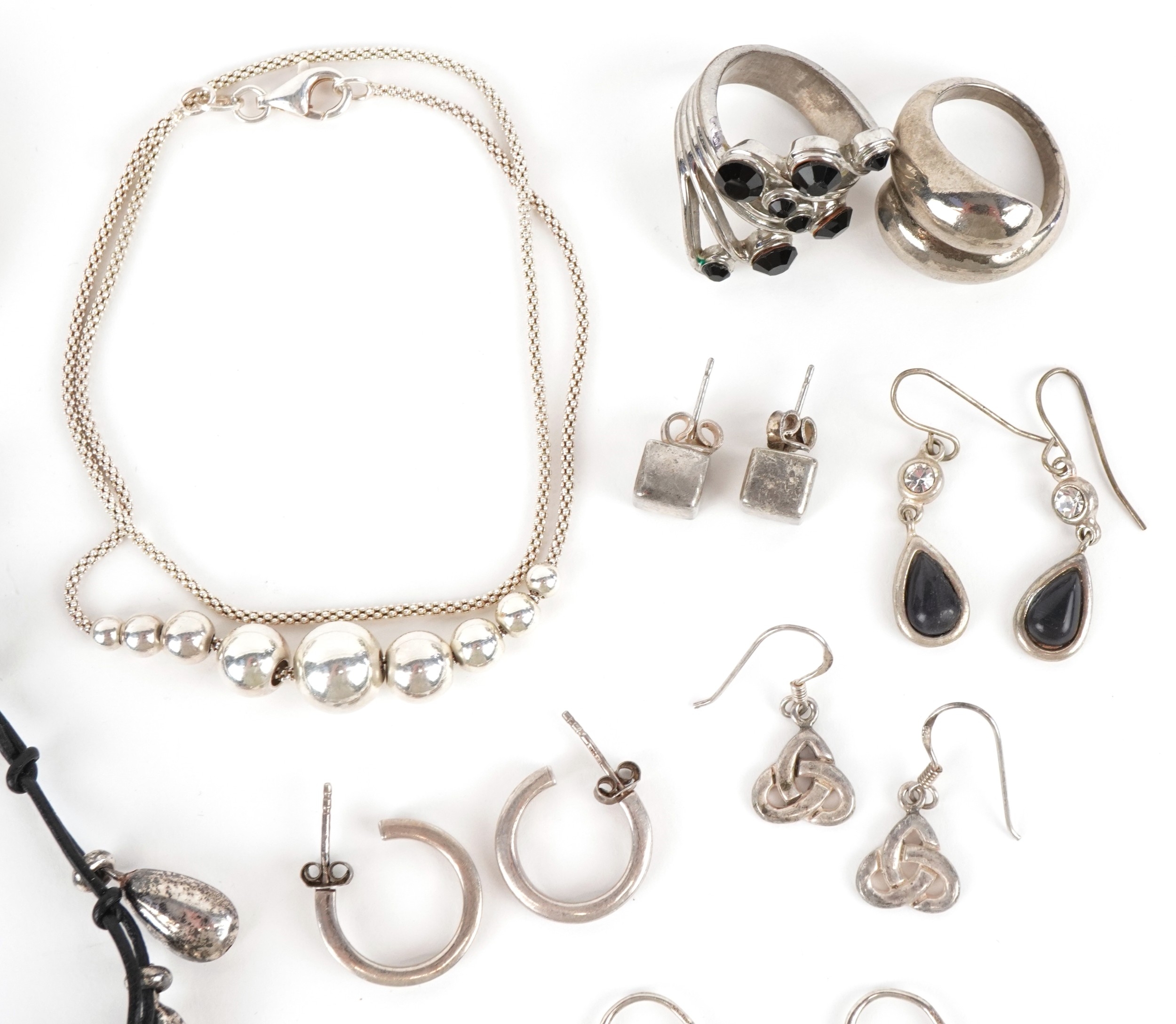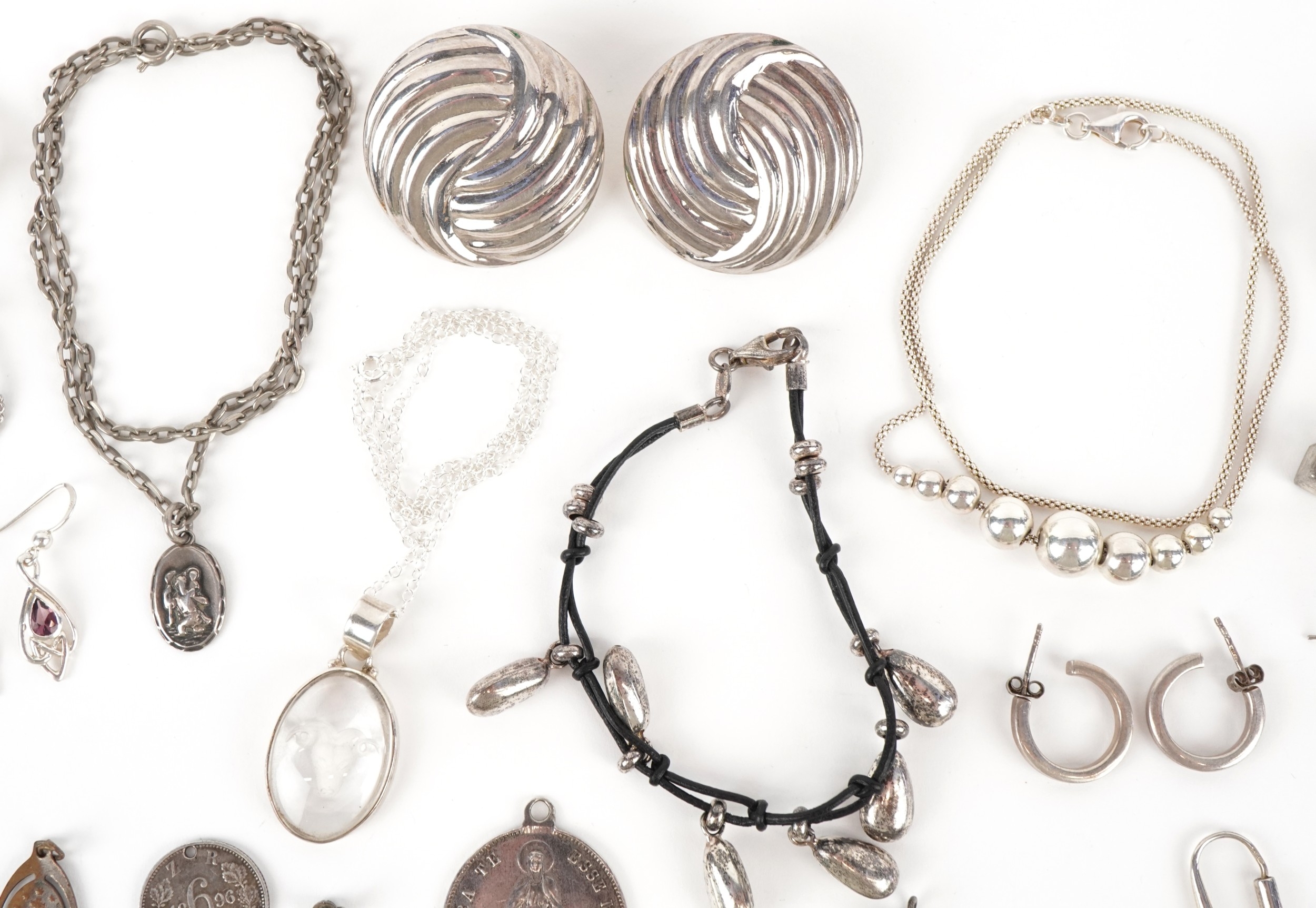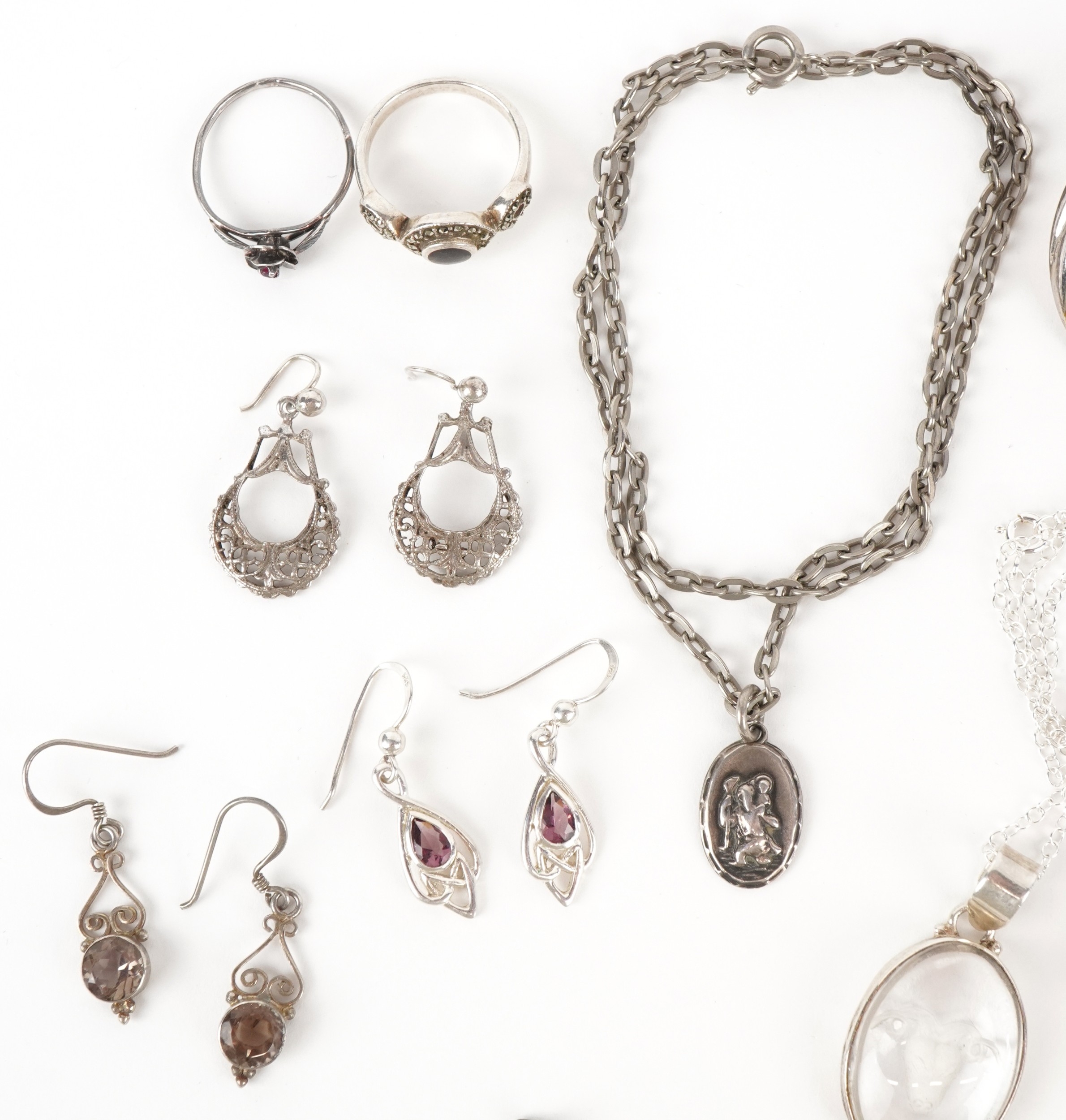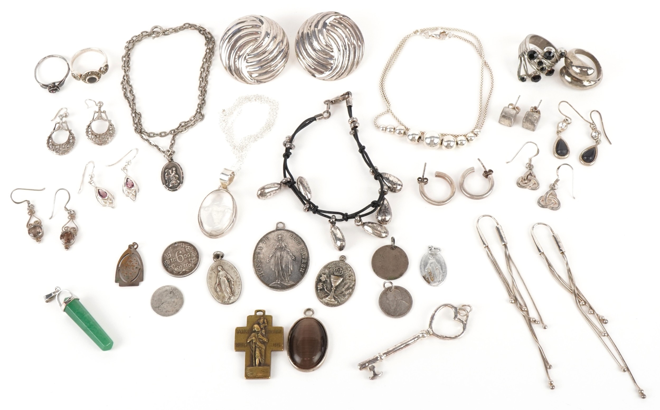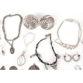 Antique and later silver and white metal jewellery including a large pair of silver Modernist earrings, a silver marcasite ring, necklaces and bracelets, total weight 150.0g.