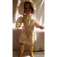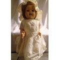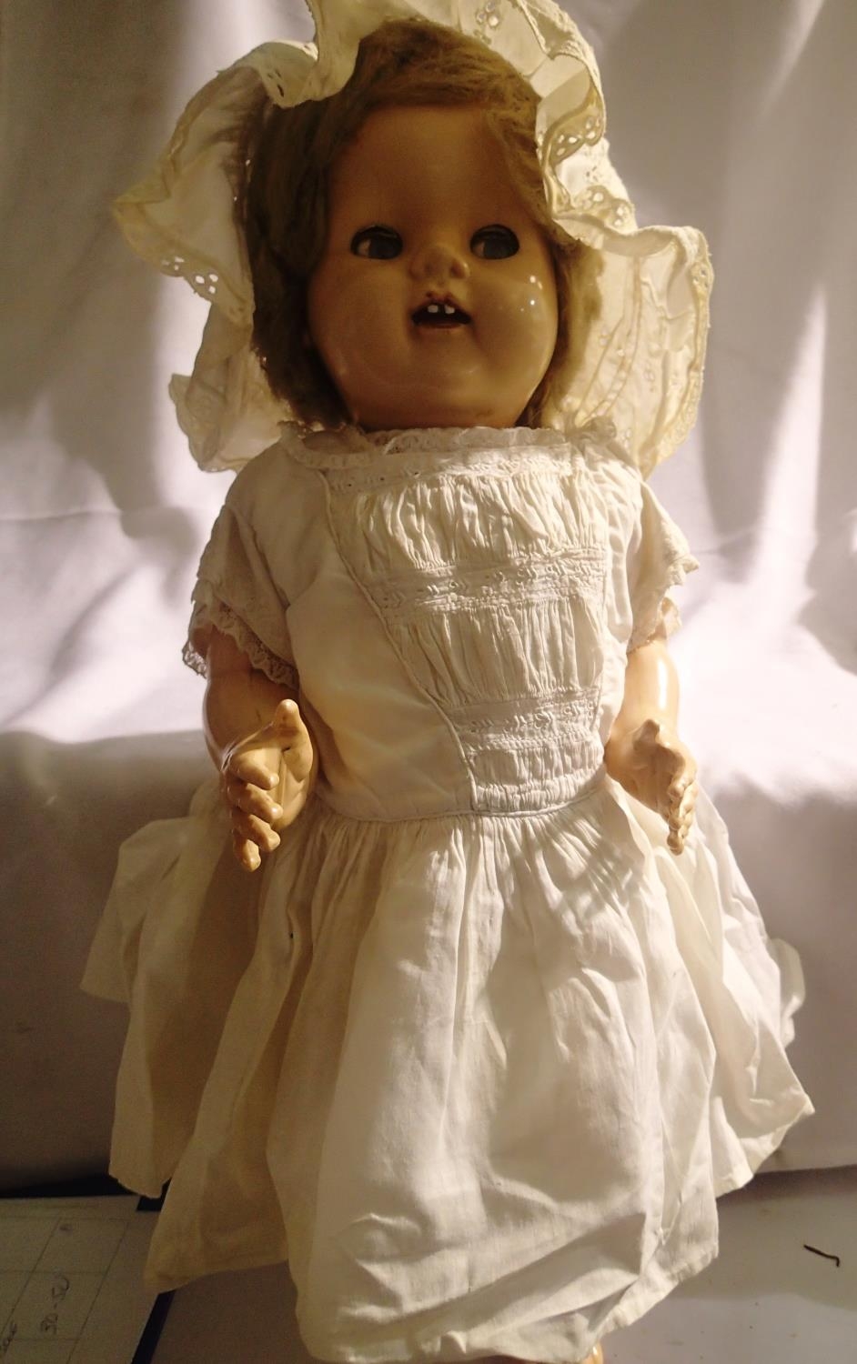 Celluloid doll, approximate height 53 cm, made in England to back, jointed and sleep eyes, sound box in back, not working, some damage to body (cracks). P&P Group 1 (£14+VAT for the first lot and £1+VAT for subsequent lots)
