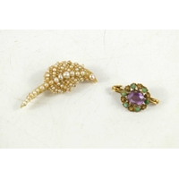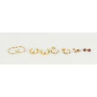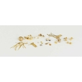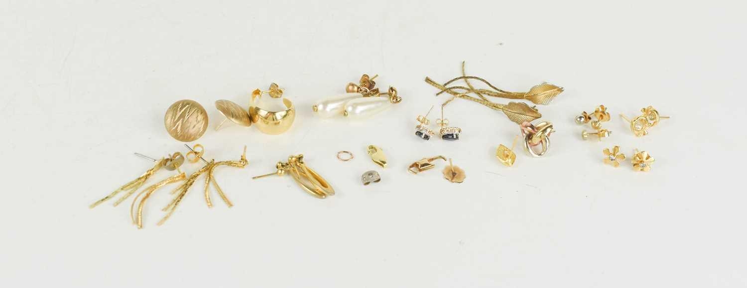 A pair of 15ct gold flower head stud earrings, 0.8g, two 9ct gold crab claw clasps, 1.2g, and various other single and pairs of earrings.