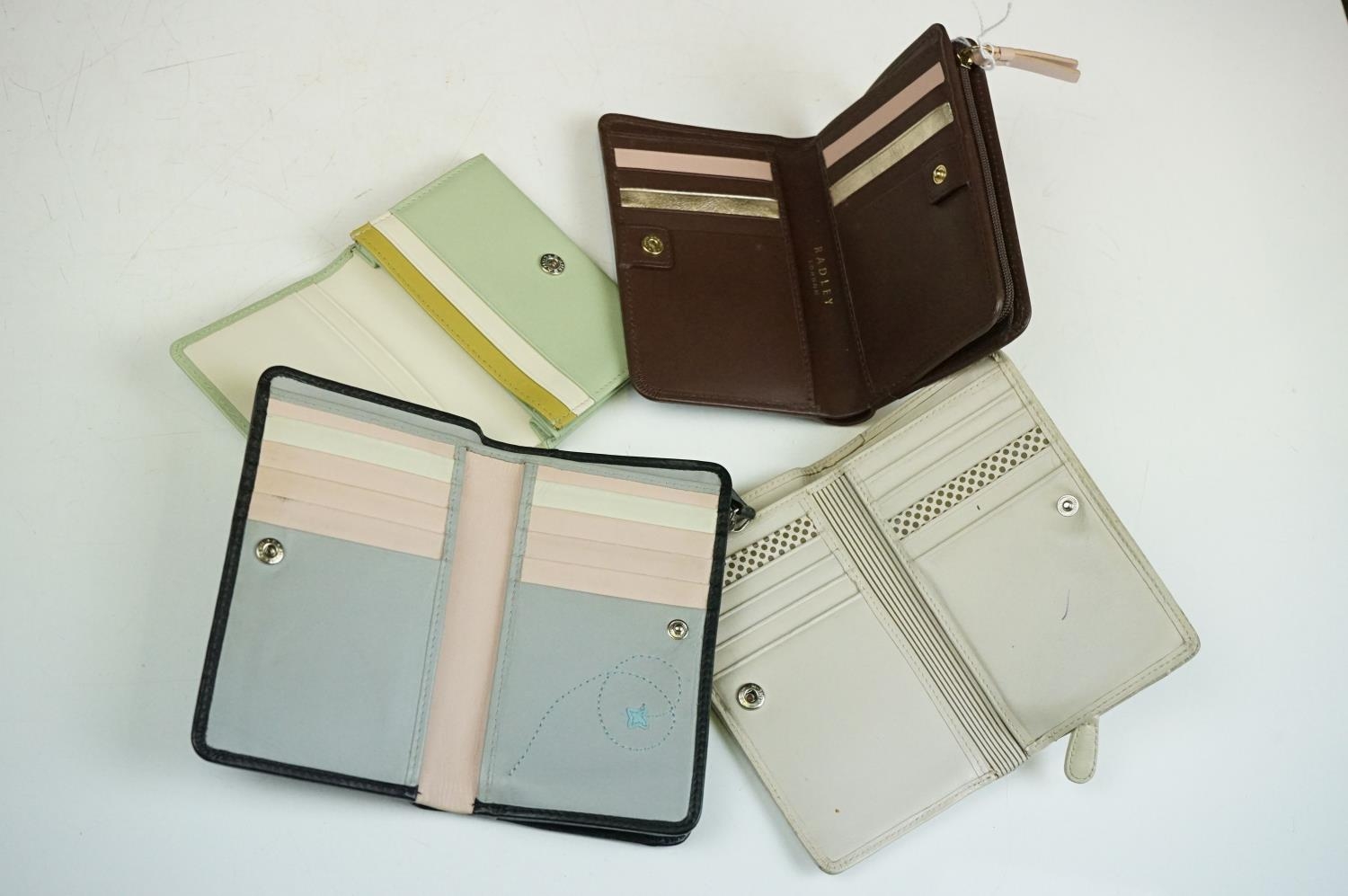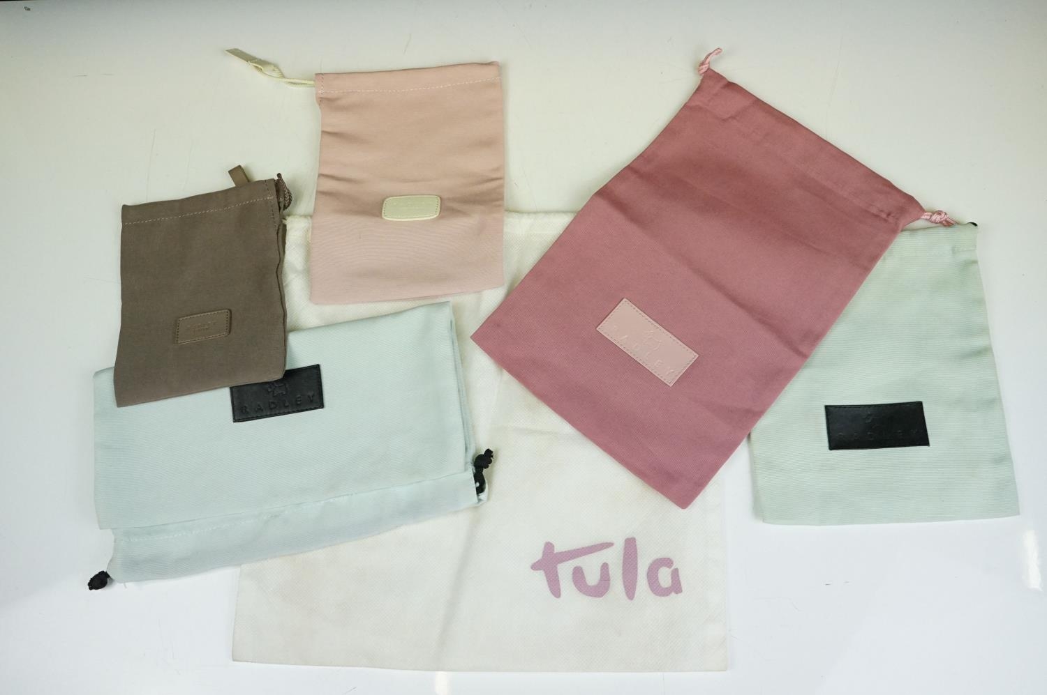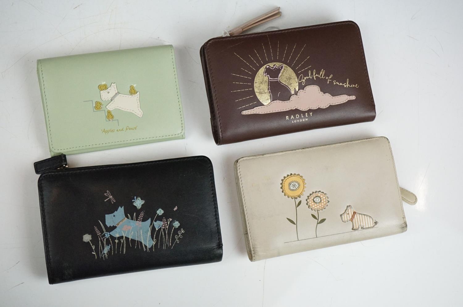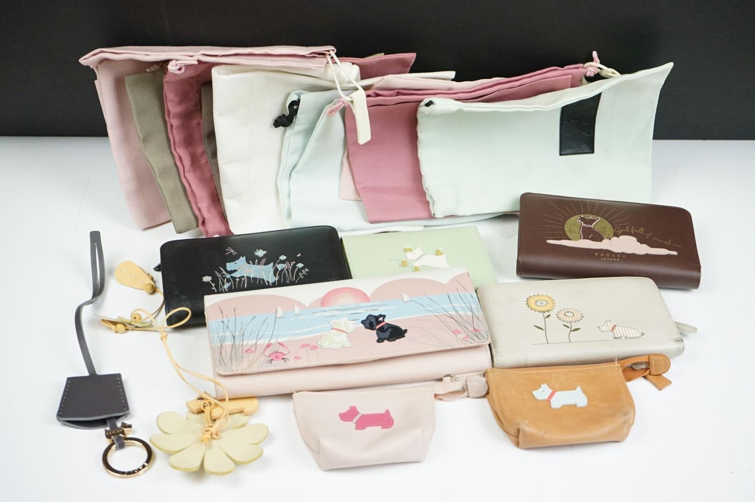Collection of Seven Radley Leather Wallets / Purses including ‘ London Burgh Island ‘ design, ‘ Apples and Pears ‘ design and ‘ Soul full of sunshine ‘ design together with Three Radley Tags and a group of Dust Bags