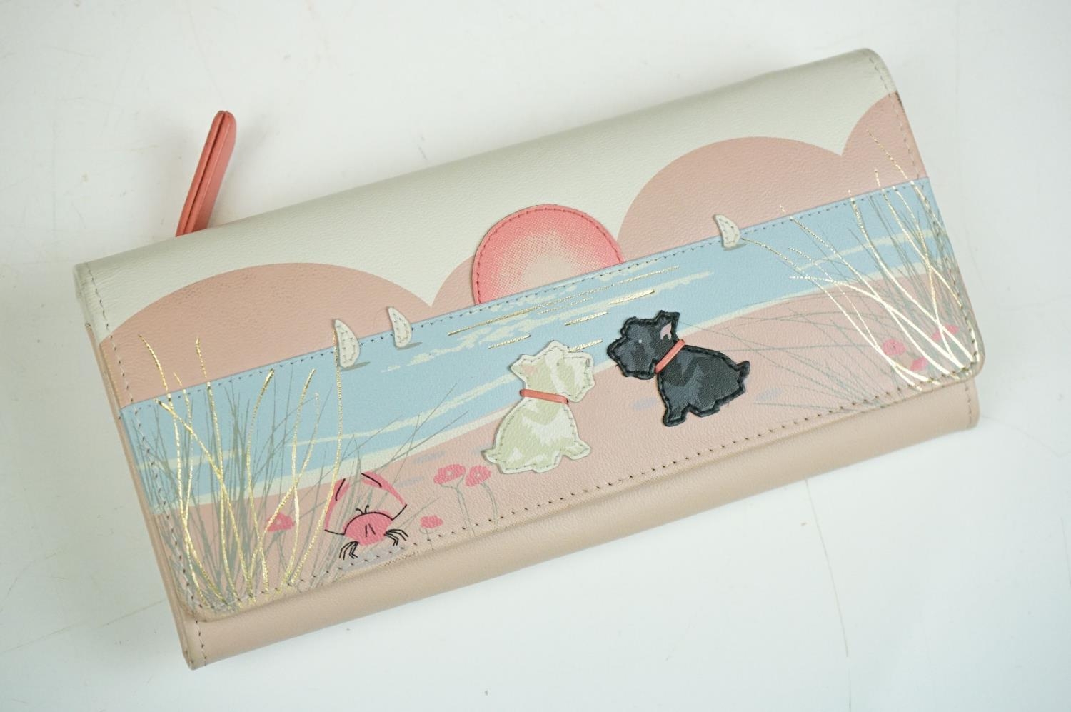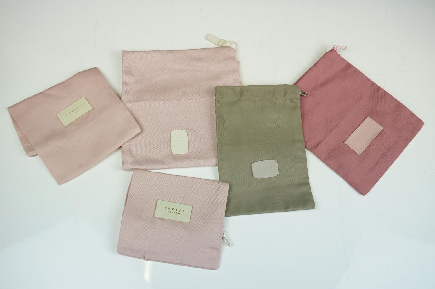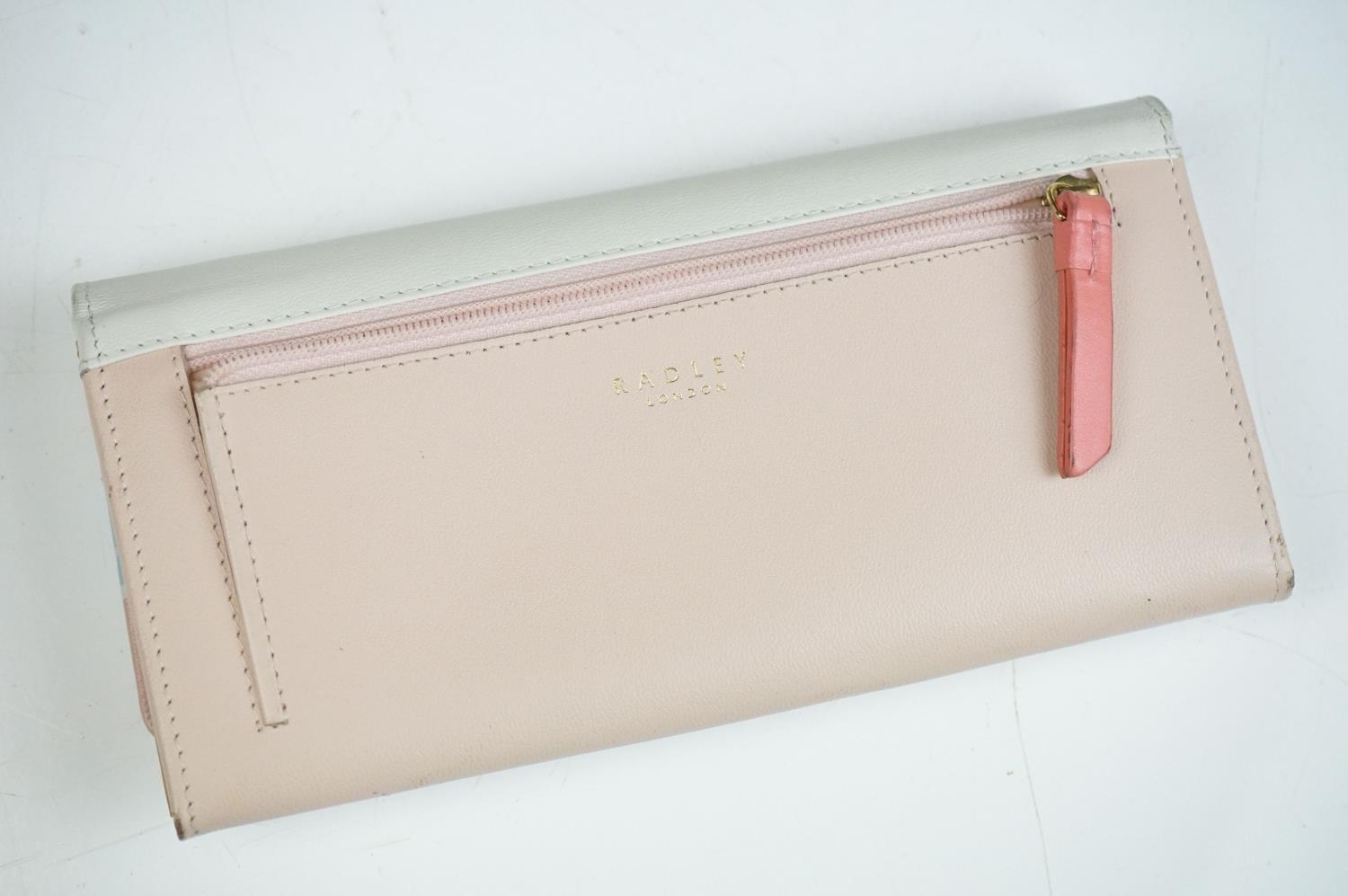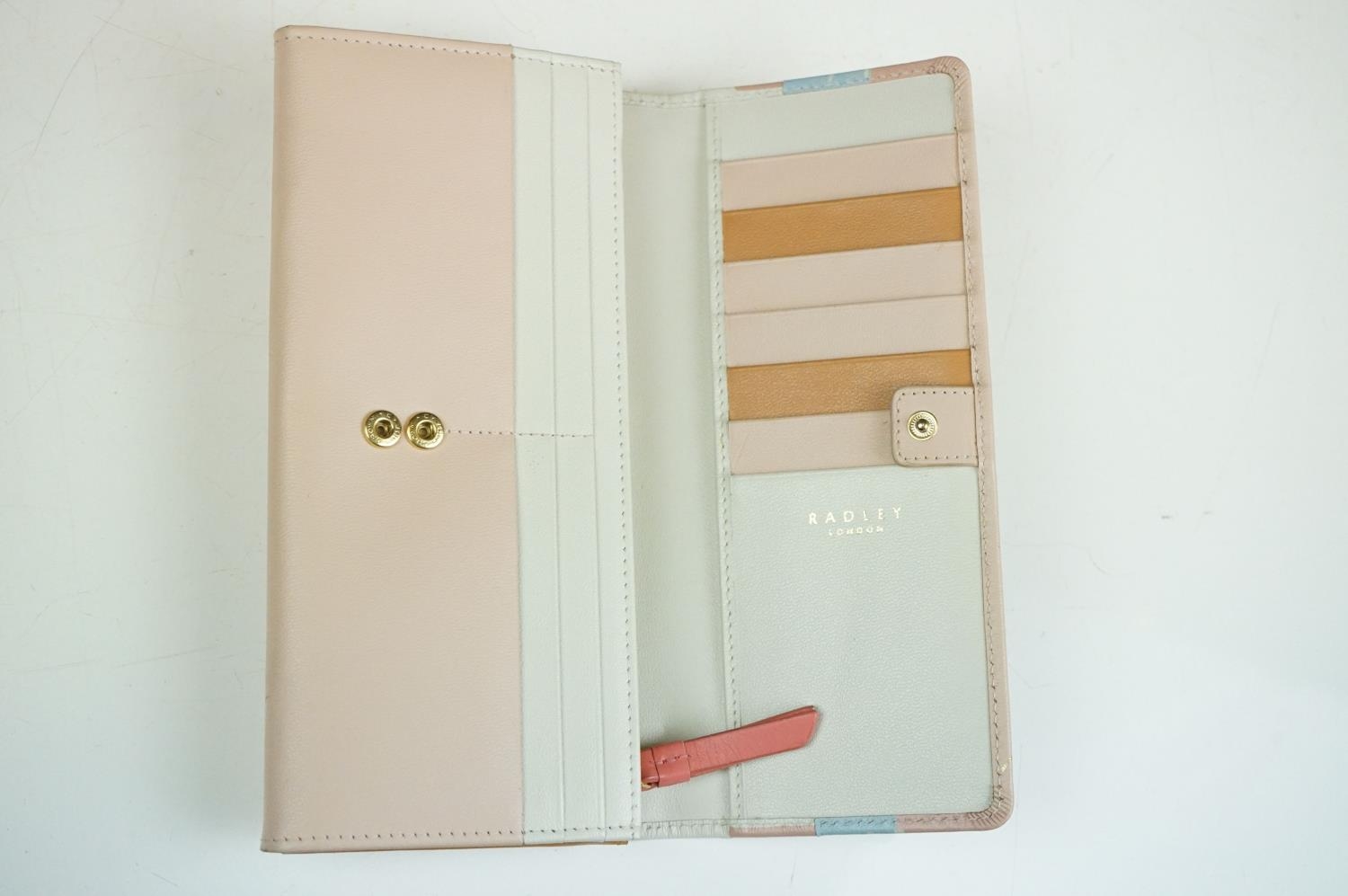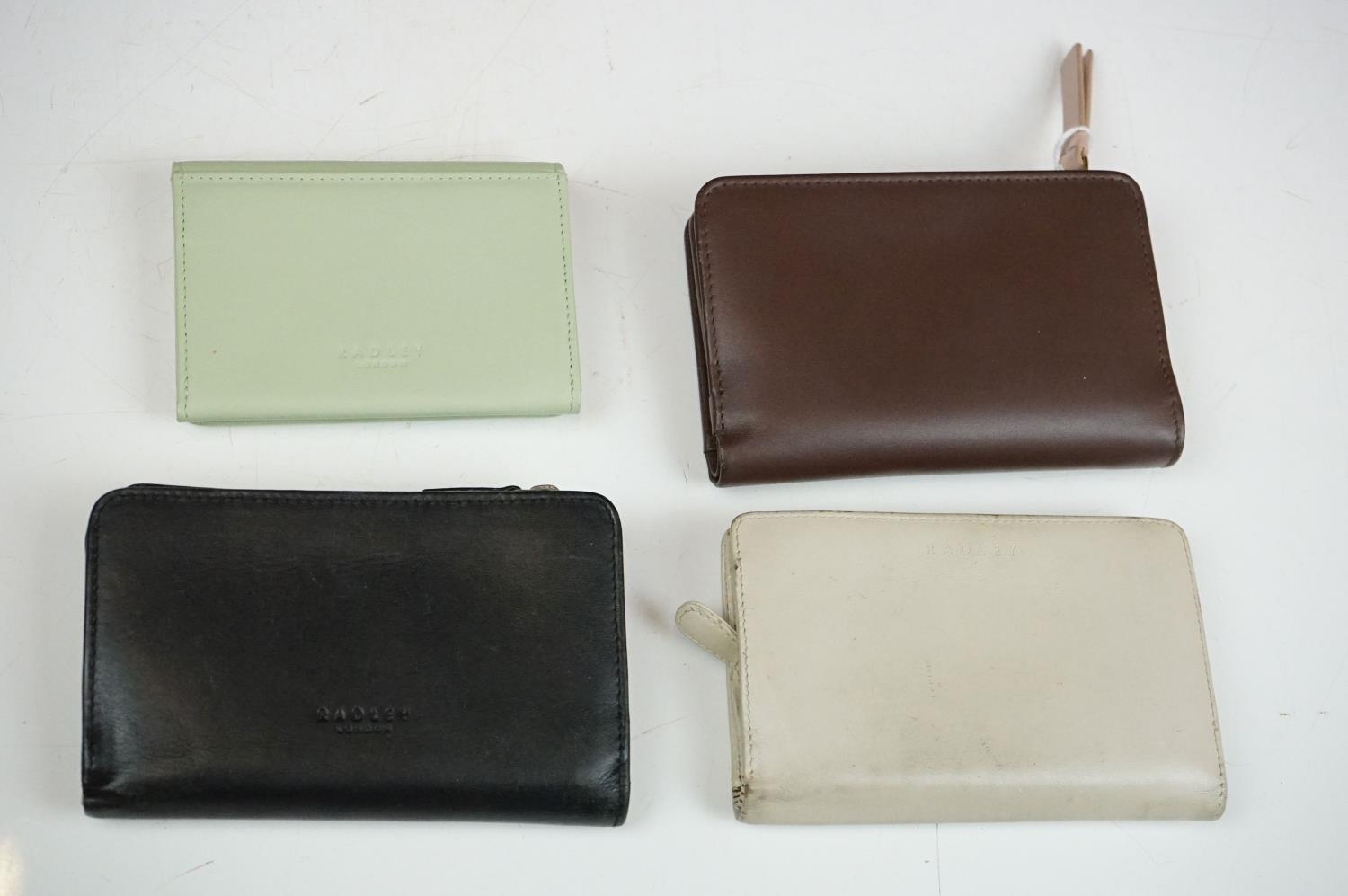 Collection of Seven Radley Leather Wallets / Purses including ‘ London Burgh Island ‘ design, ‘ Apples and Pears ‘ design and ‘ Soul full of sunshine ‘ design together with Three Radley Tags and a group of Dust Bags