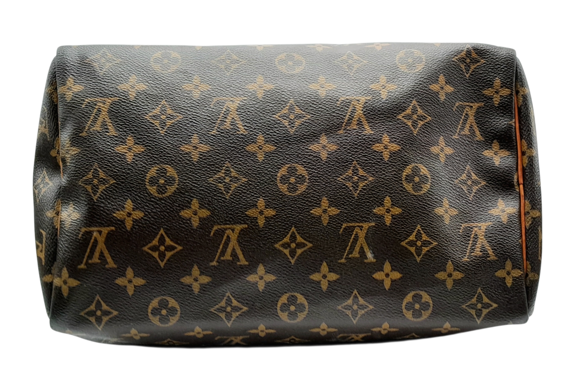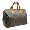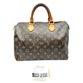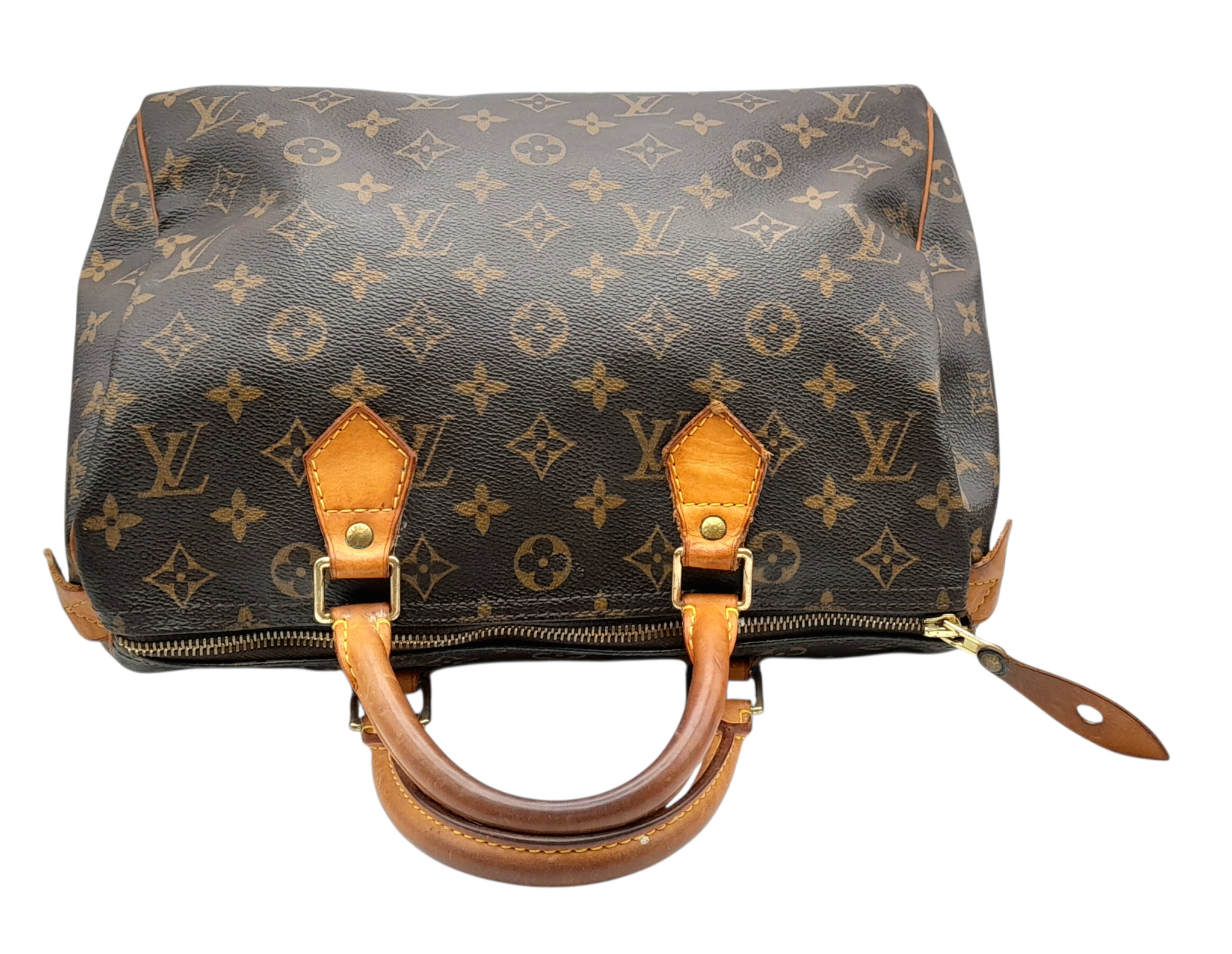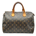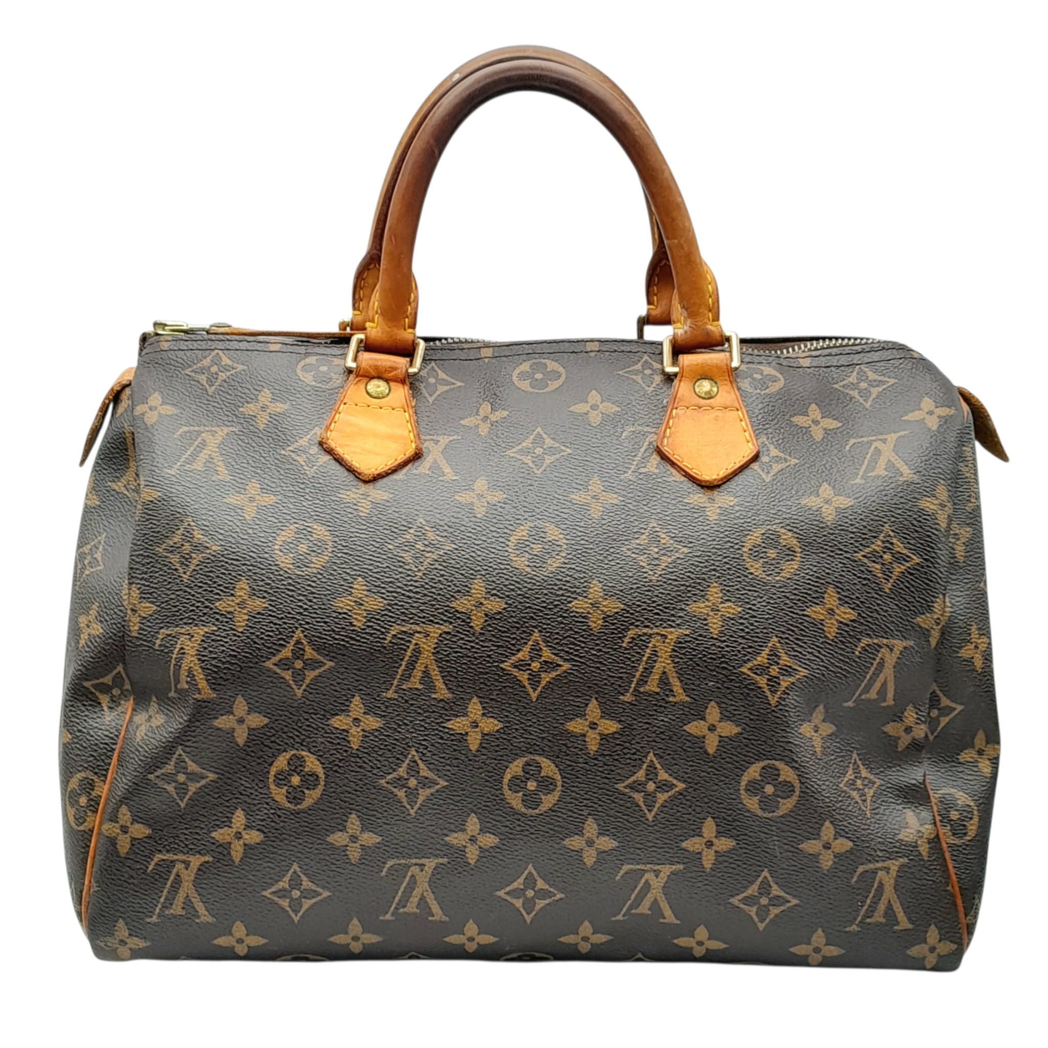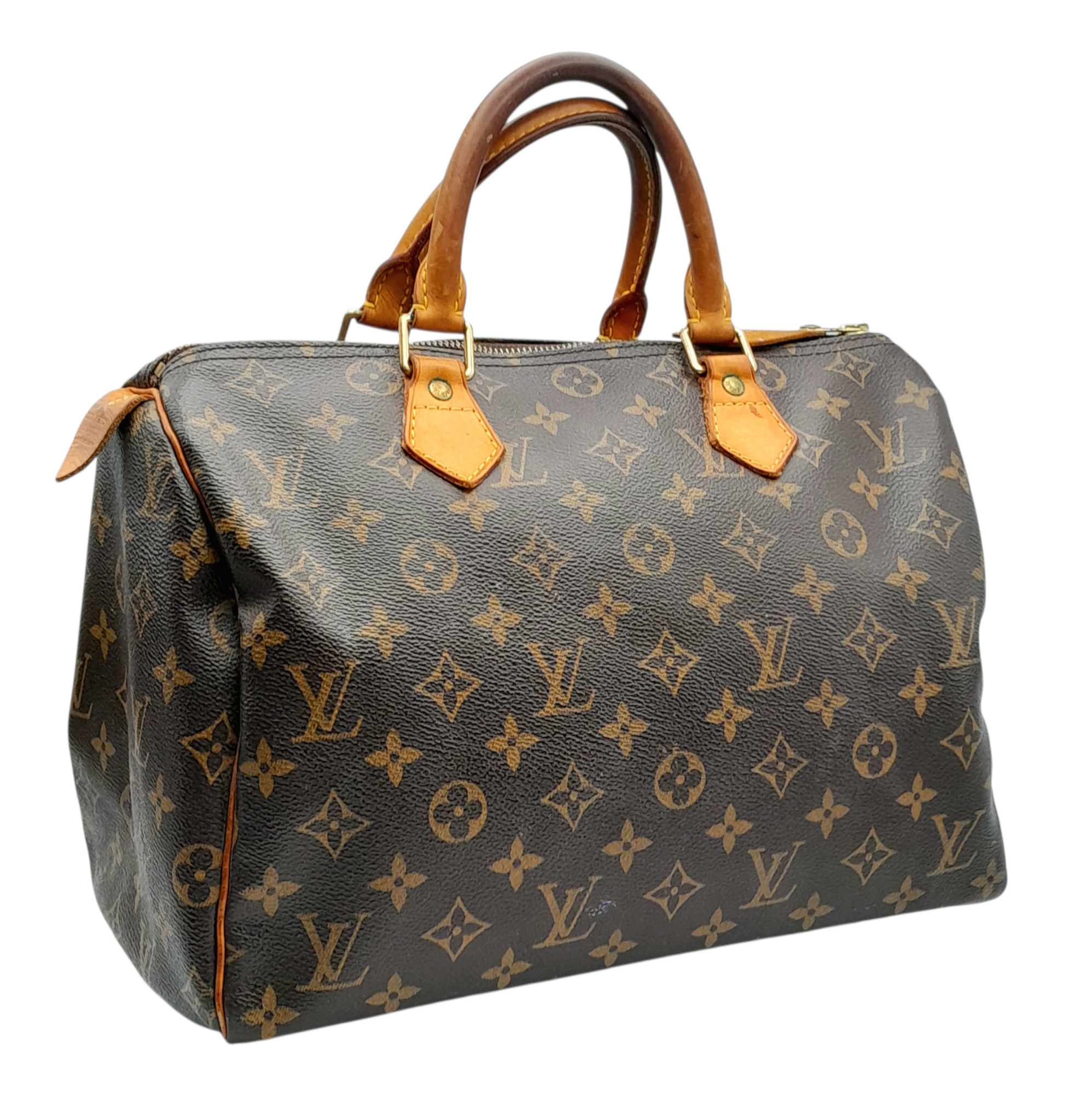 A Brown Louis Vuitton Monogram Speedy 30 Bag. Brown monogram coated canvas exterior with gold-toned hardware, rolled leather handles and zipped top closure. Brown textile-lined interior with a single main compartment and internal slip pocket. Some marks, signs of wear and tear to the leather. Approx 31cm length x 24cm height x 16cm depth. Comes with certificate of authenticity. Please see photos or request a condition report. Ref: 27390.
