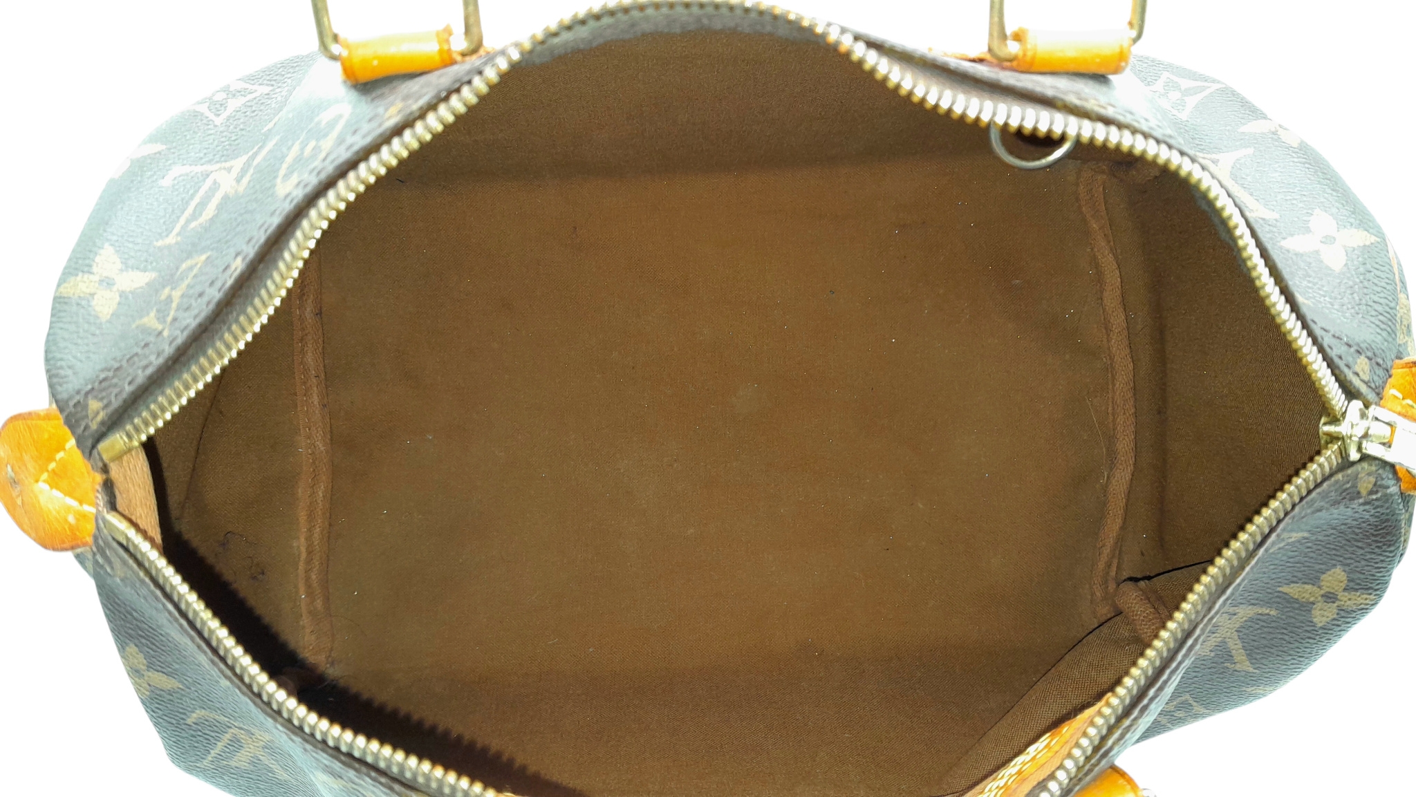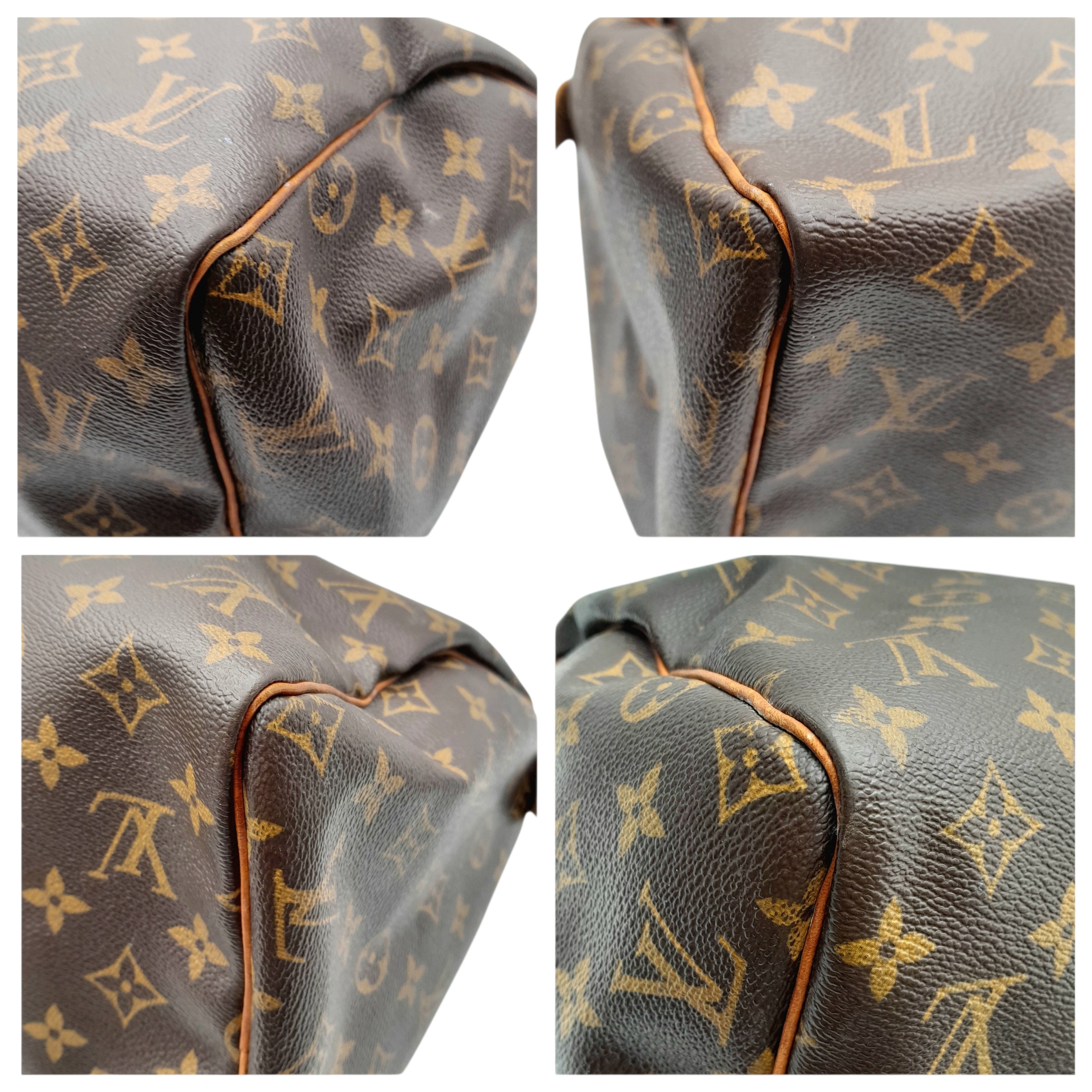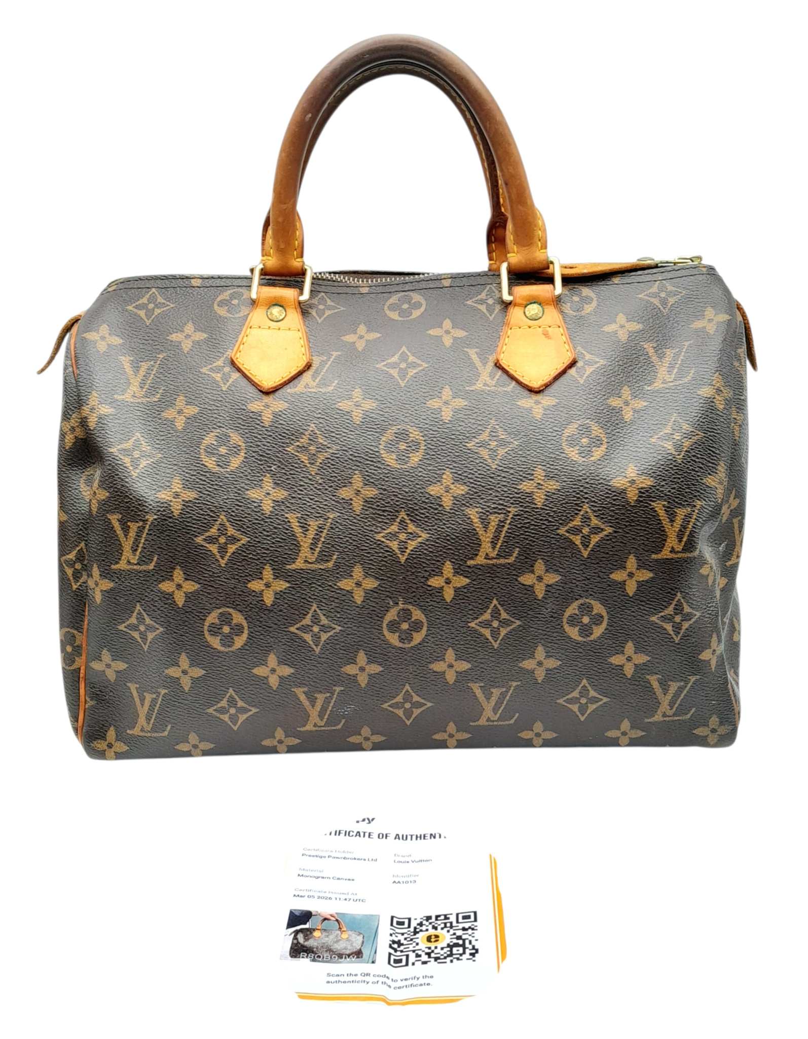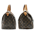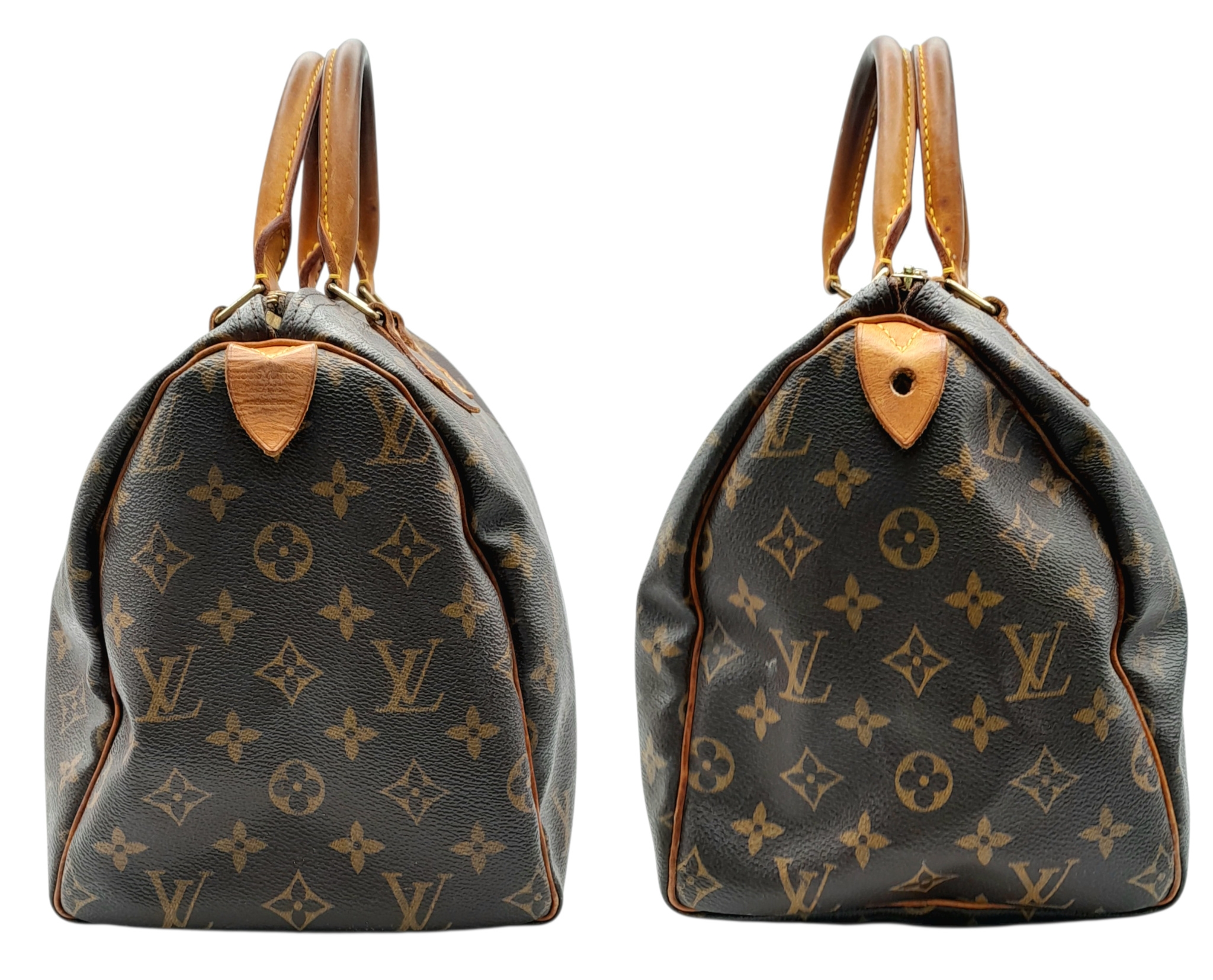 A Brown Louis Vuitton Monogram Speedy 30 Bag. Brown monogram coated canvas exterior with gold-toned hardware, rolled leather handles and zipped top closure. Brown textile-lined interior with a single main compartment and internal slip pocket. Some marks, signs of wear and tear to the leather. Approx 31cm length x 24cm height x 16cm depth. Comes with certificate of authenticity. Please see photos or request a condition report. Ref: 27390.