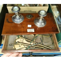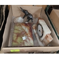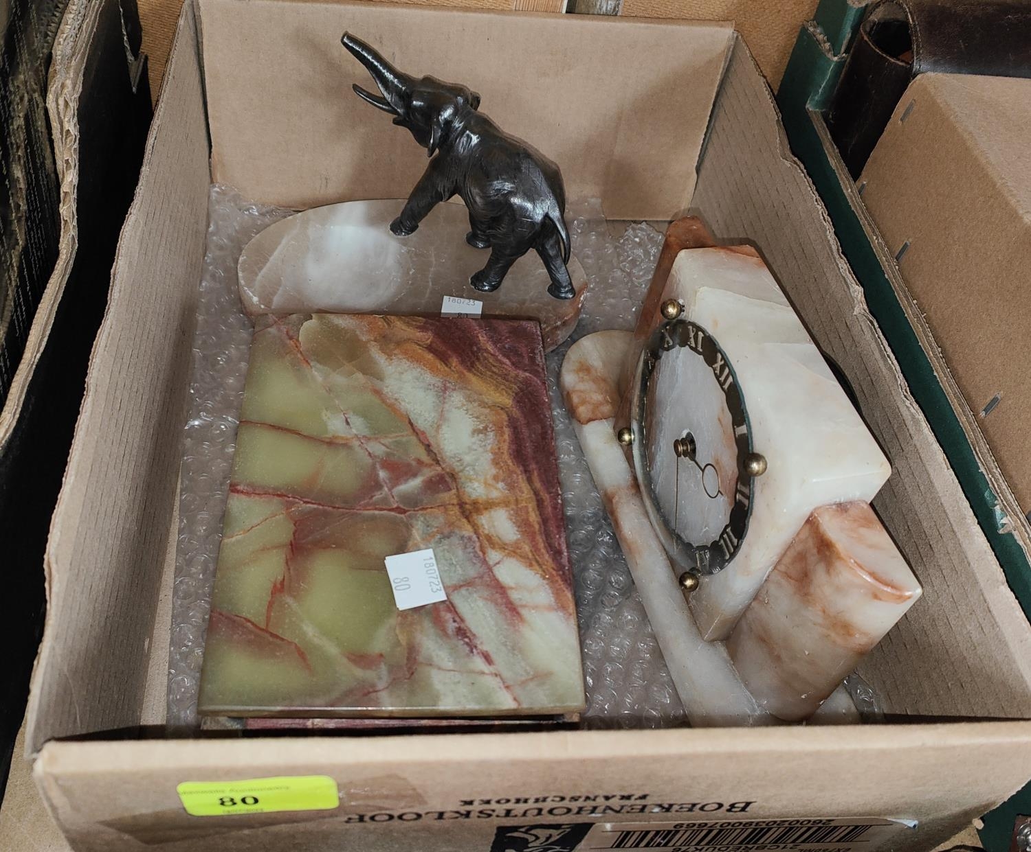 An Art Deco clock in alabaster case; an onyx jewellery box; a tray with elephant