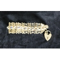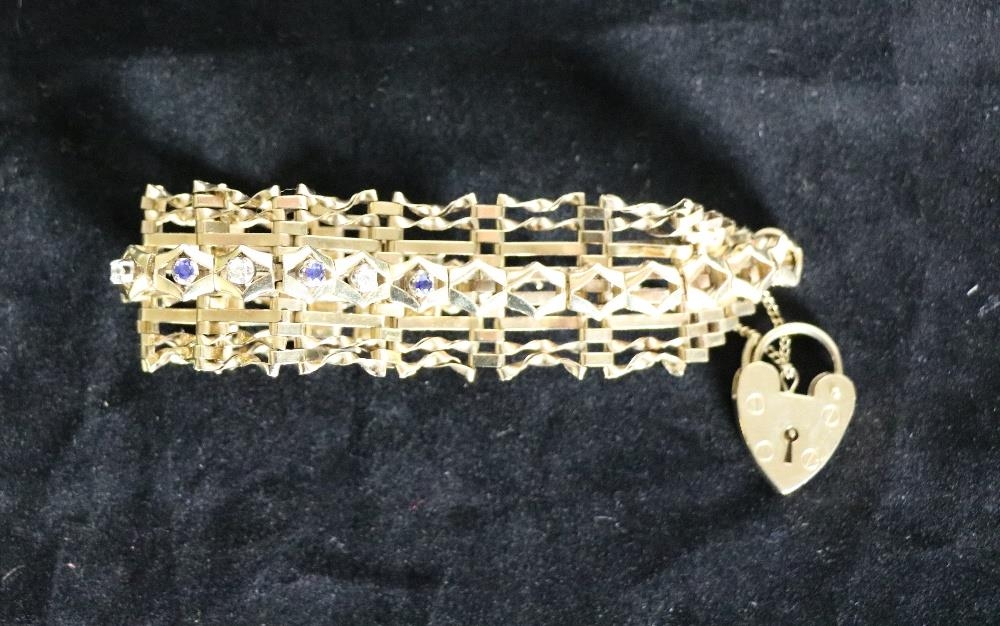 An attractive Edwardian 9ct gold shaped link Bracelet, set with sapphire and diamond type stones, and love heart shaped lock, approx. 43.5 gms. (1)