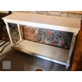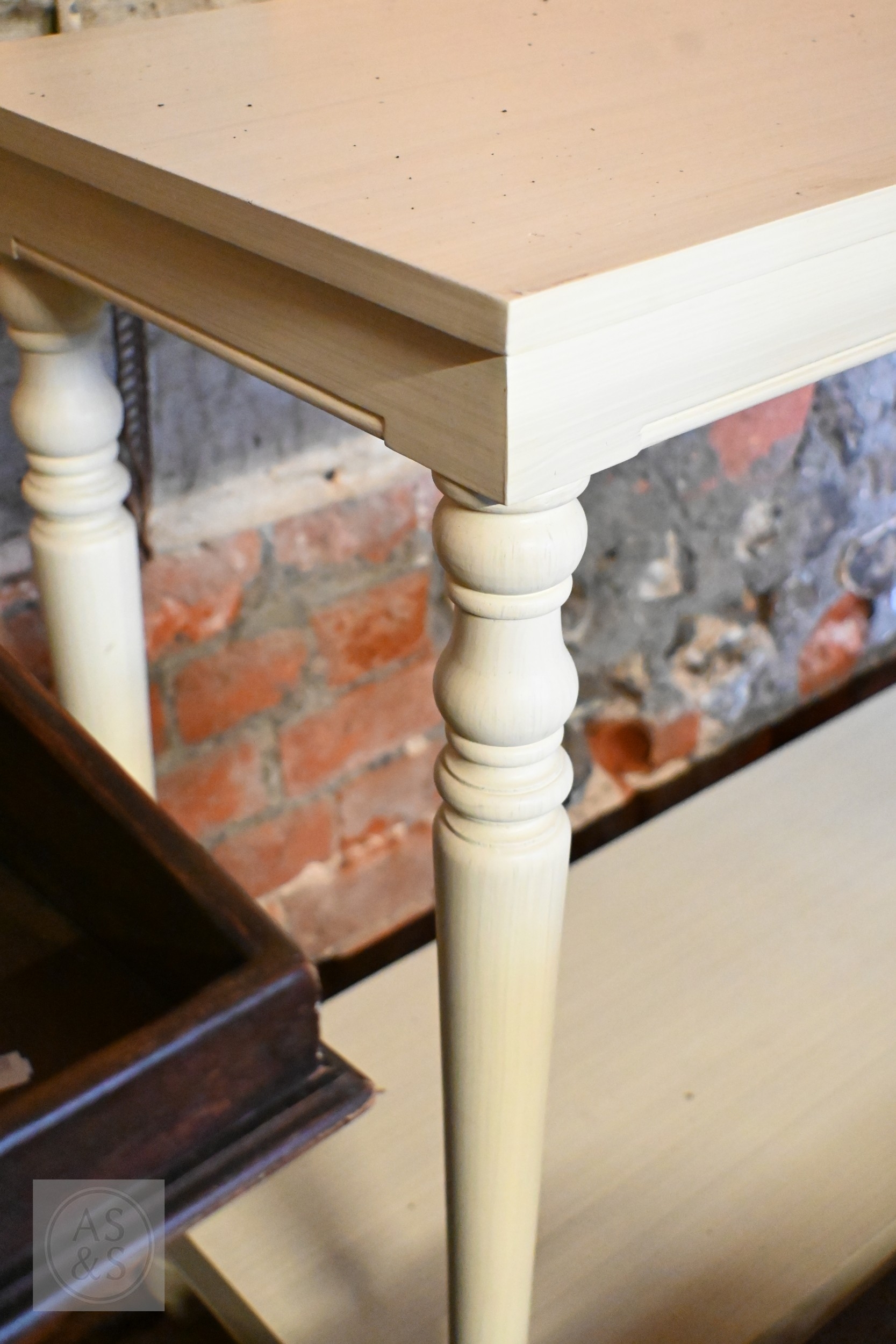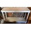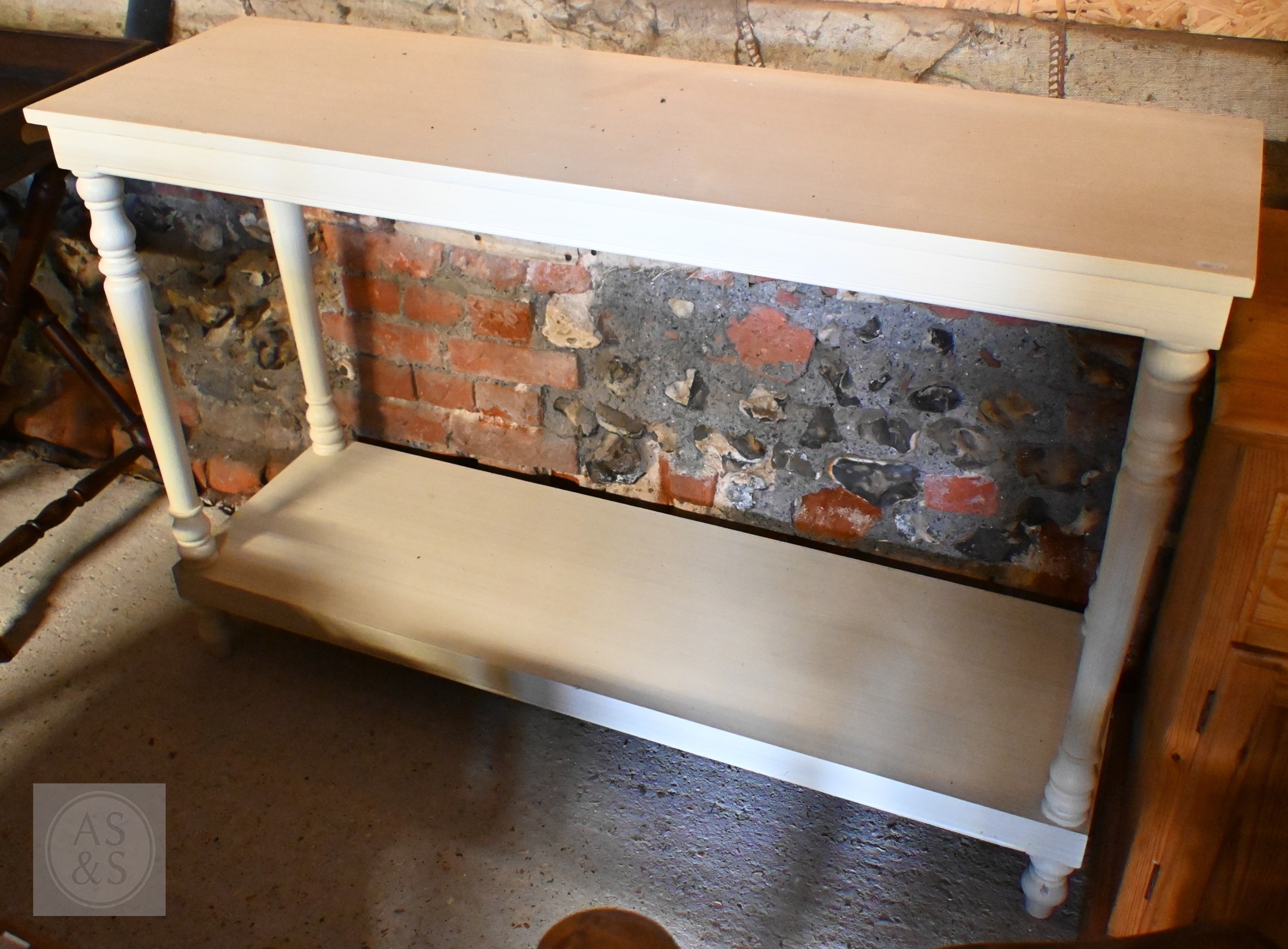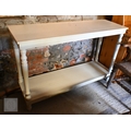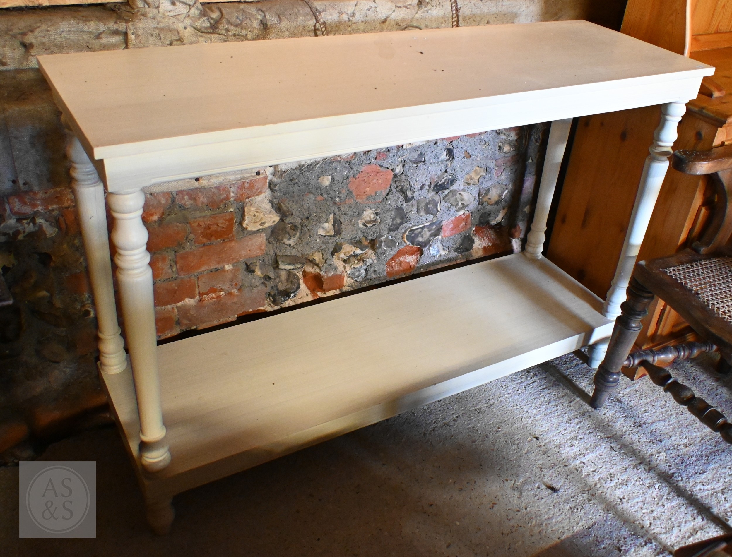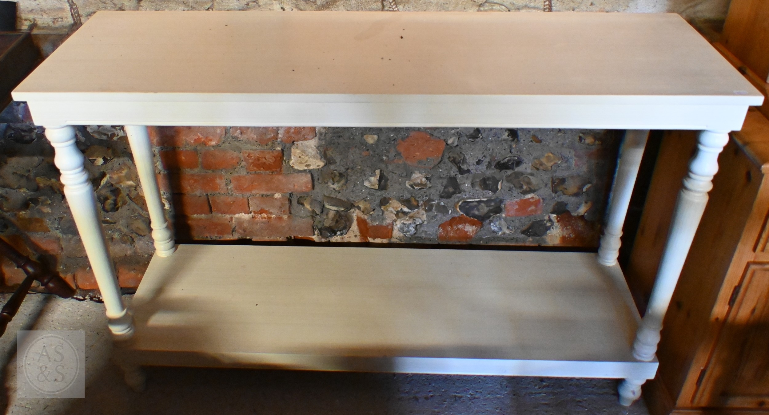 A modern cream-painted two-tier console table with turned supports, 130 x 40 x 86 cm high