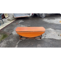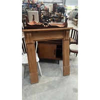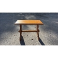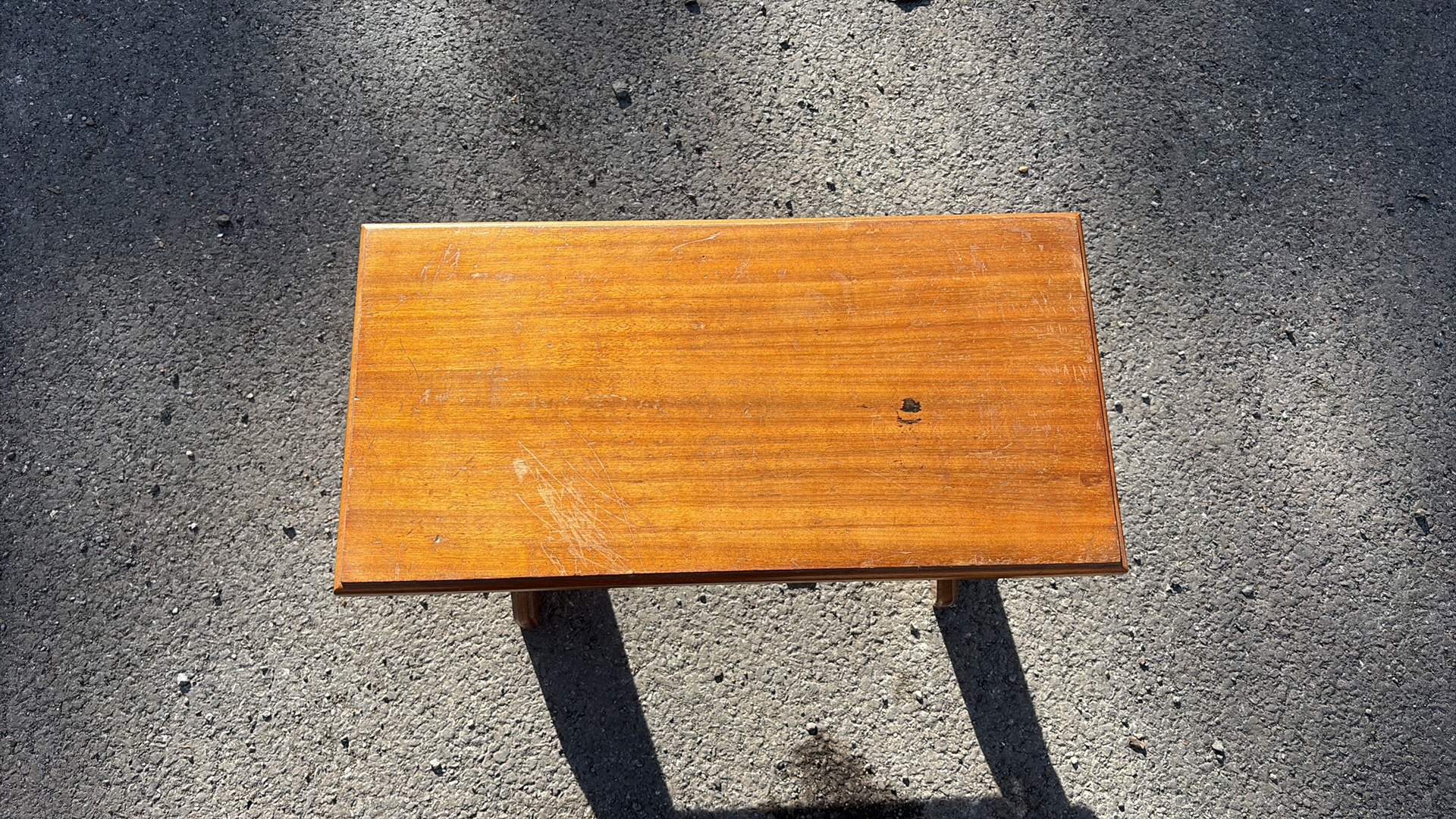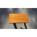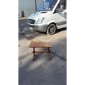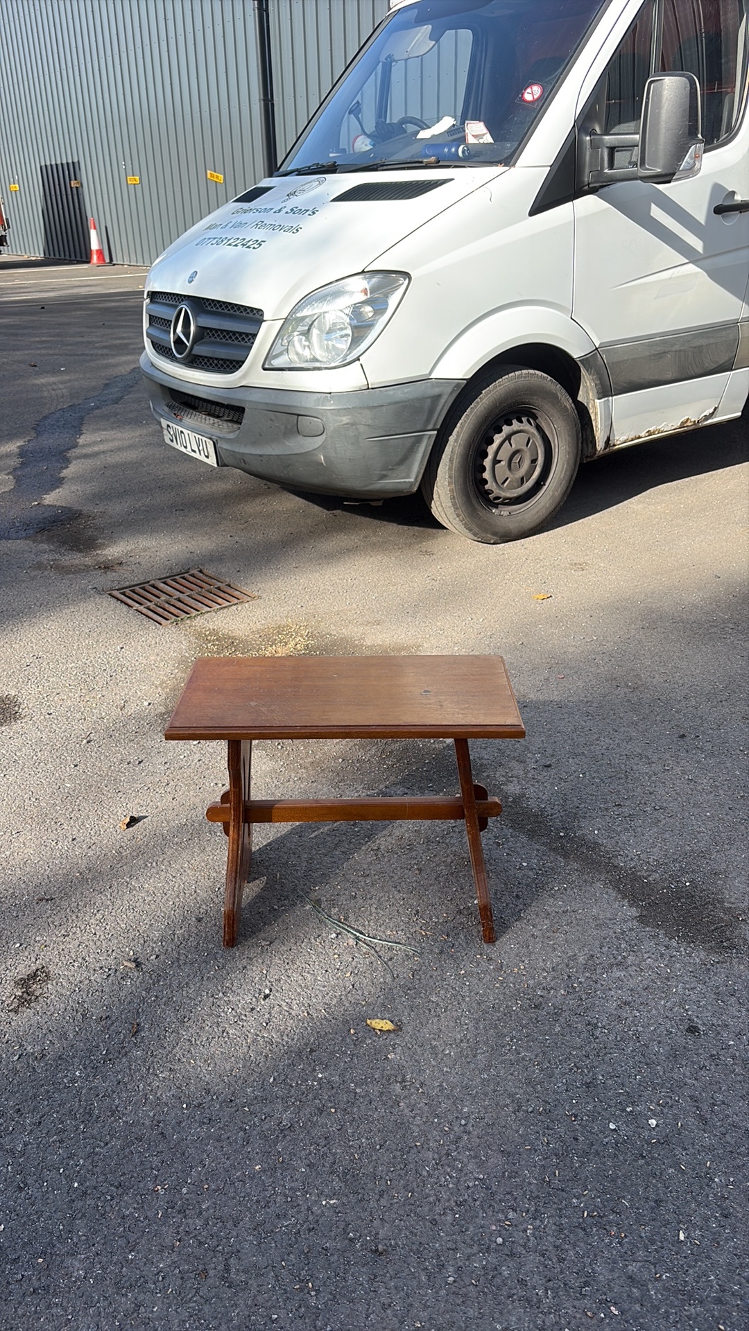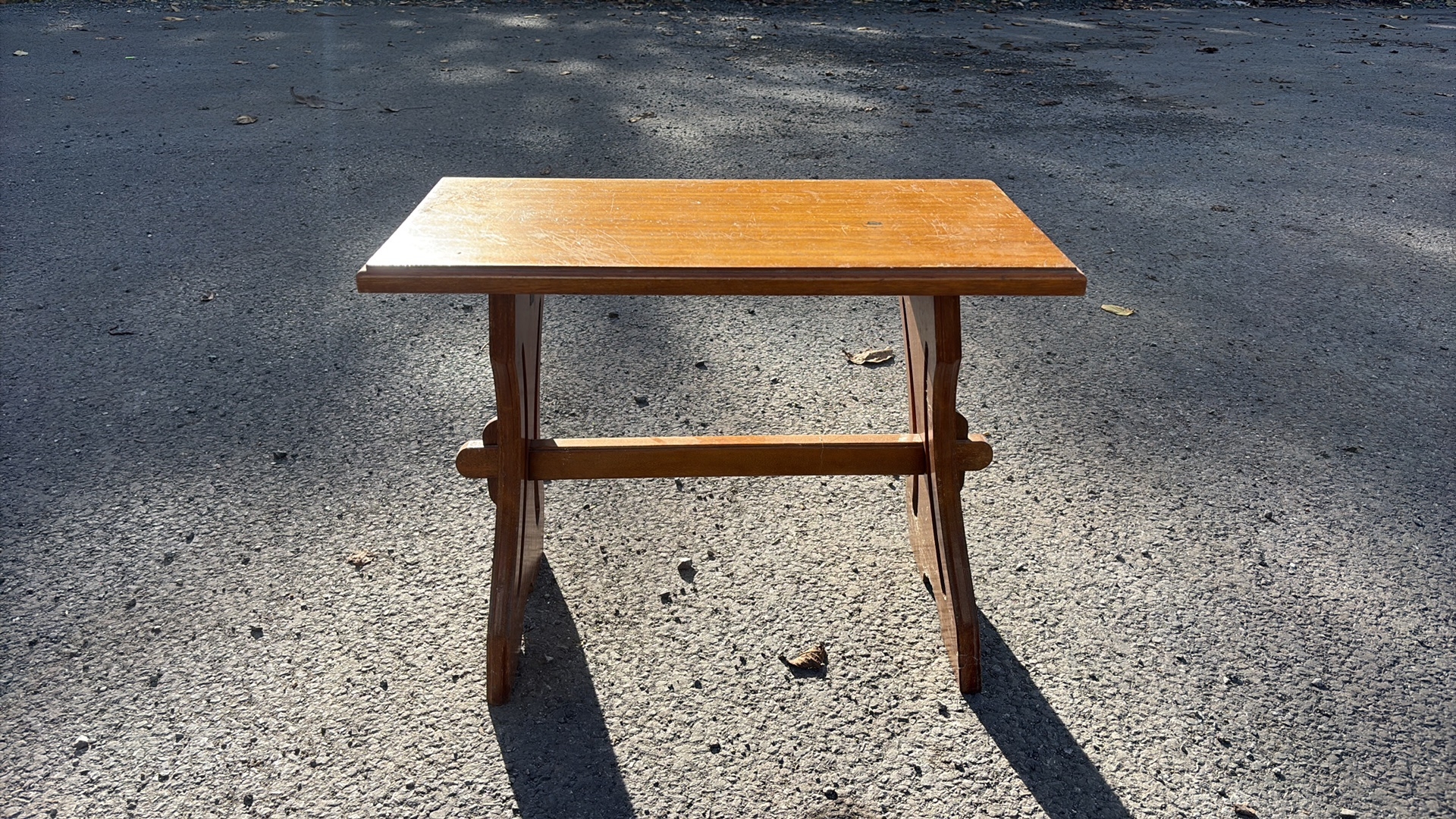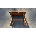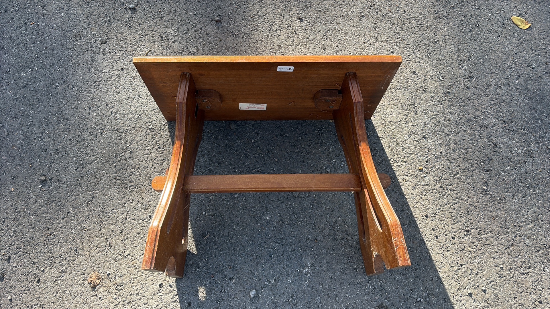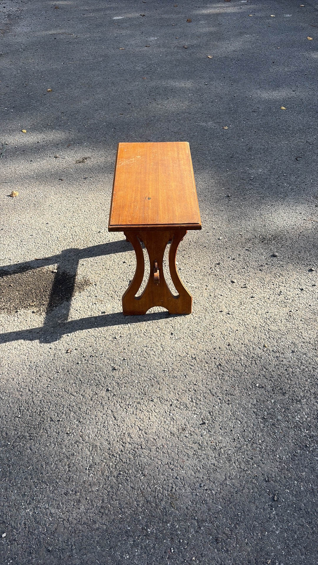 Small rectangular wooden footstool or low side table, trestle-style legs with cut-out detail and central stretcher, warm brown finish.