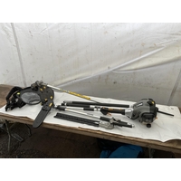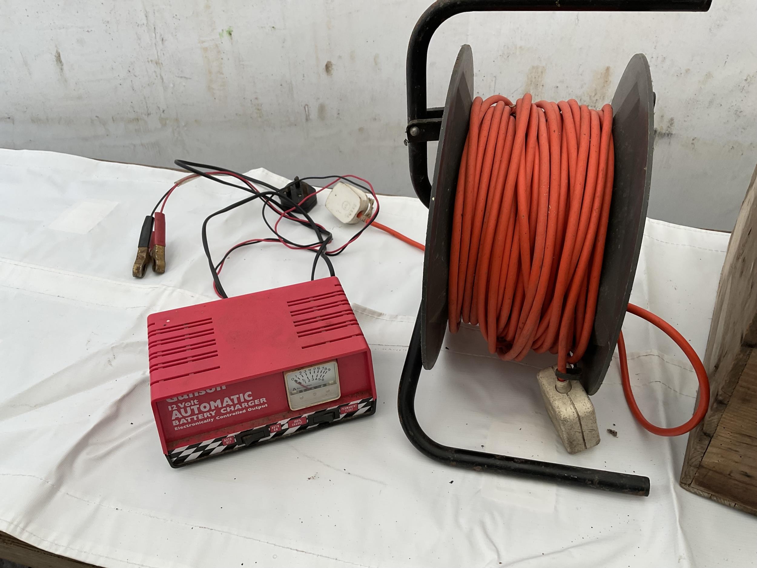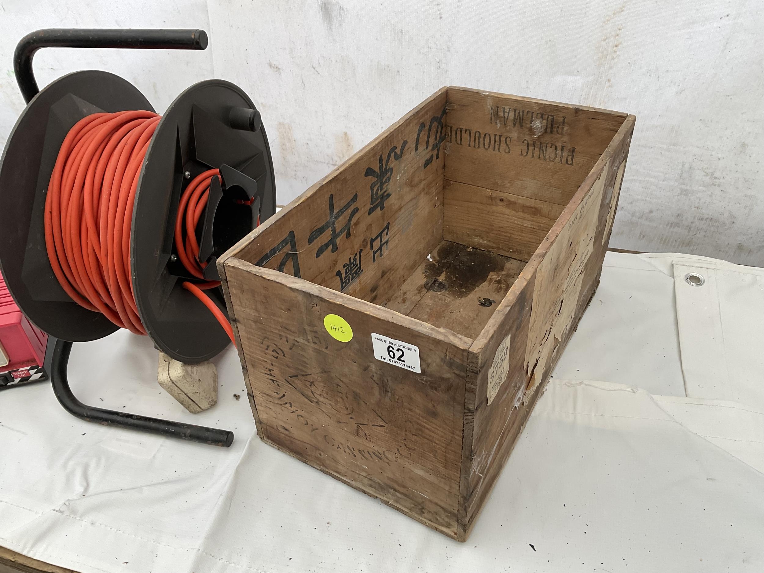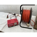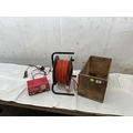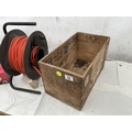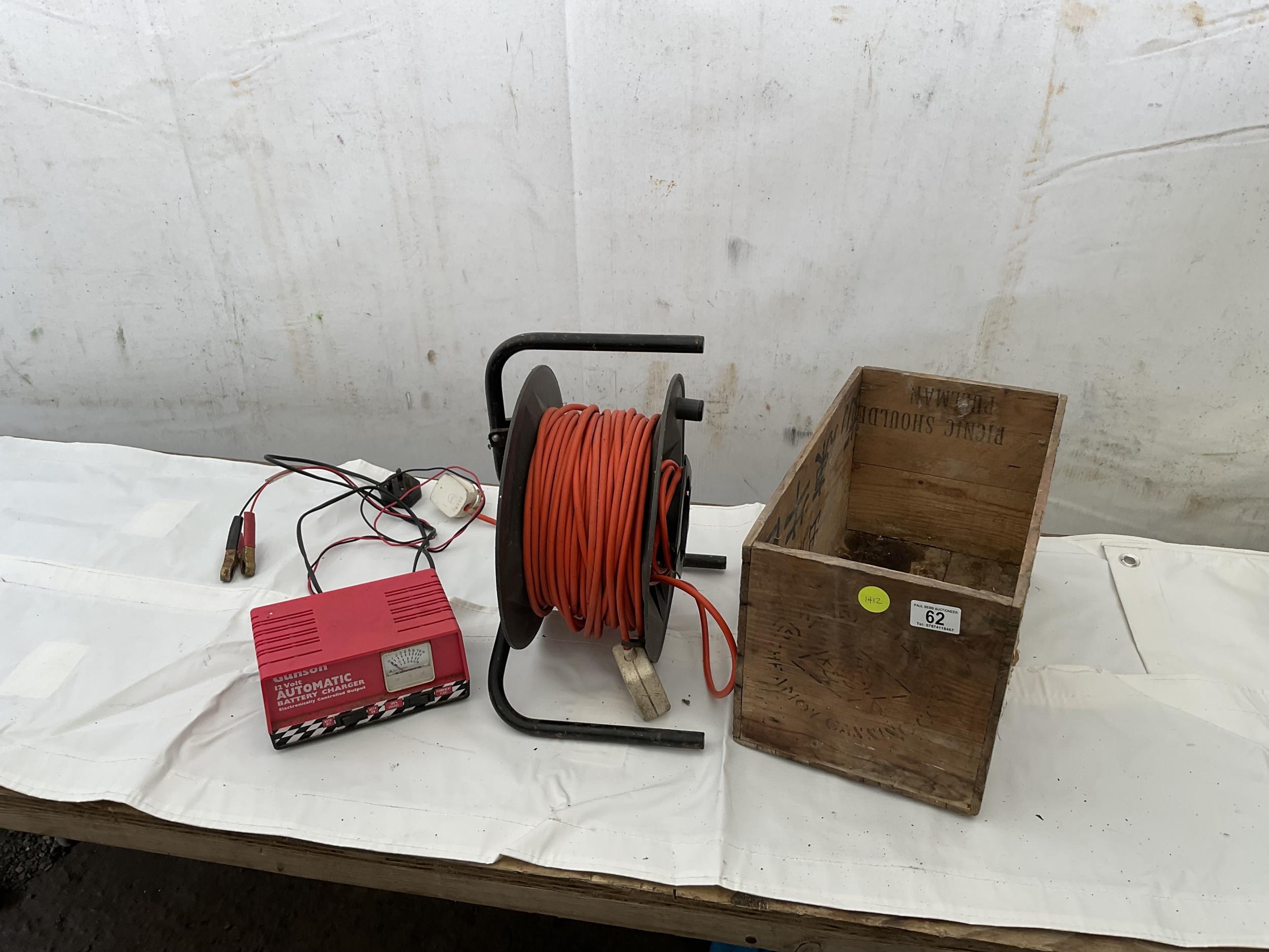 WOODEN BOX ELECTRIC EXTENSION LEAD ON REEL AND BATTERY CHARGER W/O