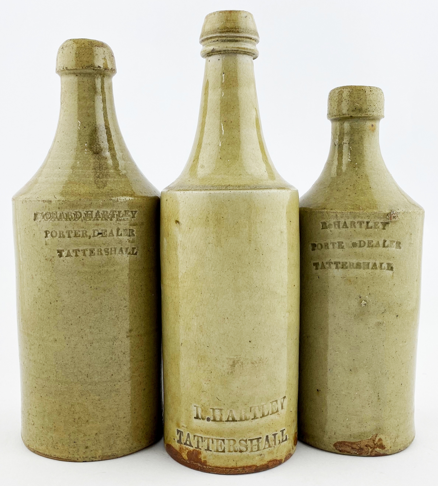 TATTERSHALL PORTER TRIO. Tallest 9ins. Green/ grey, impressed, R. HARTLEY & RICHARD HARTLEY. (3)