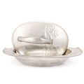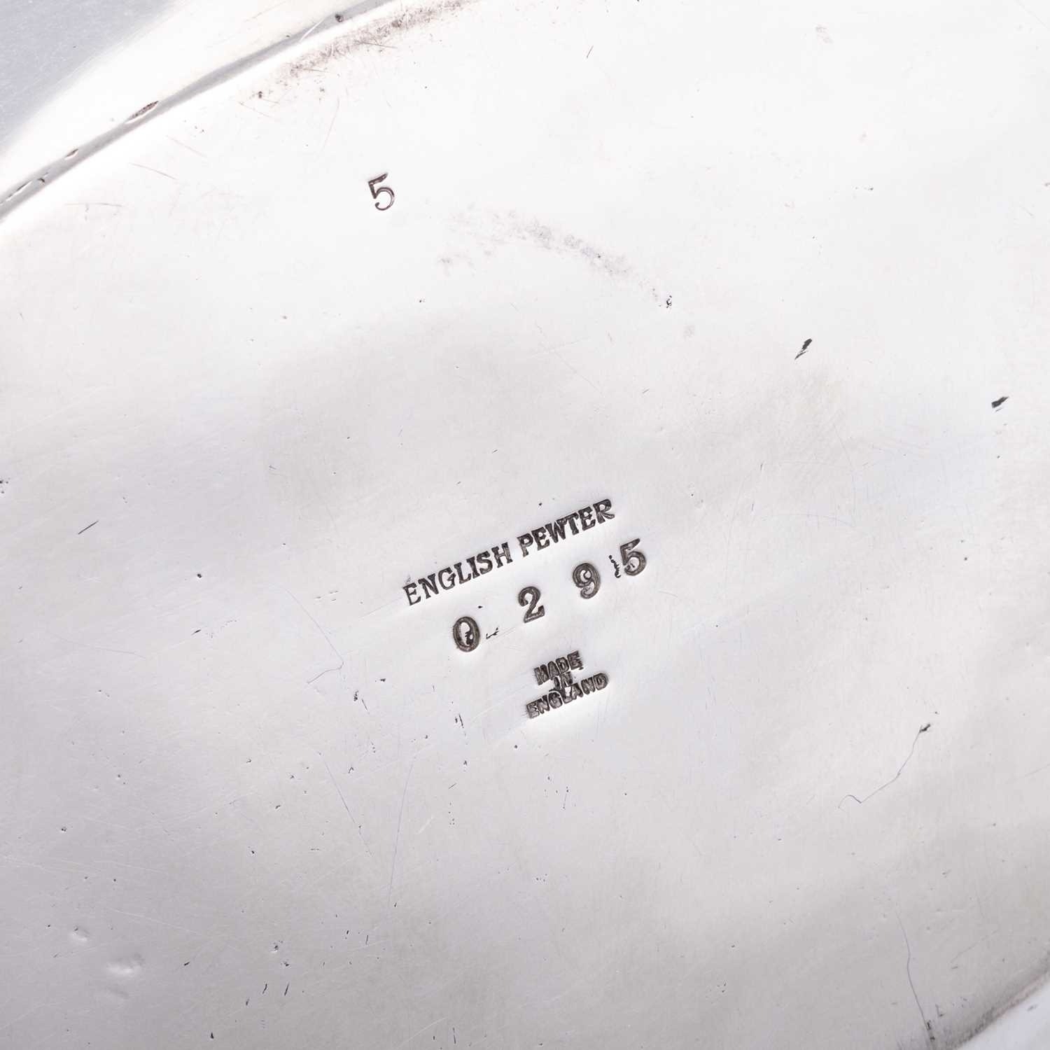 oval-shaped, the lift-off lidded cover decorated with stylised foliage, no. 0295, stamped ENGLISH PEWTER. 26.3cm wide