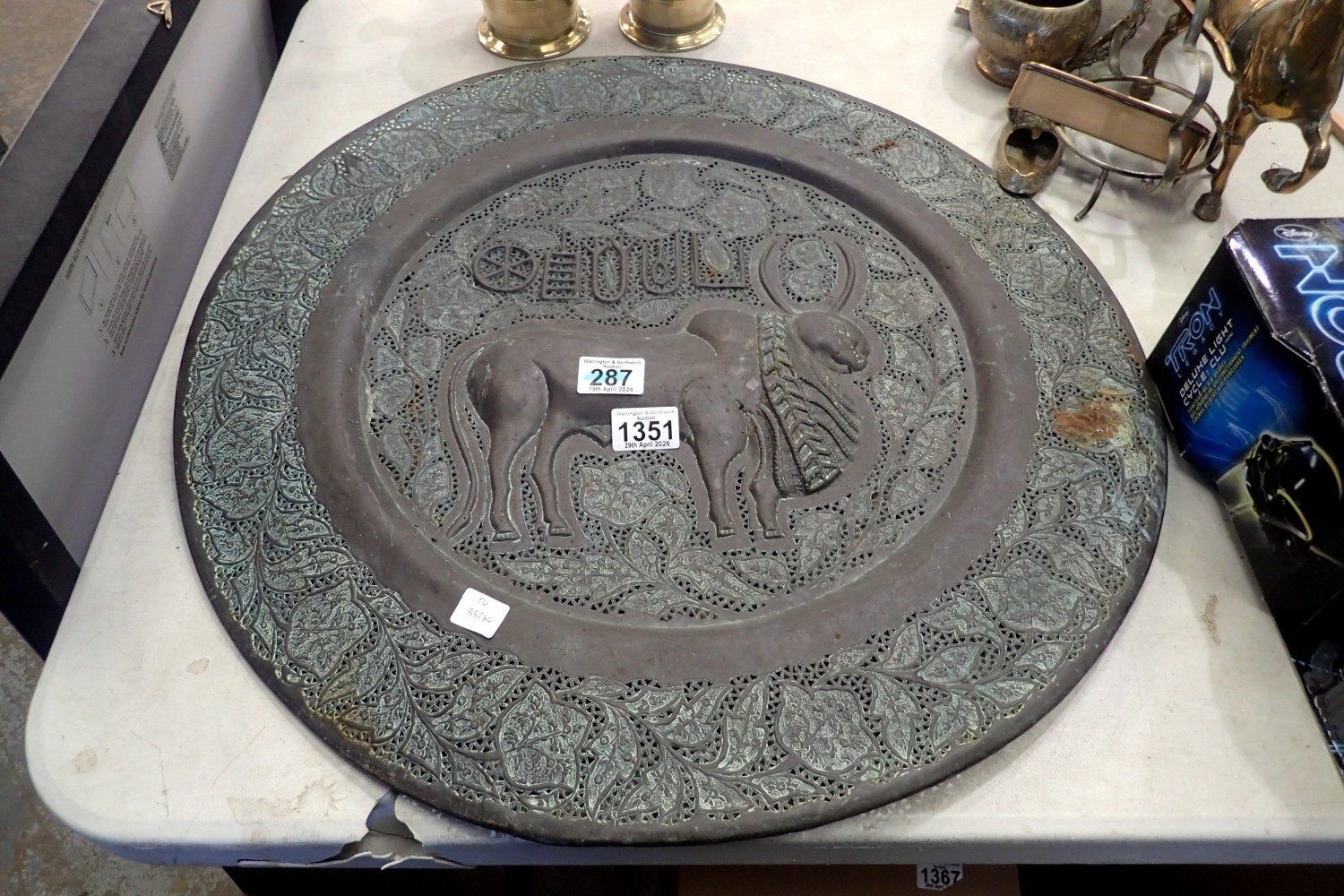 Large Iranian pierced brass wall plaque, decorated with bull, D: 60 cm. UK P&P Group 2 (£24+VAT for the first lot and £5+VAT for subsequent lots)