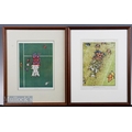 1931/1944 Punch Rugby Prints by Fougasse (2): In 16 x 13 frames, Kenneth Birds colourful cartoons of an E v W Twickenham scrum from the air (just as seen in reality today from the spider cam!), and of a wartime touchliner eyeing a lively scrum and reflecting that, tho in 1944, its just like peacetime. Ideal for den, office or club. Excellent