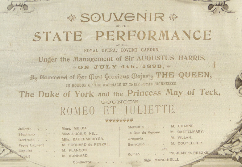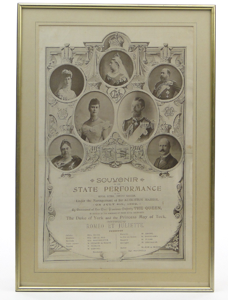 1893 silk souvenir State Performance Royal Opera sheet, mounted and framed, 49cm x 31cm