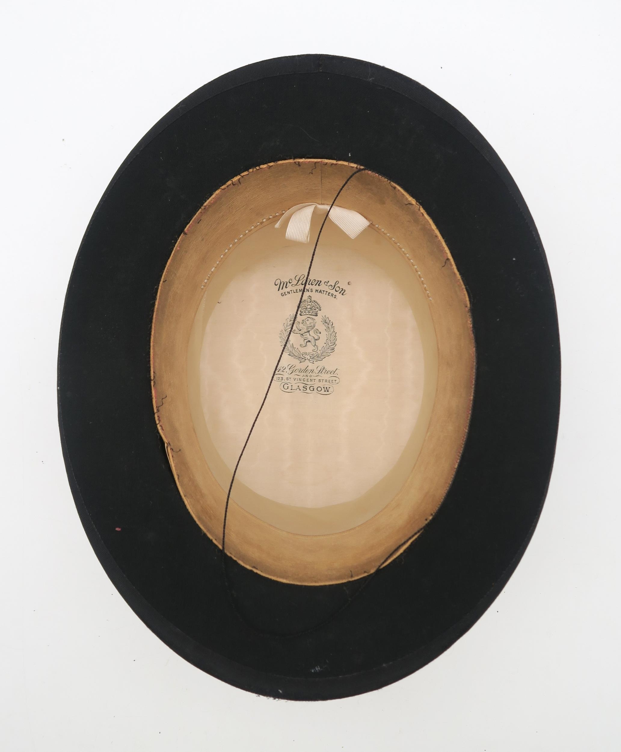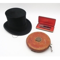 A silk top hat, small size, by McLaren & Son, Gentlemen's Hatters, Glasgow, measuring approx. 19.4cm front-to-back and 15.3cm side-to-side internally; together with a 30m leather-cased Rabone Chesterman tape measure, a Parker ballpoint pen and one other