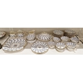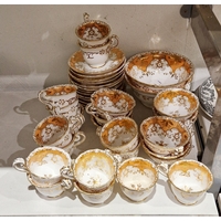 Coalport bone china seaweed pattern part breakfast service, circa 1890, printed green factory marks, retailer's marks for T Goode & Co, London, pattern no.5387/B, printed in navy blue with trailing seaweed, within radiating gilt panel borders, comprising a muffin dish and domed cover, two two-handled shaped square plates, two large milk jugs, another smaller, a slop bowl, sugar bowl, two plates, 11 teacups, 11 saucers and 12 side plates