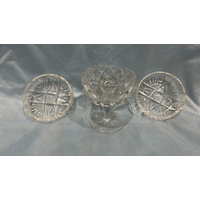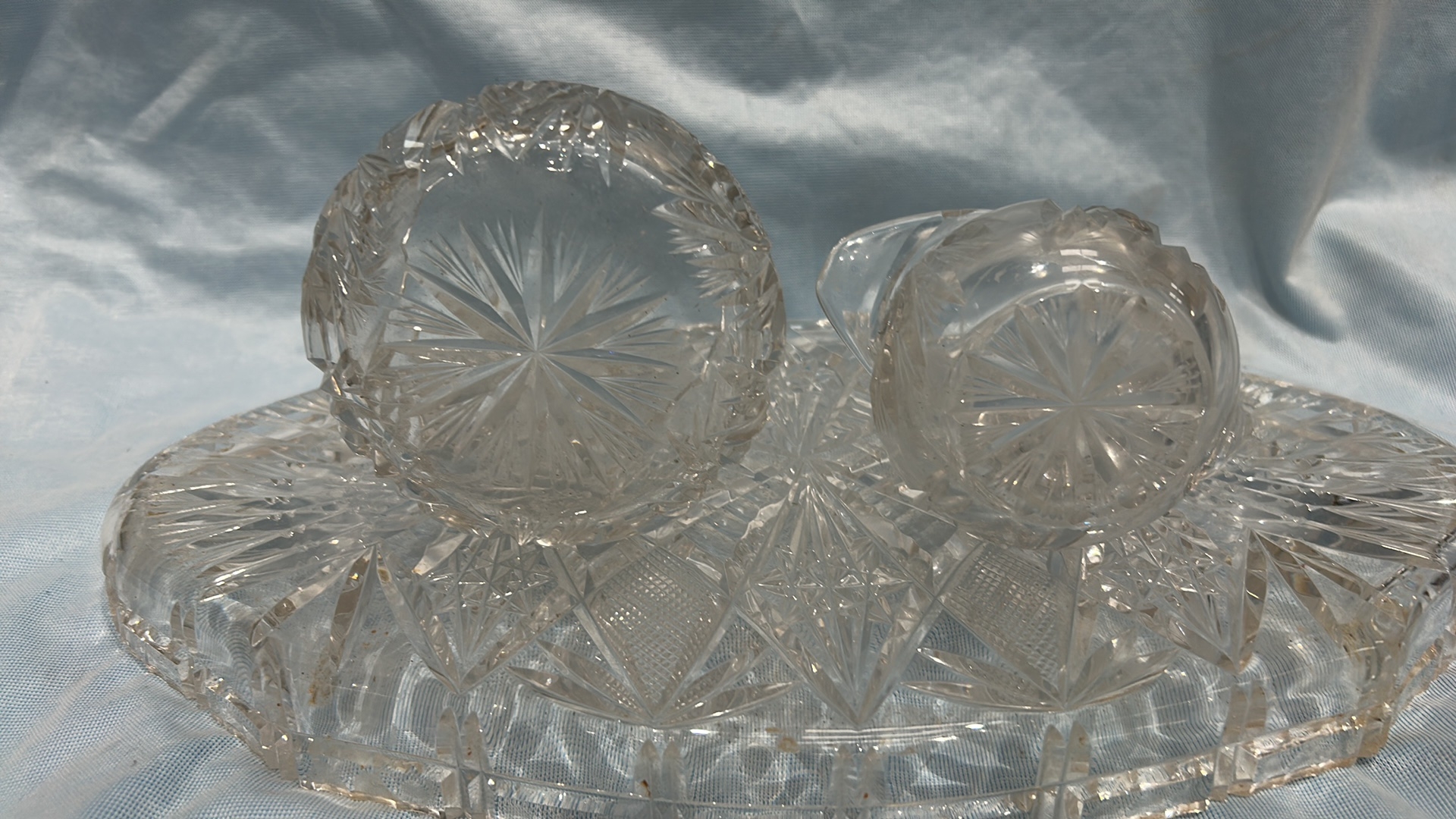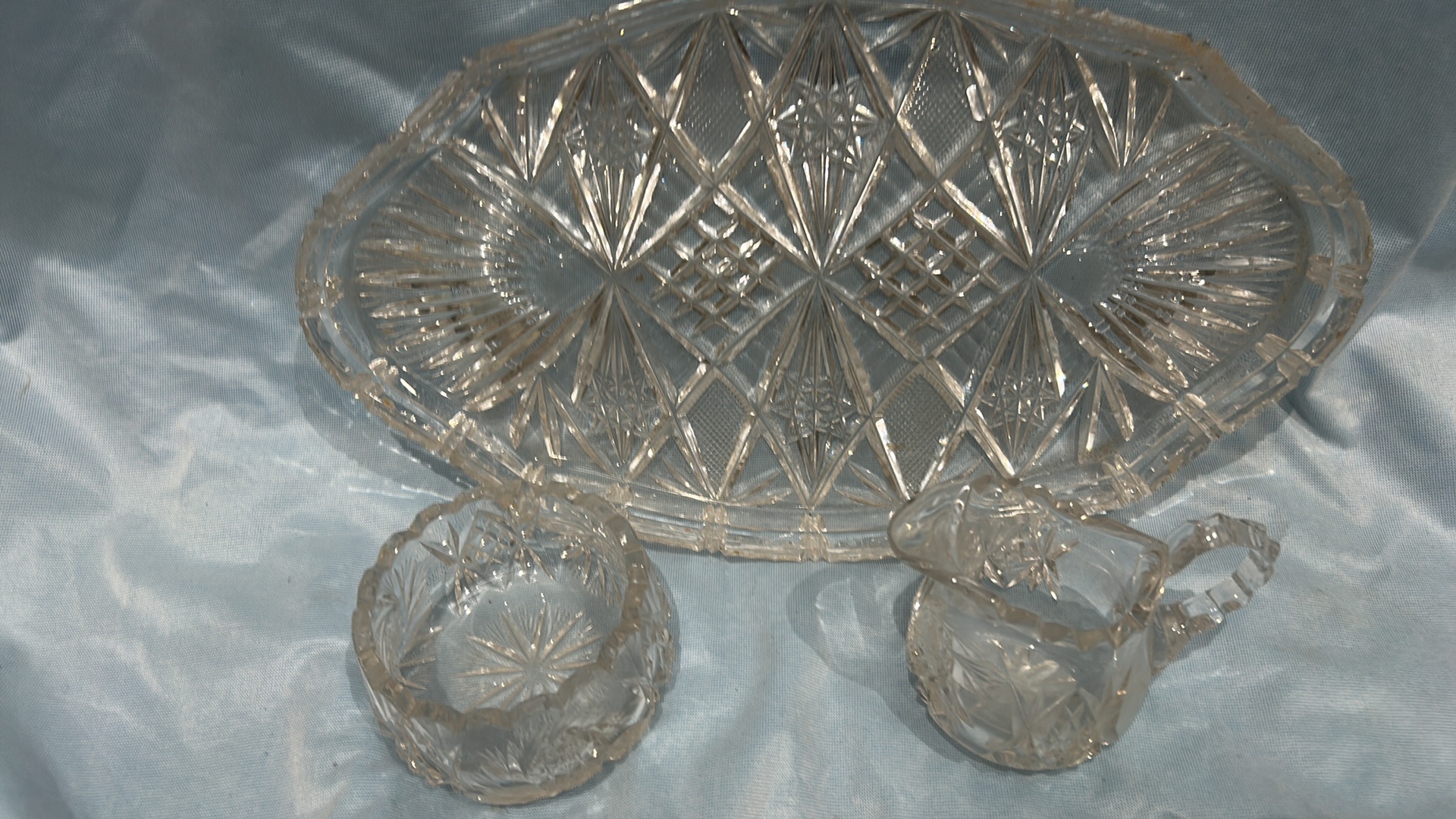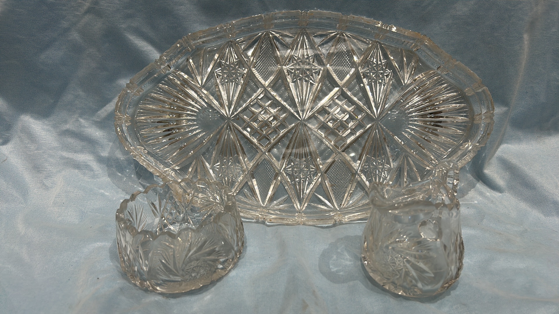 Three-piece pressed glass serving set, comprising an oval diamond-cut tray, scalloped circular bowl and small cream jug, each decorated with starburst and hobstar motifs.