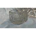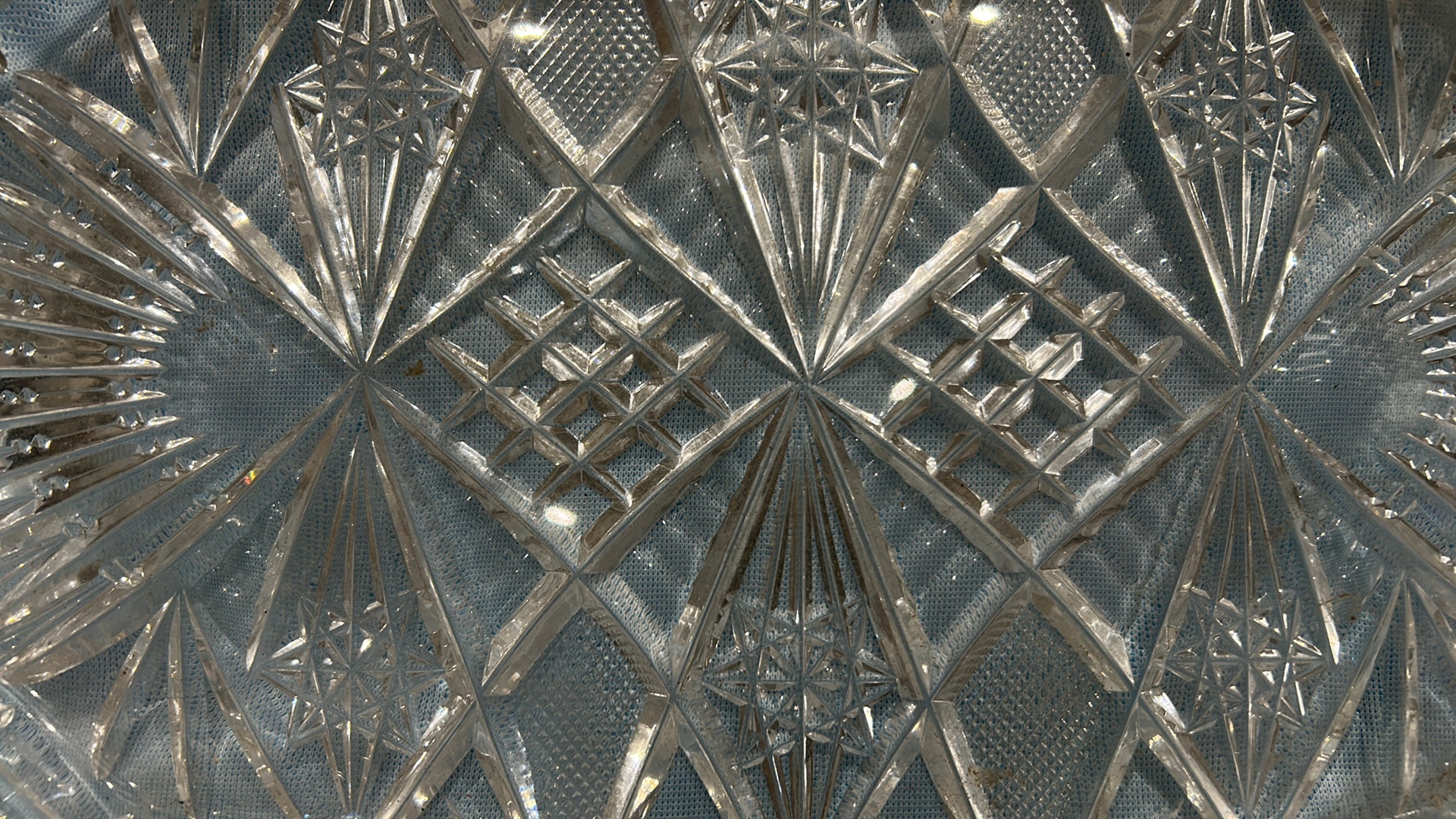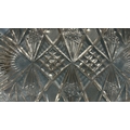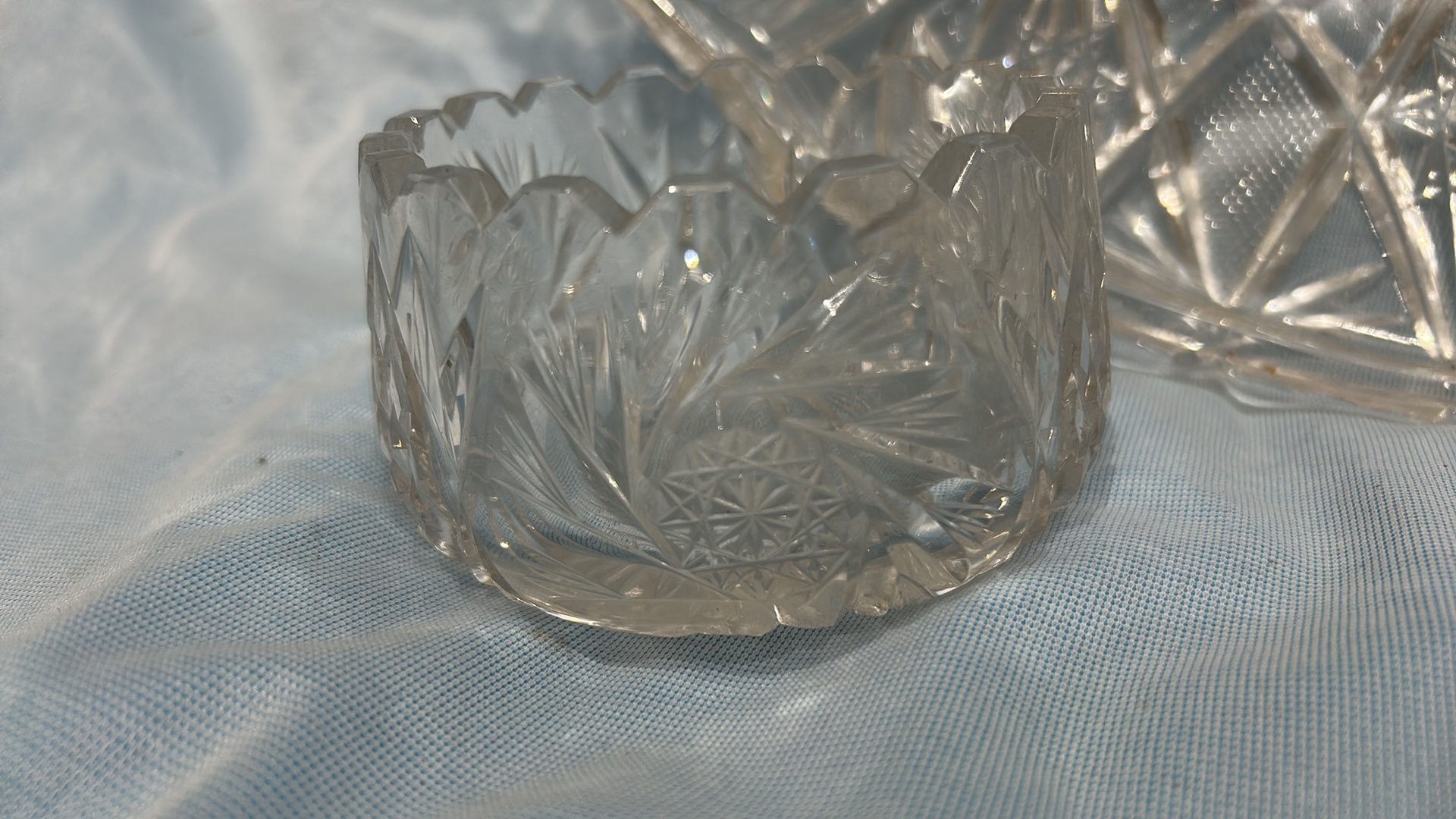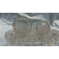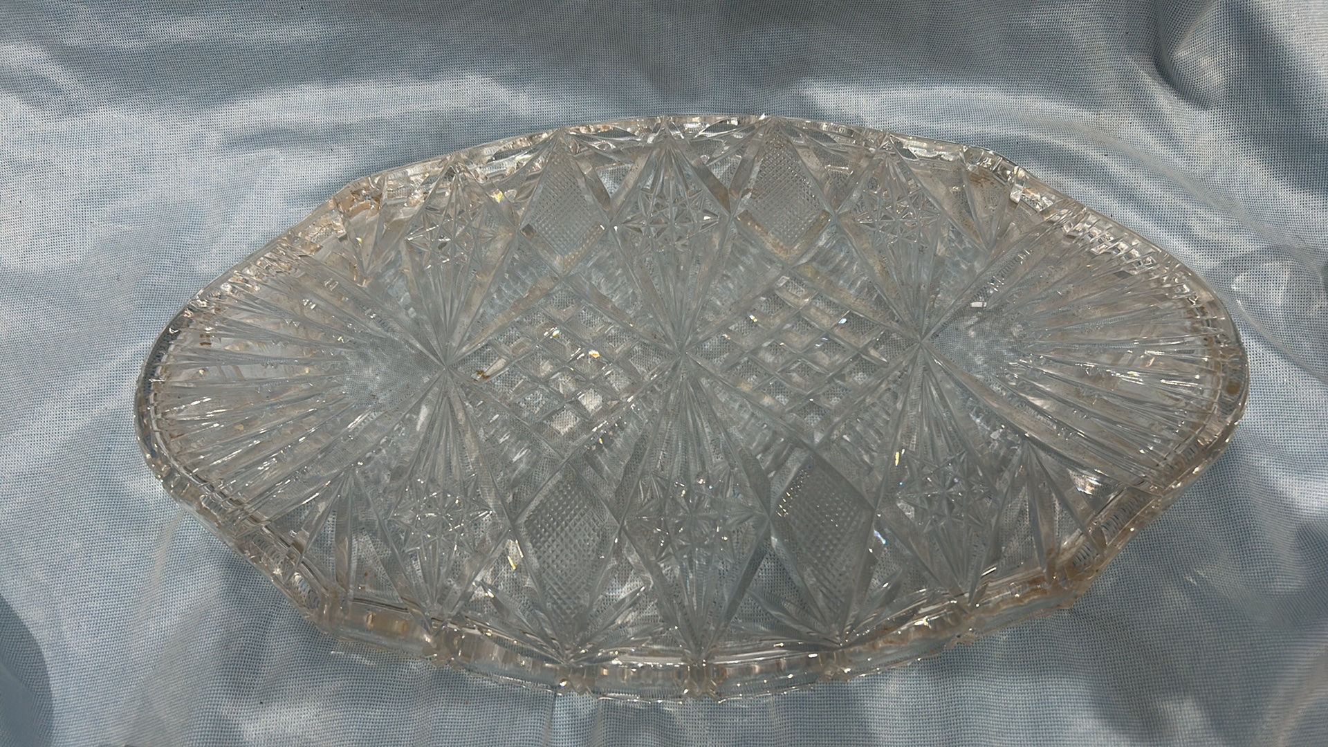 Three-piece pressed glass serving set, comprising an oval diamond-cut tray, scalloped circular bowl and small cream jug, each decorated with starburst and hobstar motifs.