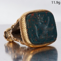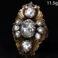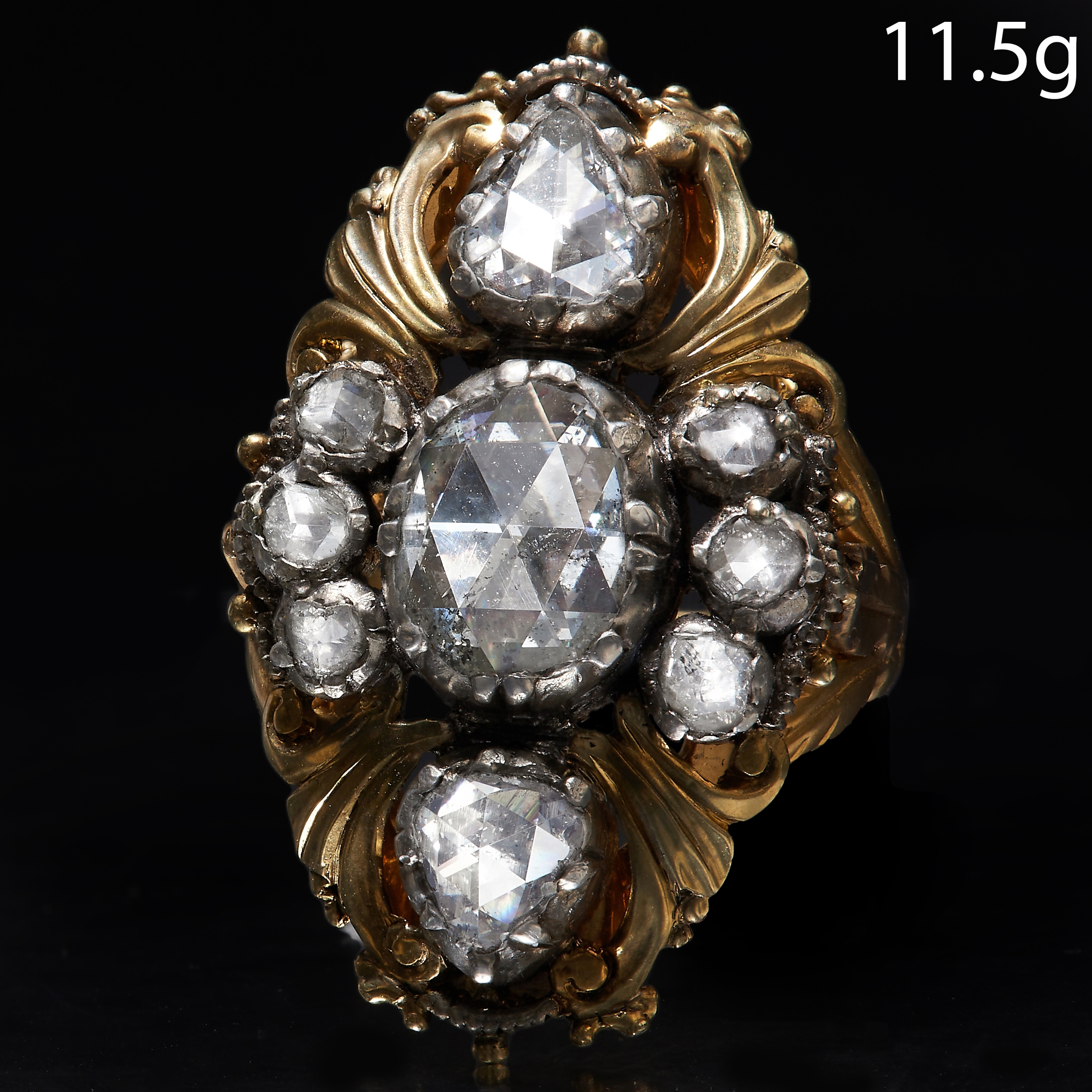 ANTIQUE DIAMOND RING, Set with a larger rose cut diamond to the center of approx. 1 ct. flanked with a rose cut diamond on each end, and 3 on each side. The ring further of part openwork scrolling design. Size P. 11.5 grams.