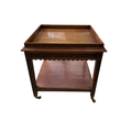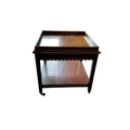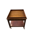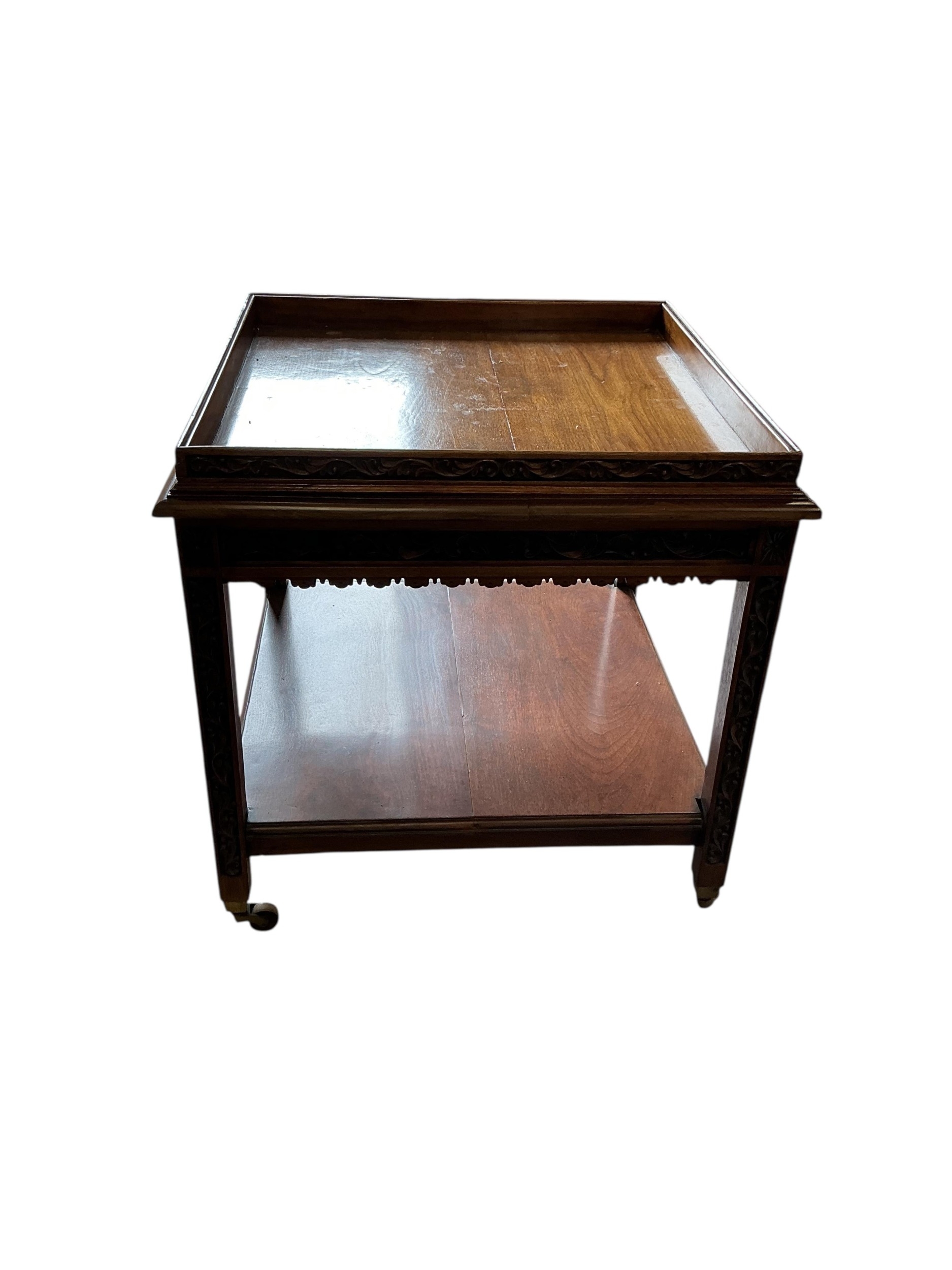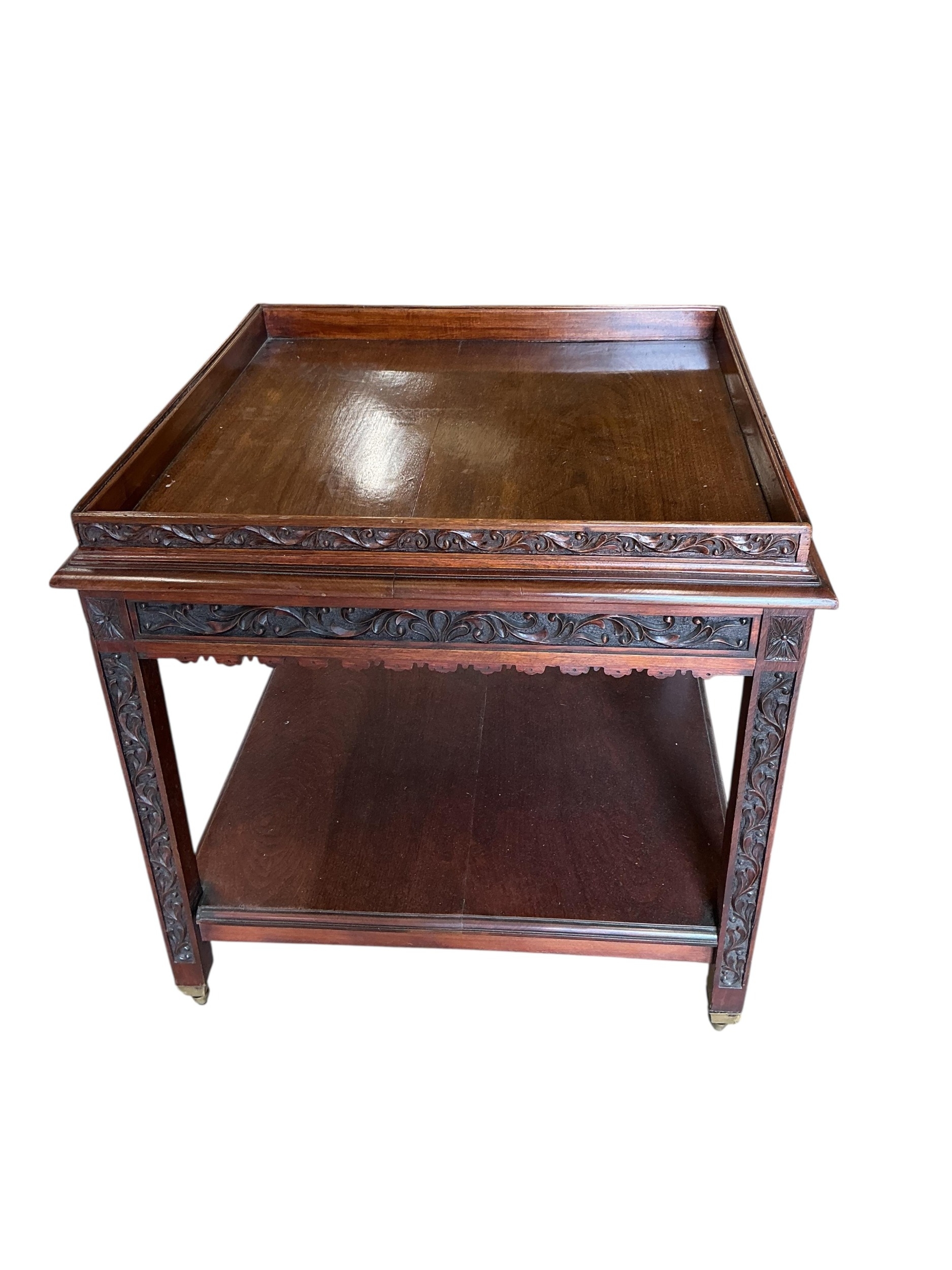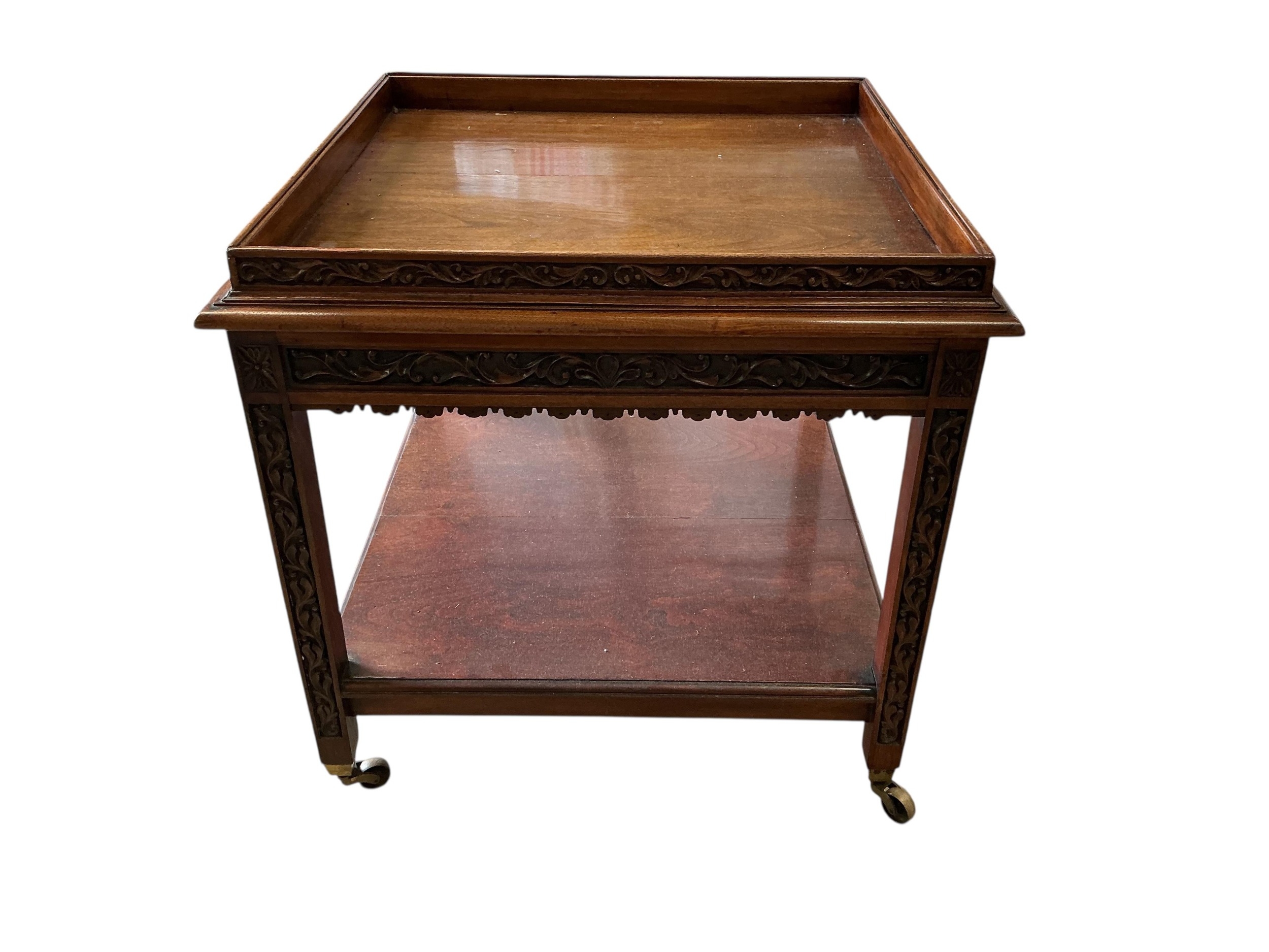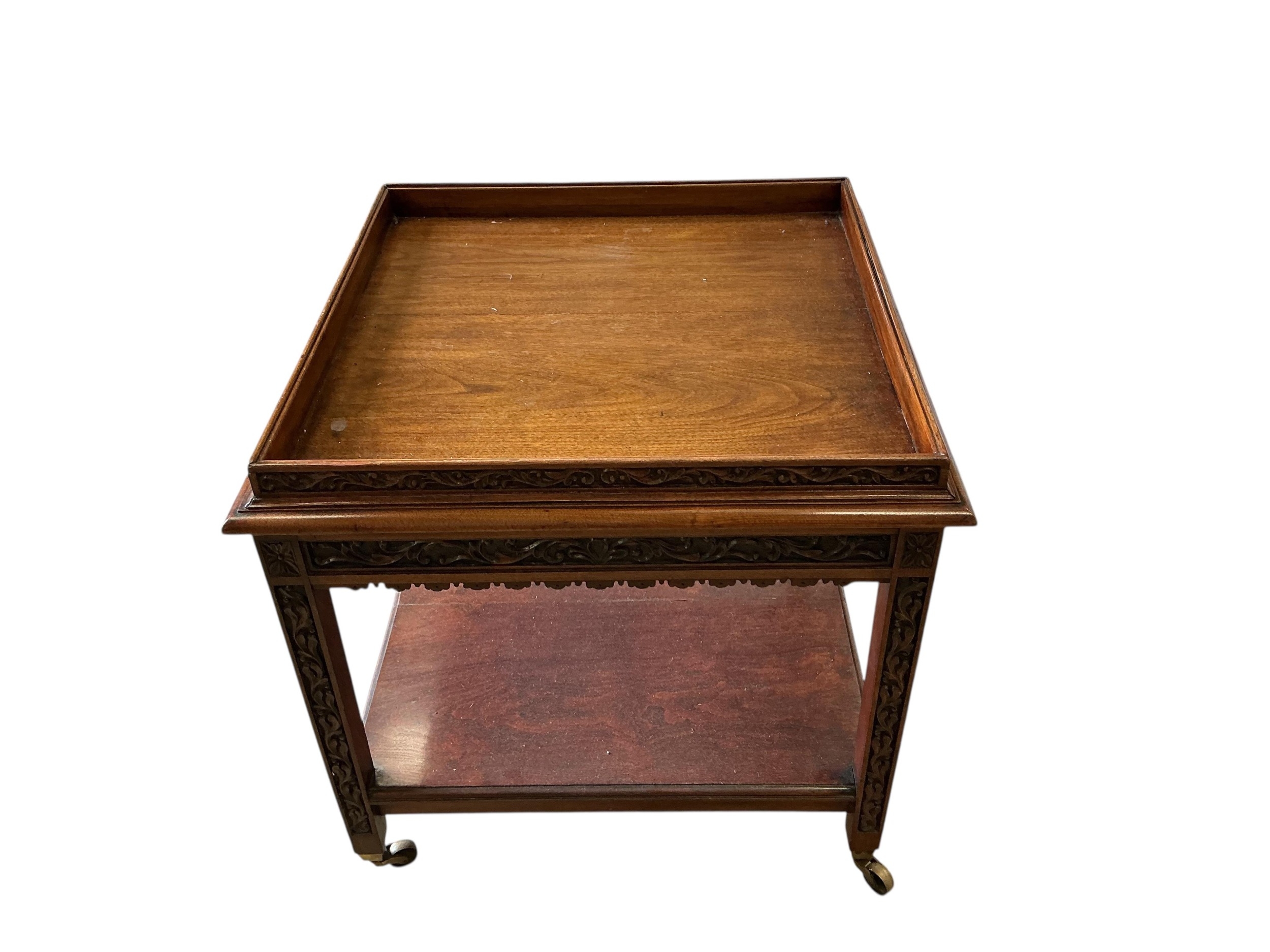 An early 20th century carved walnut square two tier occasional table, with brass caps and casters, 76cm, height 76cm