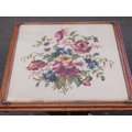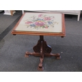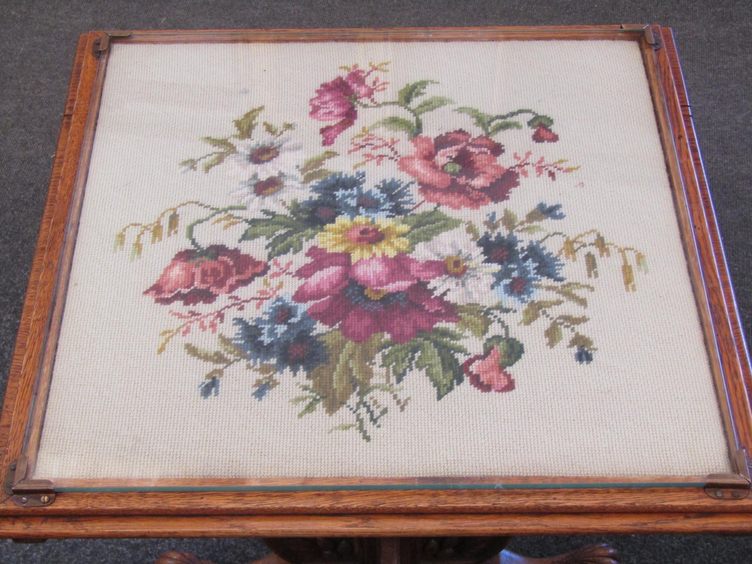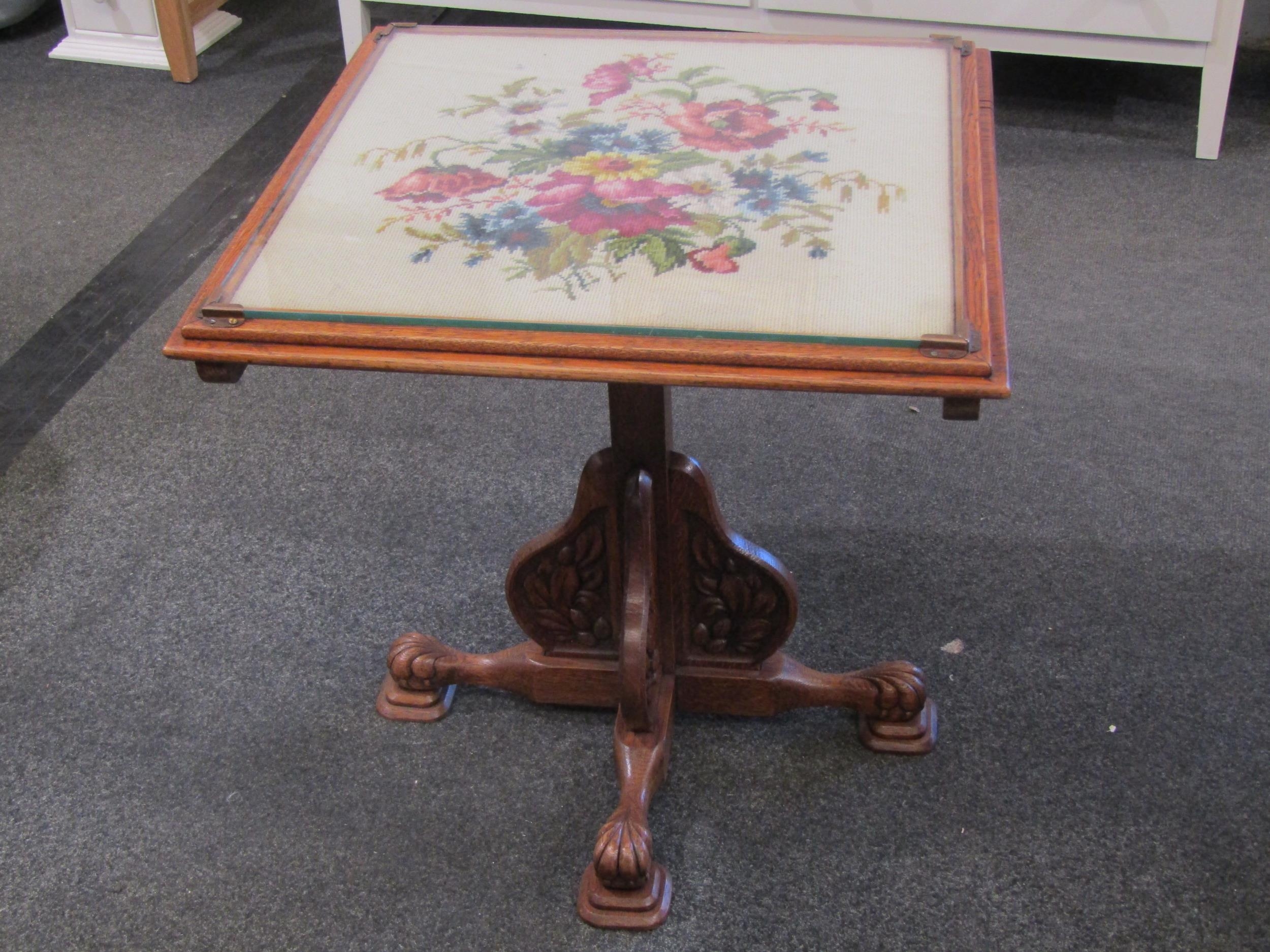 An oak tilt-top table, floral tapestry top under glass, carved legs and supports, 57cm tall x 56cm wide