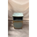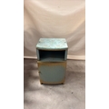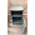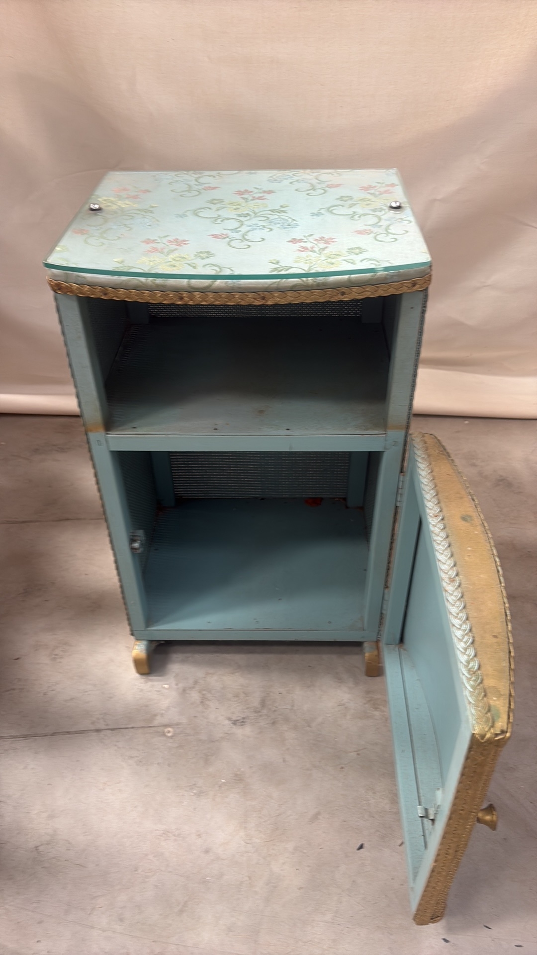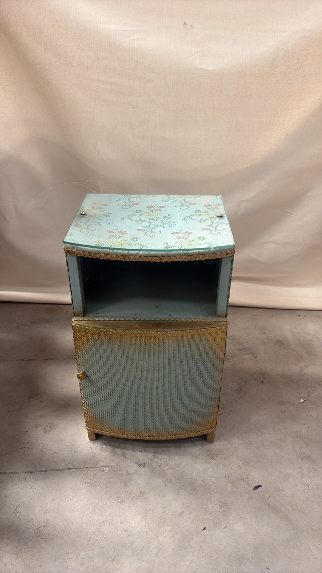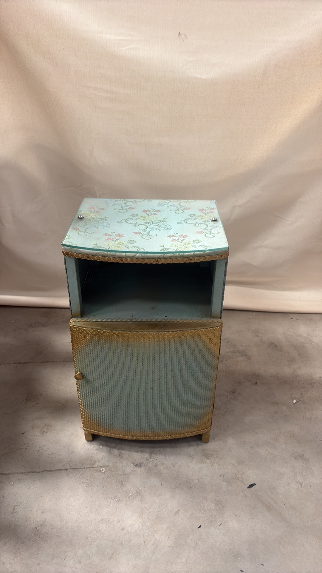 Light blue painted wood and woven wicker bedside cabinet, floral fabric top beneath glass, rope edging, open shelf over curved door, on small block feet, mid-century circa 1950s–60s.