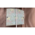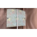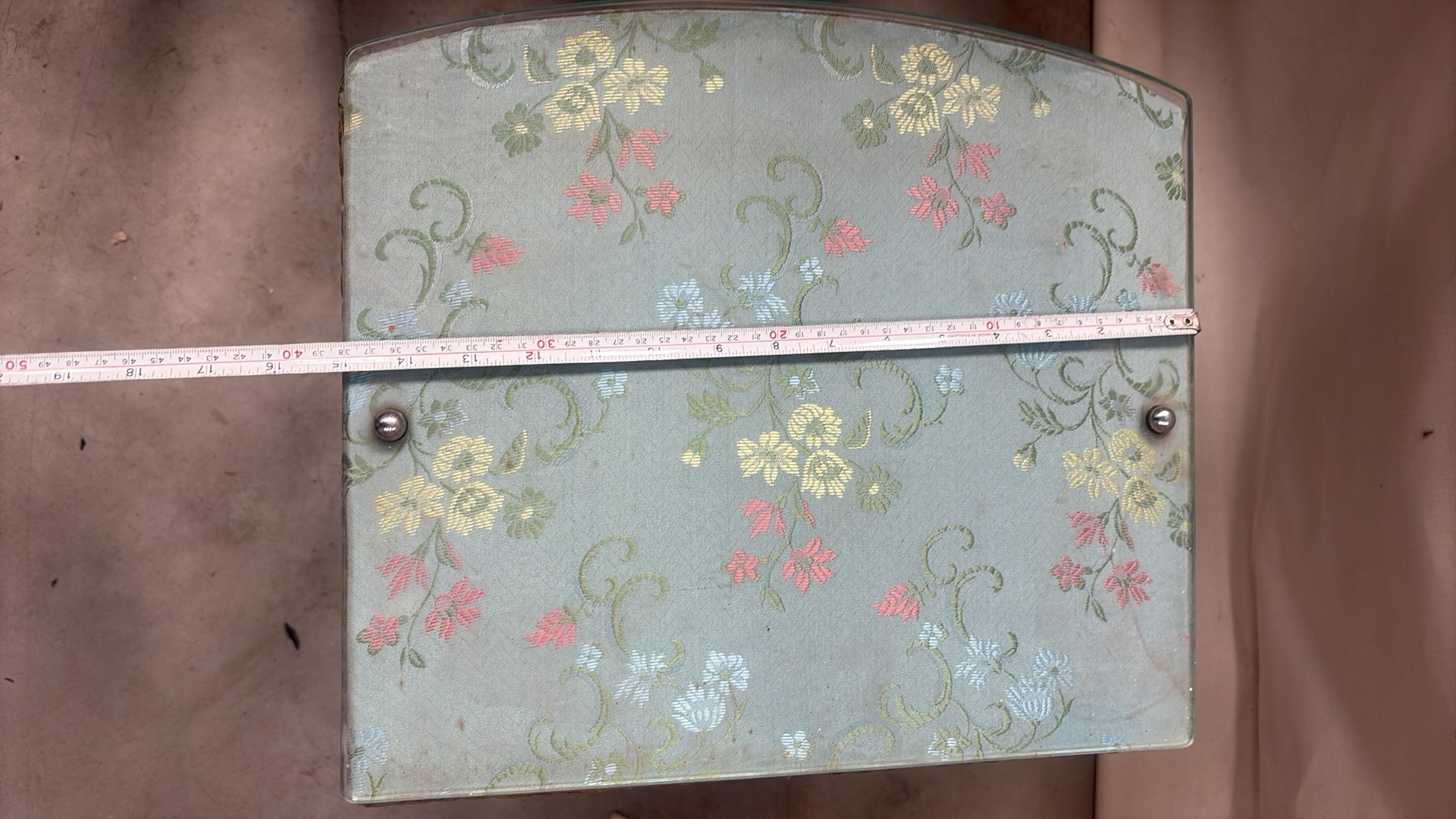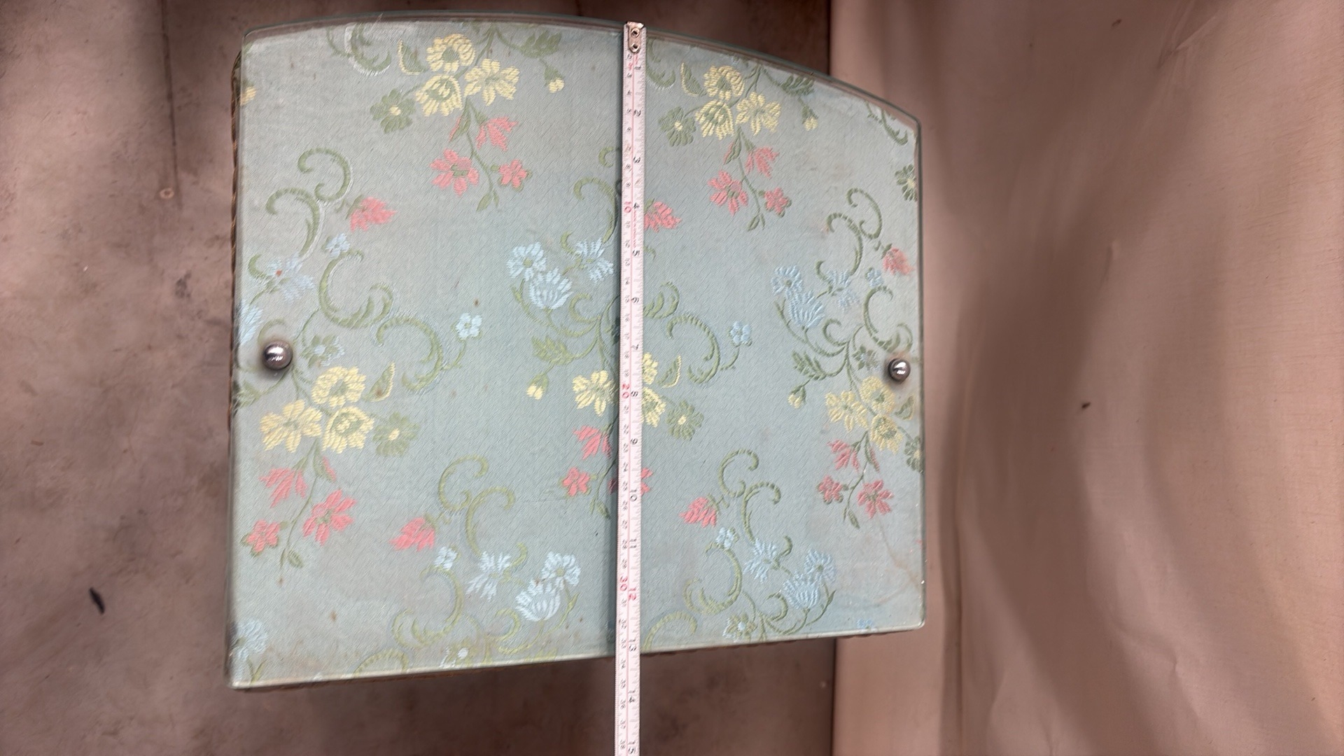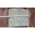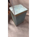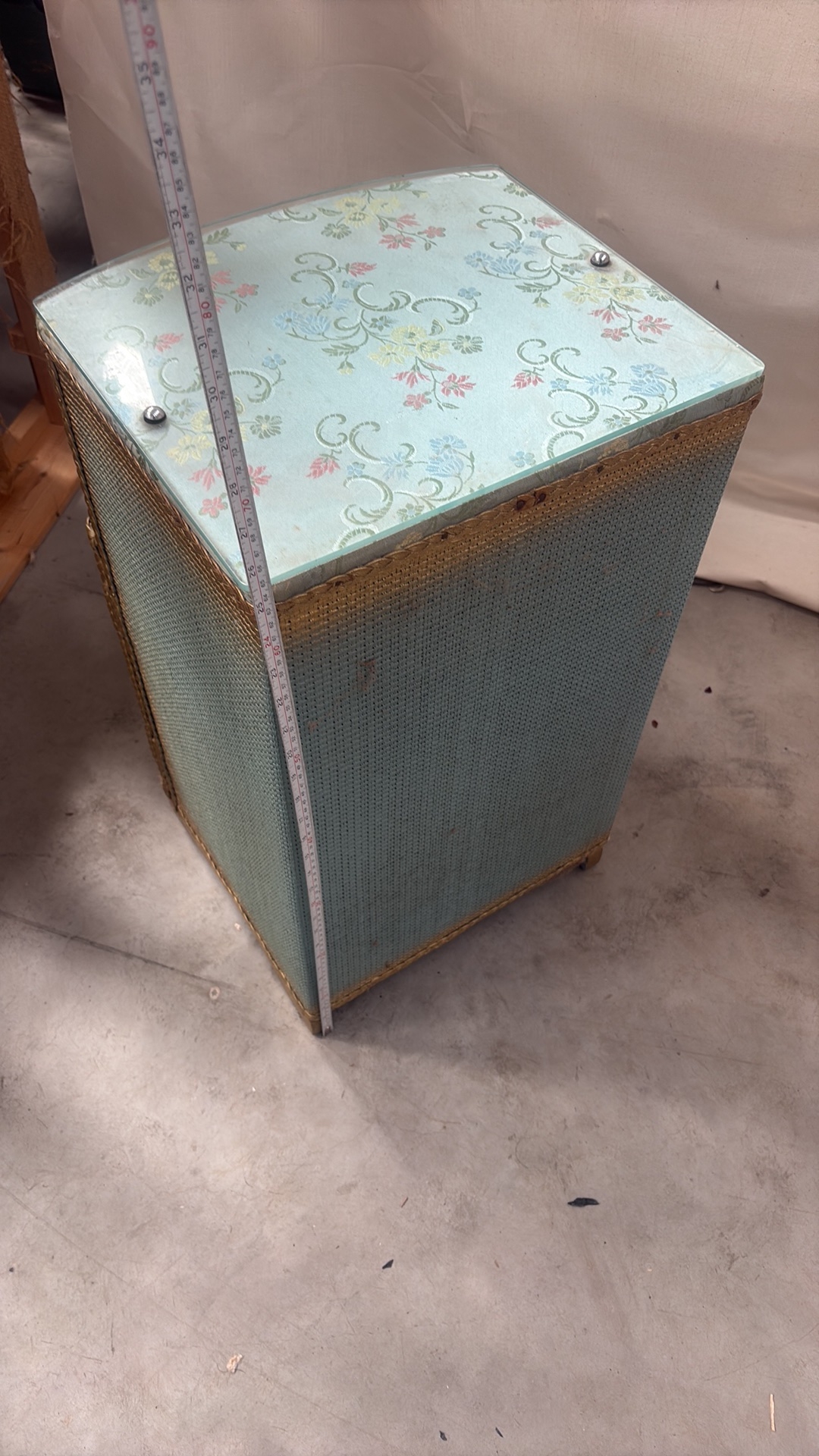 Light blue painted wood and woven wicker bedside cabinet, floral fabric top beneath glass, rope edging, open shelf over curved door, on small block feet, mid-century circa 1950s–60s.