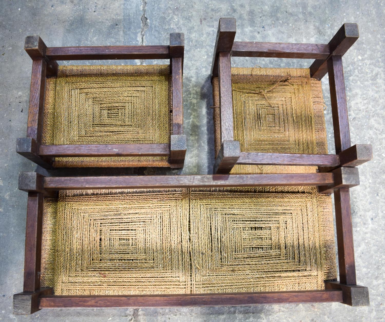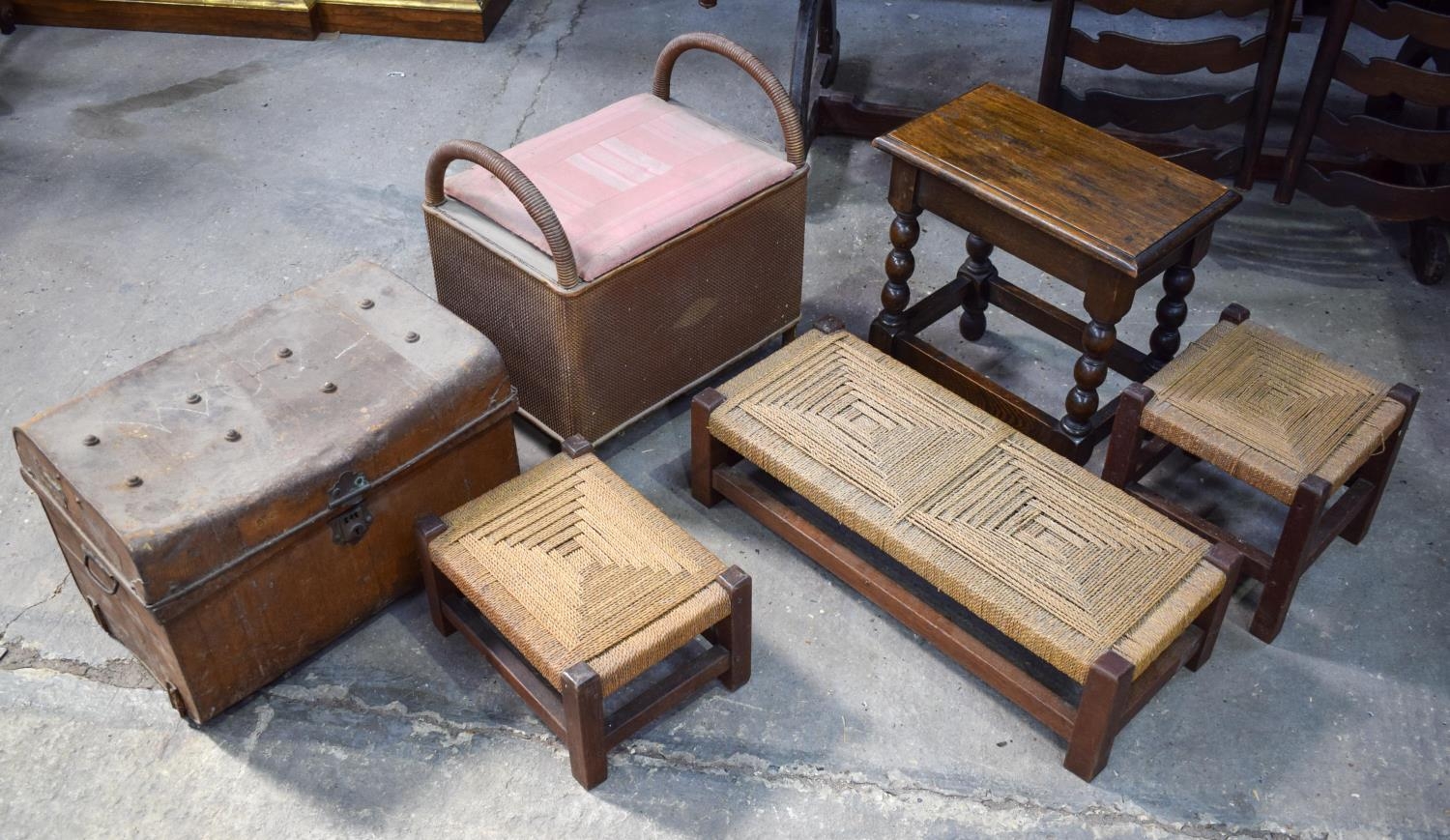 A VINTAGE TRUNK together with a Lloyd loom type seat etc. (7)