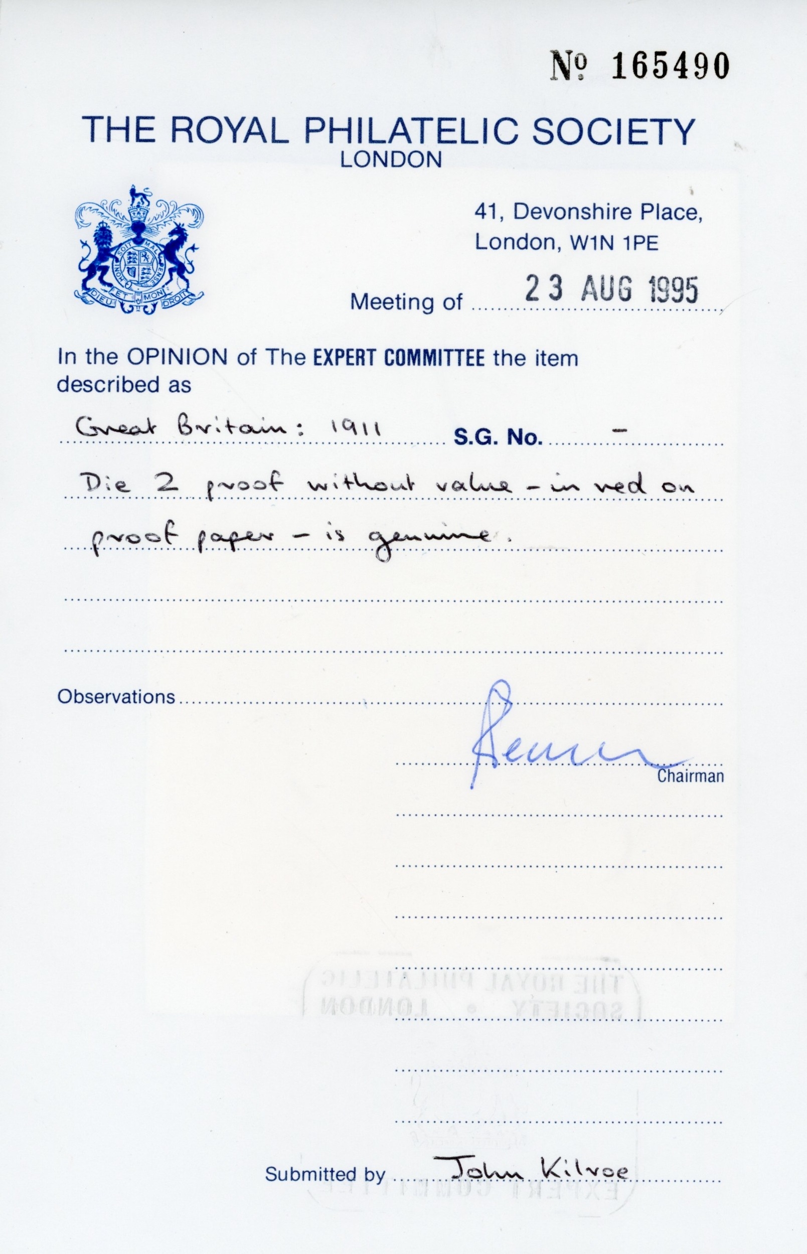GB 1911 Die Proof accepted design, without value, in deep carmine